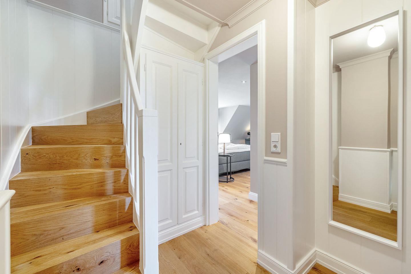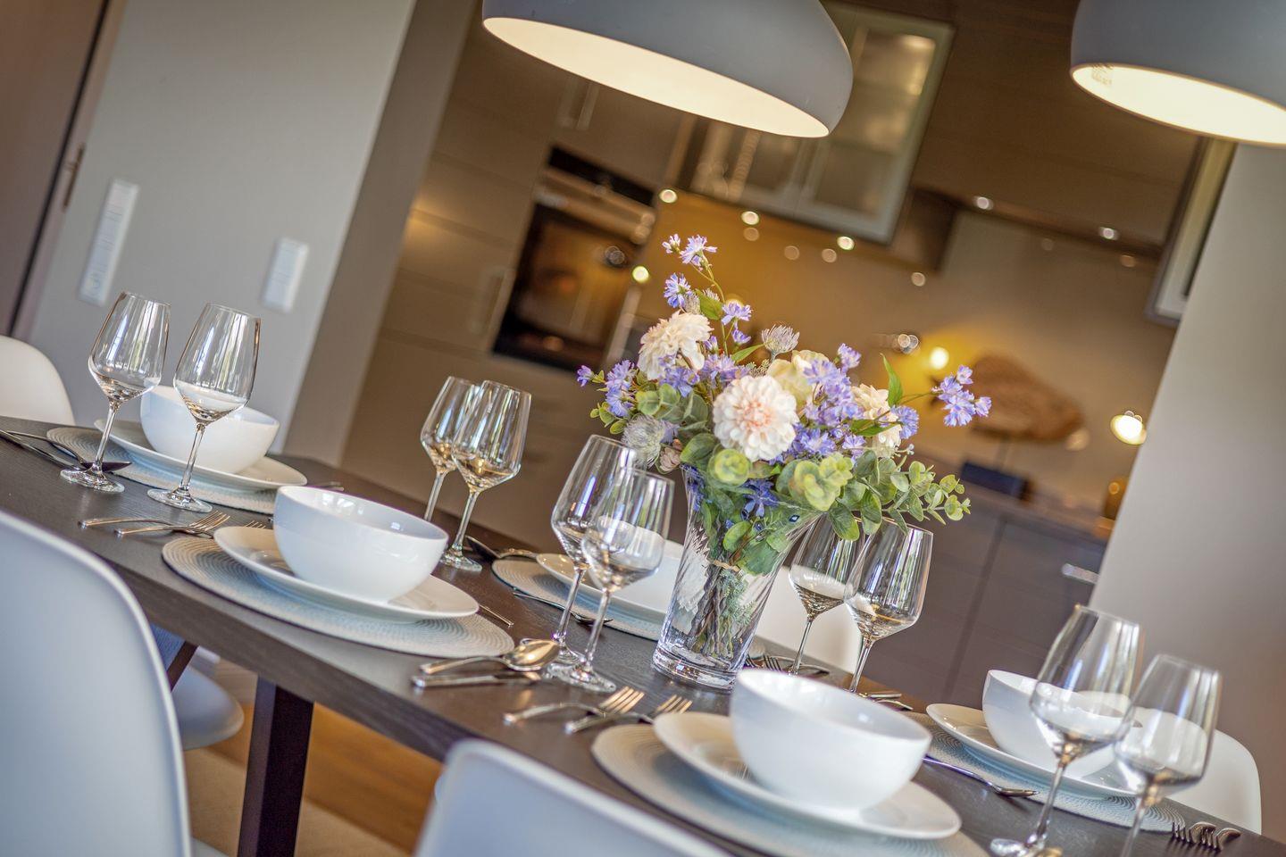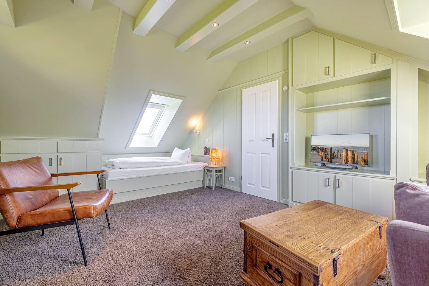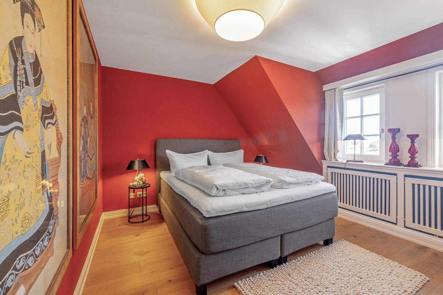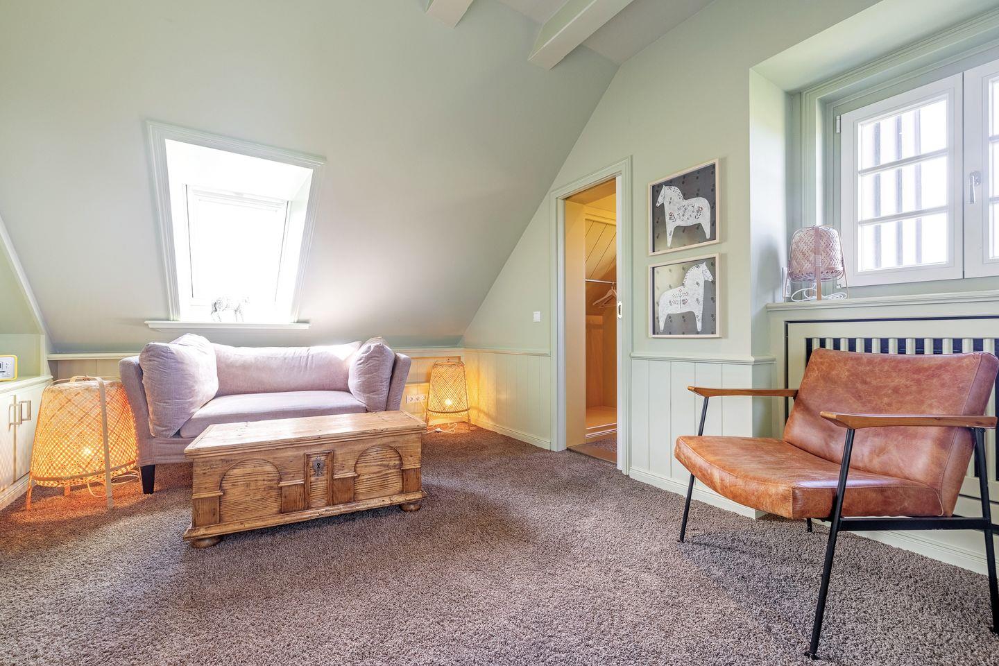 Seabiscuit ? ein echter Juwel unter den Feriendomizilen! Das charmante Endhausteil befindet sich inmitten der malerischen Tinnumer Wiesen und bietet auf ca. 120 m² Platz für insgesamt 5 Personen. Nach einer umfassenden Sanierung glänzt das Ferienhaus mit einem außergewöhnlichen Interieur und hochwertiger Ausstattung. Im Erdgeschoss erwartet Sie ein stilvoll gestalteter Wohn- und Essbereich mit einem samtig-grünen Sofaensemble, harmonisch abgestimmter Kunst und einem großzügigen Esstisch. Der angrenzende Wintergarten öffnet sich zum liebevoll angelegten Garten mit eigenem Sonnenplatz ? perfekt für entspannte Stunden im Freien. Die offene Küche in edlem Anthrazit fügt sich dezent in den Raum ein, überzeugt jedoch durch ihre erstklassige Ausstattung. Ein besonderes Highlight ist das Duschbad im Erdgeschoss, das mit seinem kräftigen Fliederton Akzente setzt. Im ersten Obergeschoss setzt sich das farbenfrohe Design fort: Eines der drei Schlafzimmer ist in warmem Kaminrot gehalten, geschmückt mit asiatischer Kunst und ausgestattet mit einem gemütlichen Boxspringbett (160 x 200 cm)m Das en suite Gäste-WC erinnert mit zartem Kirschblütendesign an fernöstliche Ästhetik. Direkt nebenan befindet sich der Masterbedroom mit einem großzügigen Boxspringbett (180 x 200 cm), begehbarem Kleiderschrank in Aubergine und einem Balkon mit herrlichem Blick ins Grüne. Das angrenzende Badezimmer en suite besticht durch seinen individuellen Look in leuchtend Rot und bietet alles für eine erfrischende Auszeit. Im ausgebauten Dachgeschoss empfängt Sie ein weiteres Schlafzimmer (160 x 200 cm) in beruhigendem Pistaziengrün. Der sonnengelbe begehbare Kleiderschrank bringt Wärme und Frische in den Raum. Hier herrscht beim Sonnenuntergang eine außergewöhnliche Atmosphäre. Abgerundet wird das Dachgeschoss durch ein kleines, fröhlich türkisfarbenes Duschbad ? ein echter Gute-Laune-Ort. Es stehen Ihnen WLAN, zwei eigene PKW-Stellplätze sowie eine Waschmaschine und ein Trockner zur Verfügung. Haustiere sind leider nicht erlaubt.