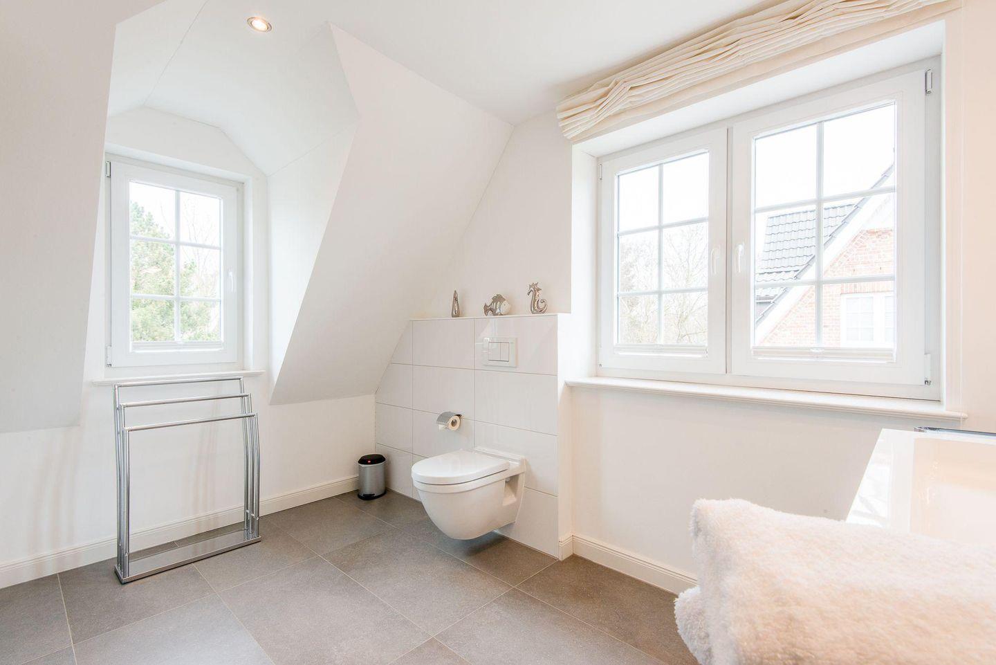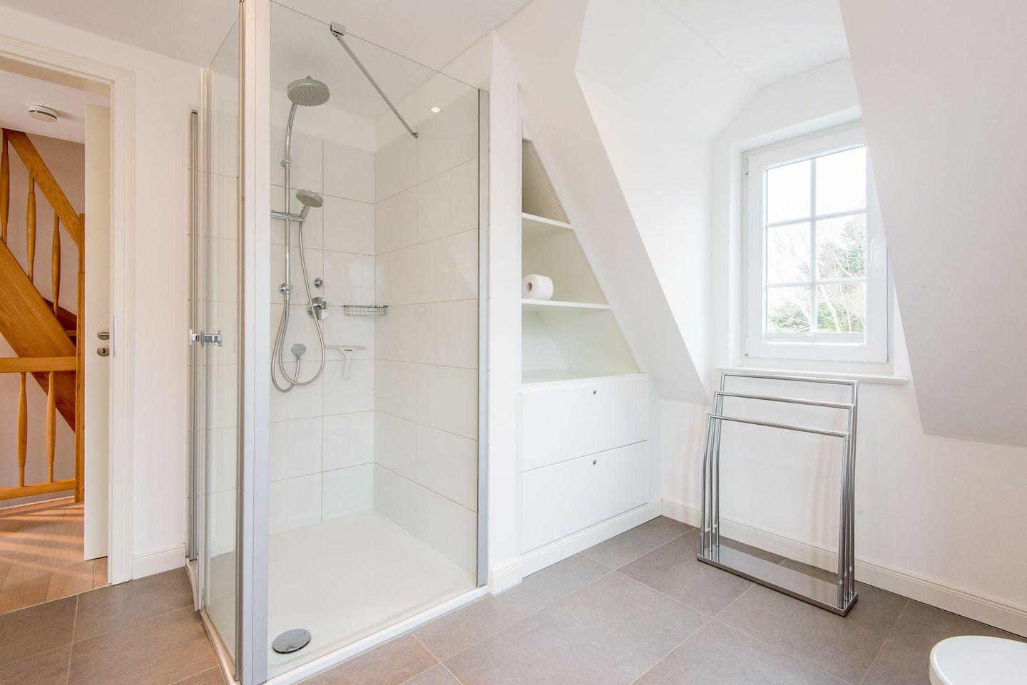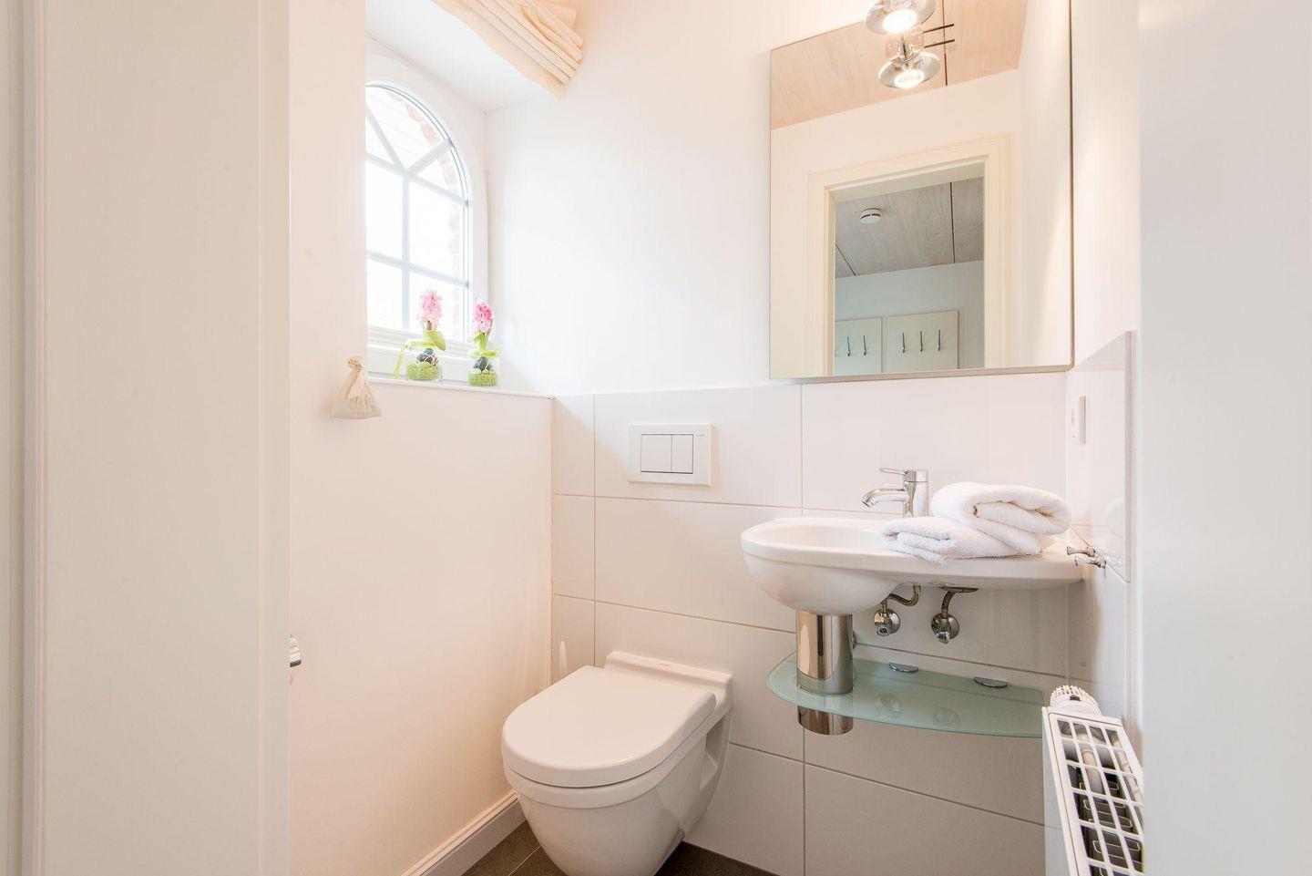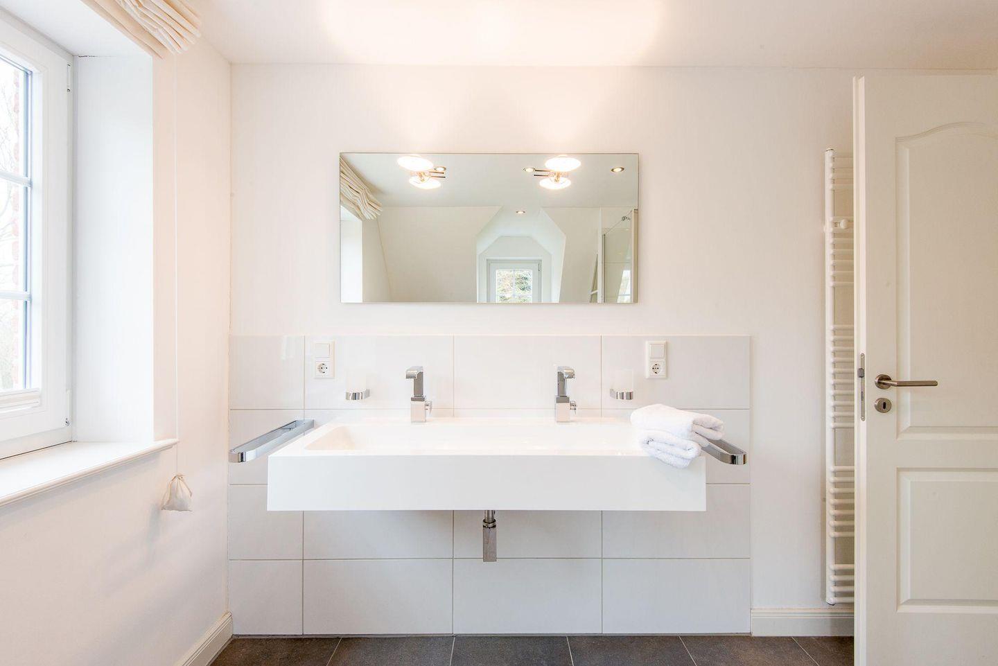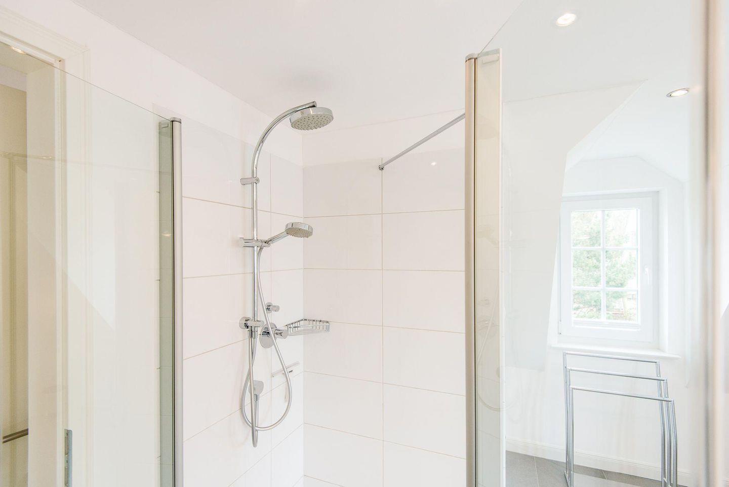 Das Badezimmer ist modern gestaltet und verfügt über eine ebenerdige Regendusche, WC, Handtuchwärmer, Föhn und Tageslicht. Im Eingangsbereich befindet sich ein Flur mit Garderobe und Gäste-WC. Eine Wäschekammer mit Waschmaschine und Trockner ist ebenfalls vorhanden.