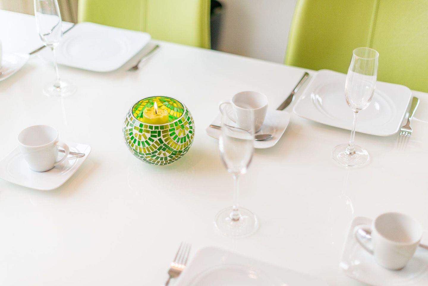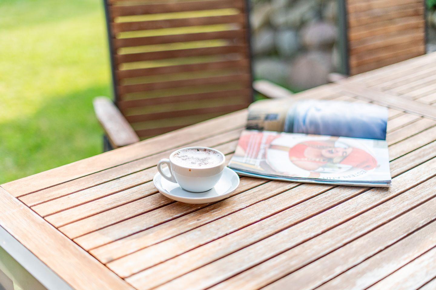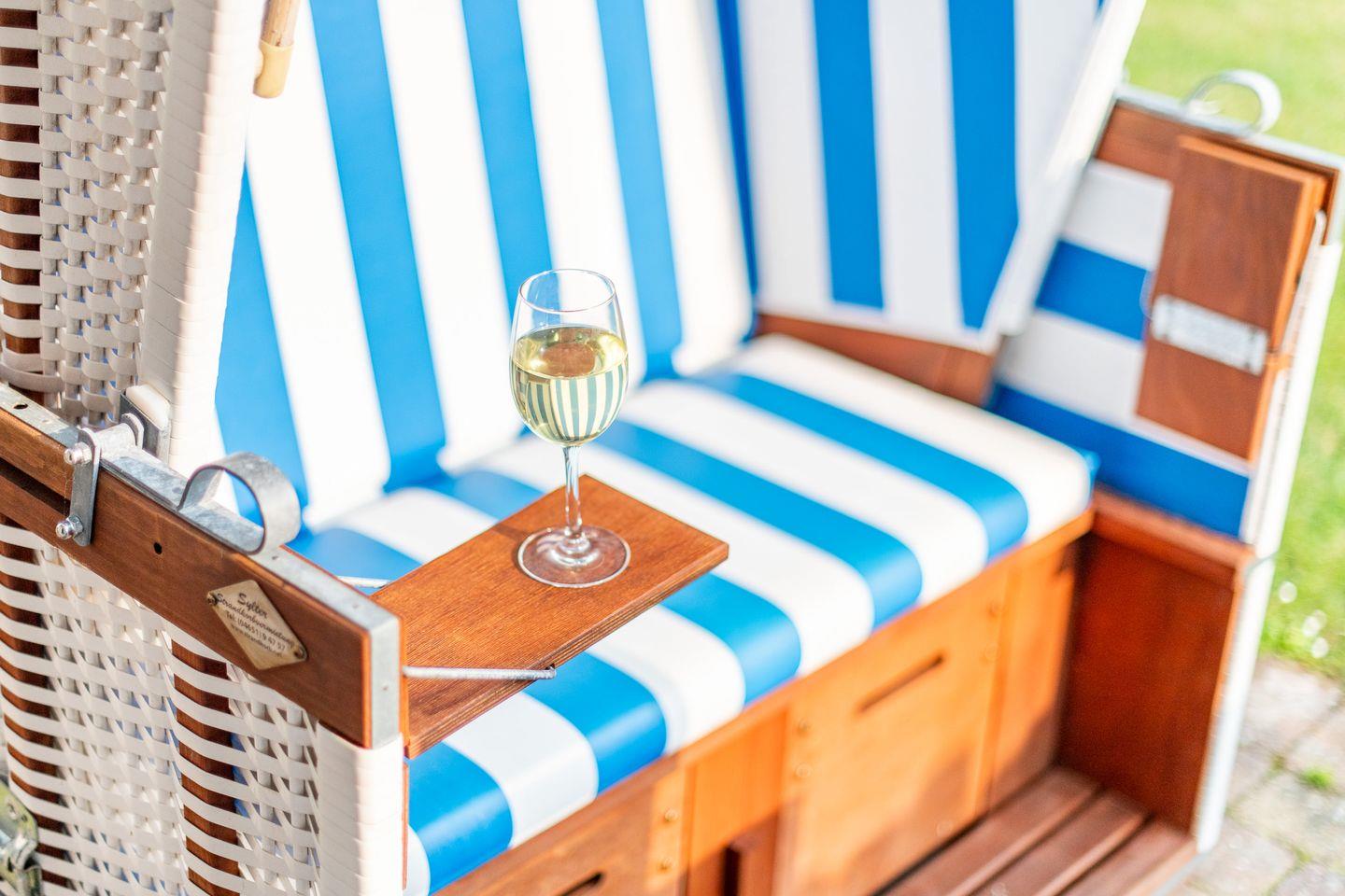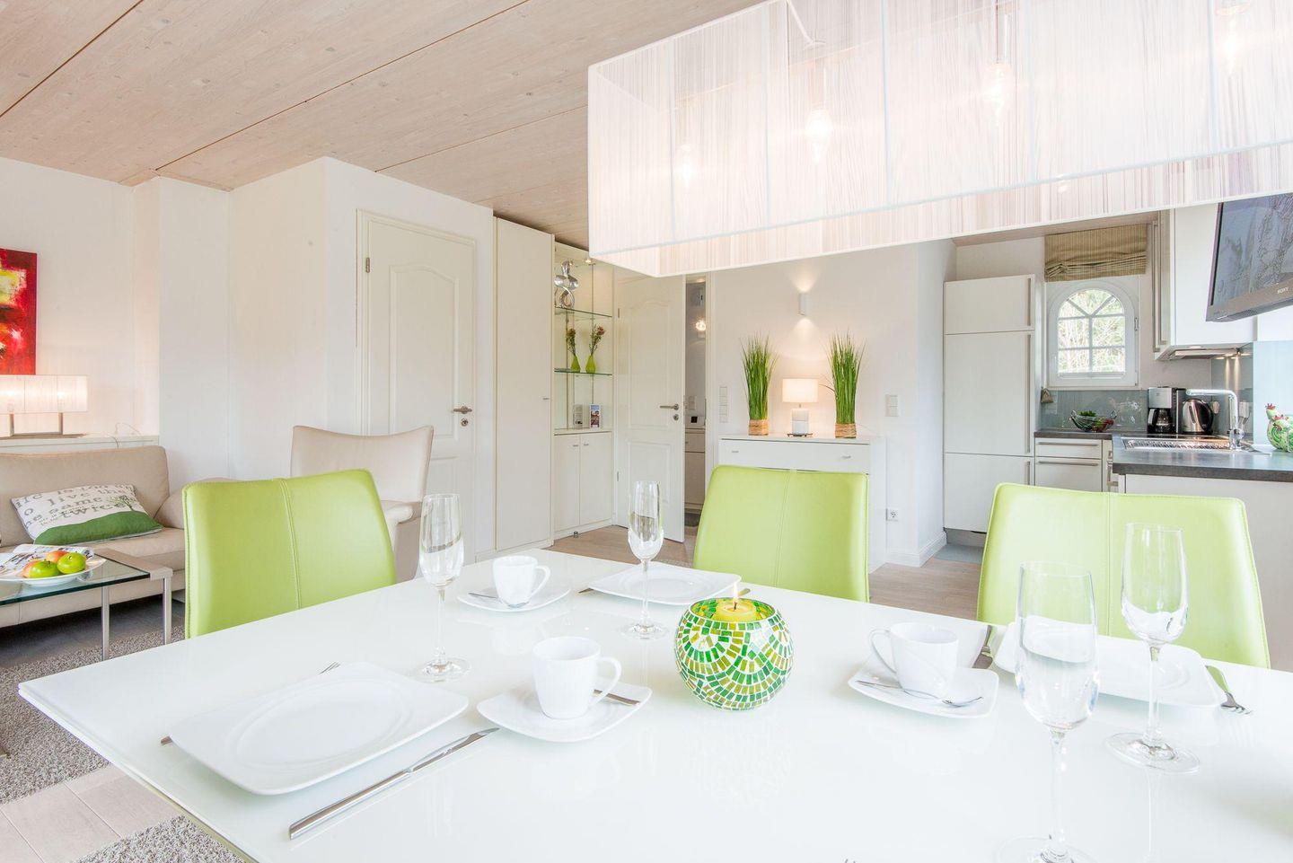 Das helle Wohnzimmer ist mit einem großen Ecksofa, einem Sessel, einem Esstisch für 5 Personen und einem TV ausgestattet. Vom Wohnzimmer haben Sie direkten Zugang zur möblierten Süd-Terrasse und zum gepflegten Garten mit Strandkorb – ideal für sonnige Nachmittage im Freien.