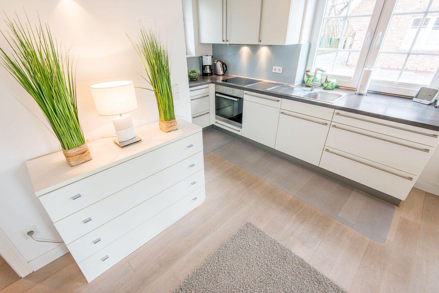 Die offene Küche ist modern eingerichtet und bietet alles, was Sie für Ihre Mahlzeiten benötigen, einschließlich eines 4-flammigen Herdes und eines Geschirrspülers.