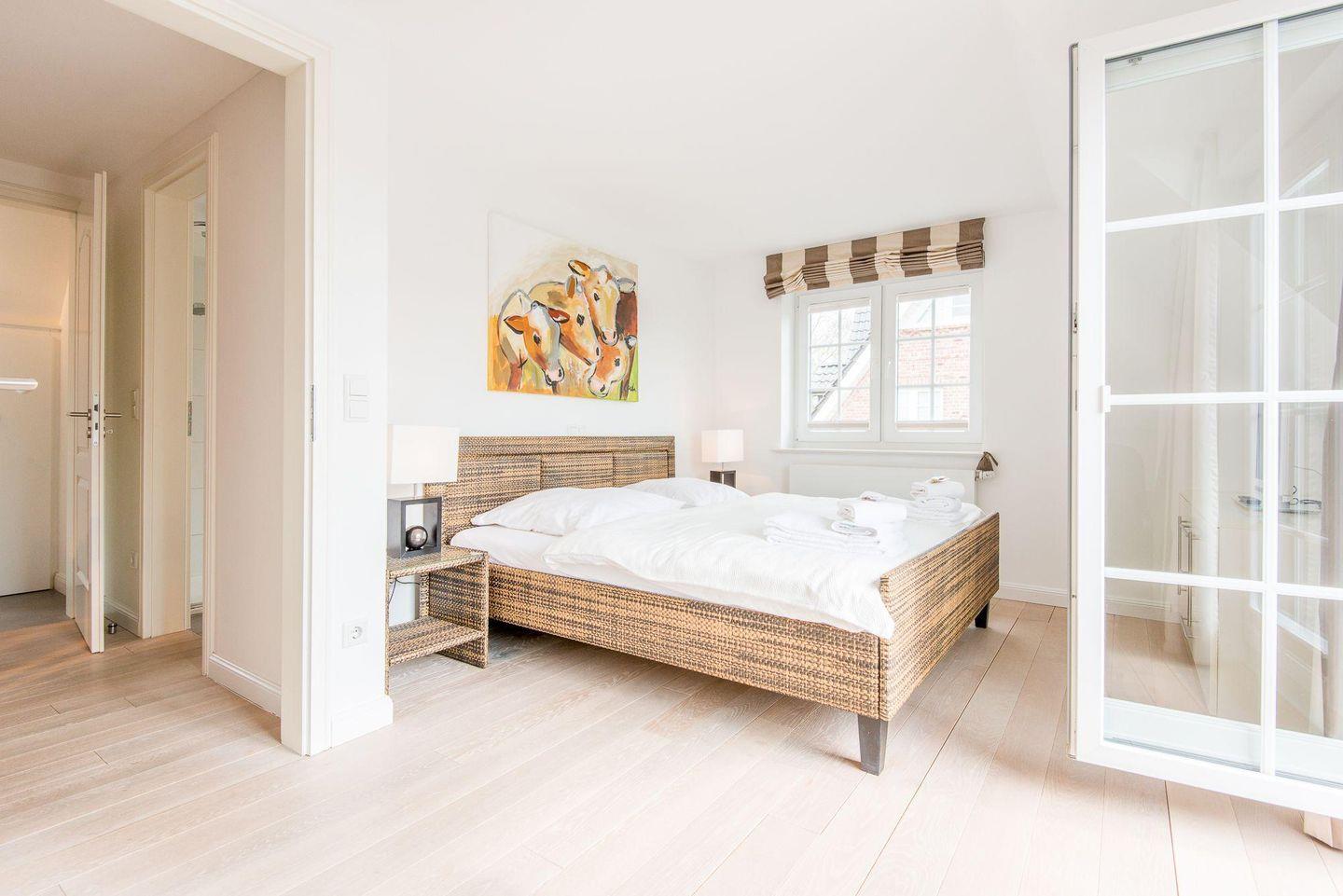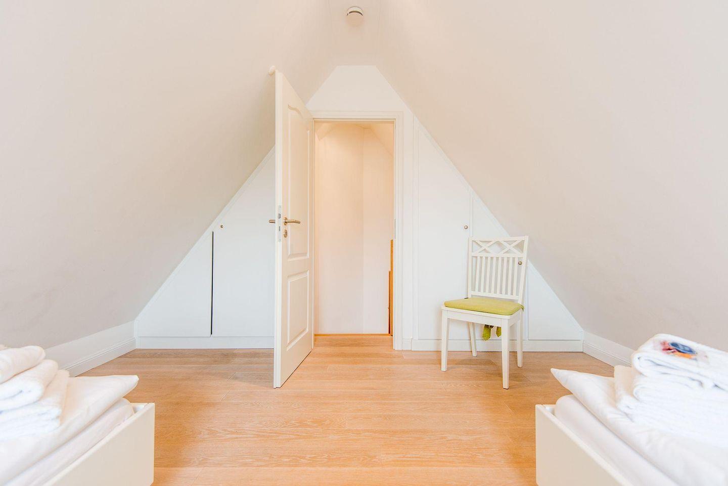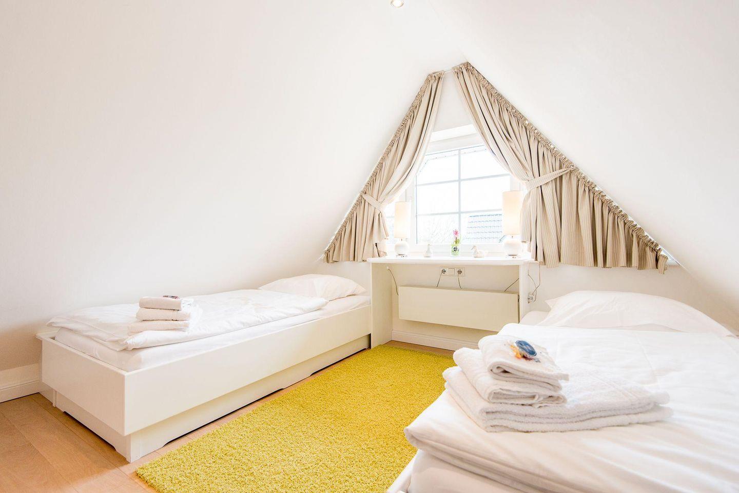 Das erste Schlafzimmer verfügt über ein Doppelbett (2x 90x200 cm), einen Einbauschrank, TV und direkten Zugang zum möblierten Balkon nach Süden. Das zweite Schlafzimmer ist mit zwei Einzelbetten (je 100x200 cm), einem Einbaueckschrank, einem Schreibtisch und einem Stuhl ausgestattet, ideal für Familien oder Freunde.