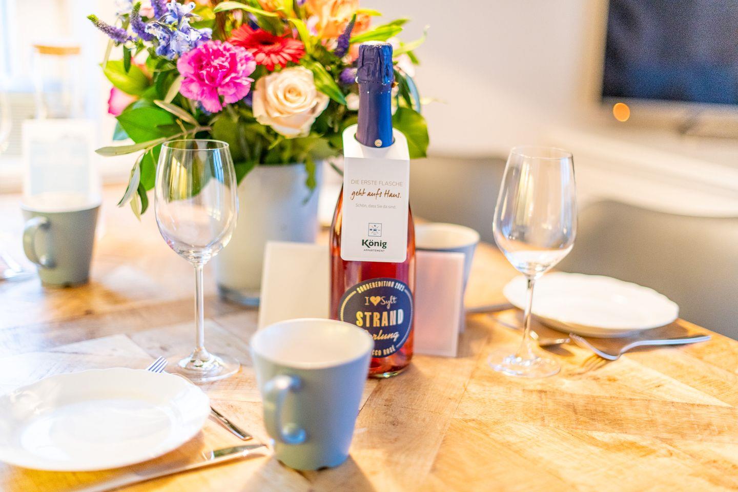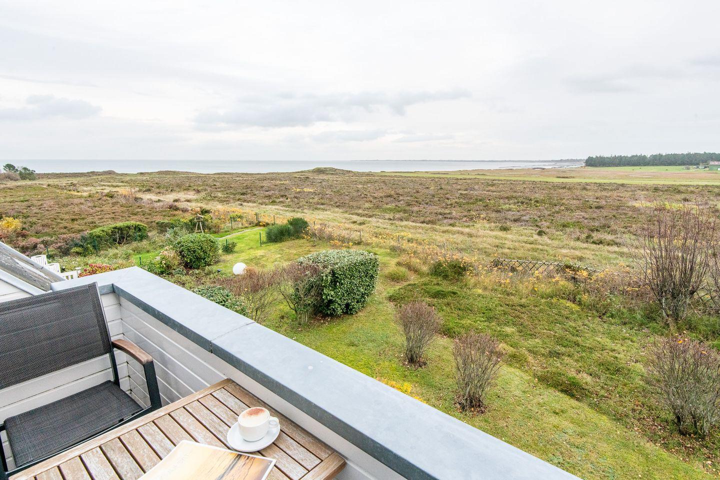 Das helle Wohnzimmer ist mit einem großzügigen Sofa, TV und einem Esstisch für 4 Personen ausgestattet. Der direkte Zugang zum Süd-Balkon erlaubt Ihnen, die frische Nordseeluft und den traumhaften Ausblick über das Wattenmeer bis nach Keitum zu genießen – der perfekte Ort für entspannte Stunden unter freiem Himmel.
