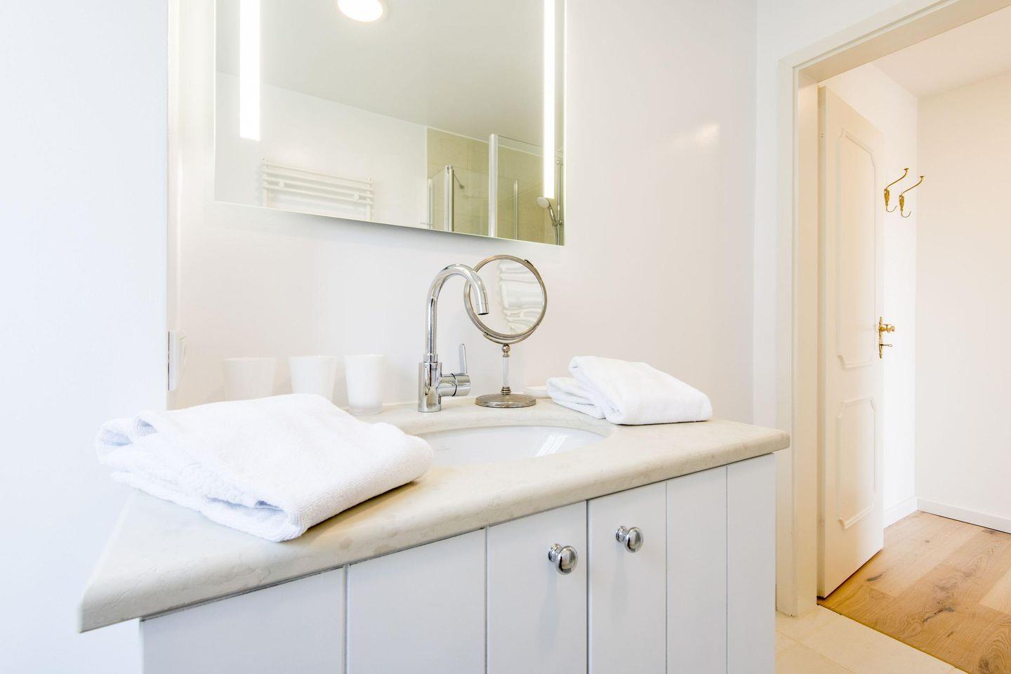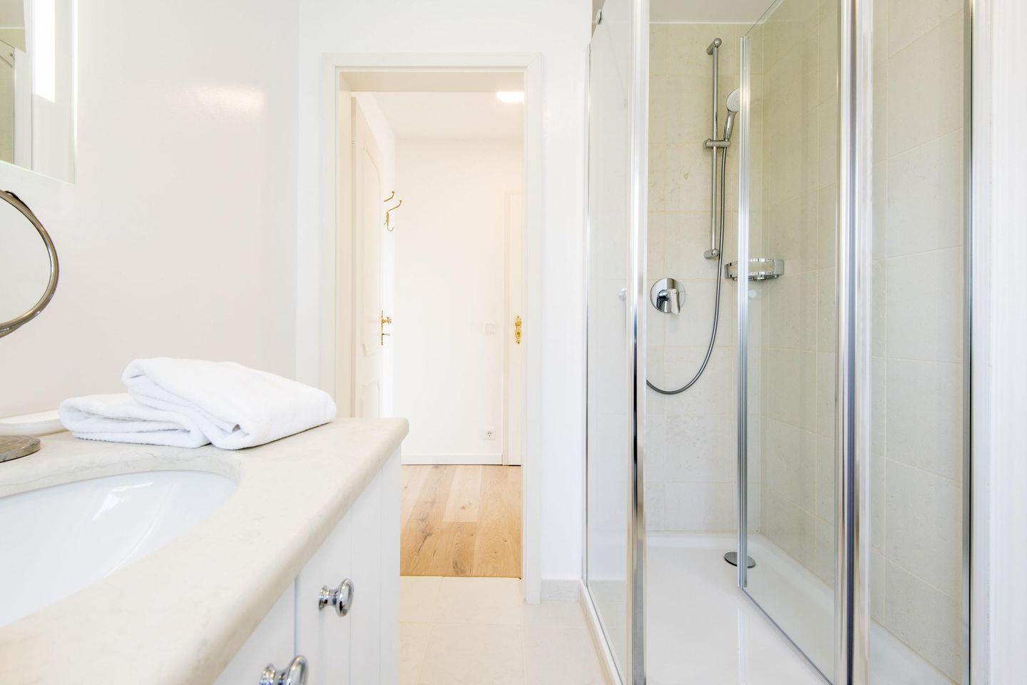 Das stilvolle Badezimmer ist mit Natursteinfliesen gestaltet und verfügt über eine bodengleiche Dusche, WC und Tageslicht. Ein Ort zum Frischmachen und Entspannen – perfekt, um den Tag angenehm zu beginnen oder entspannt ausklingen zu lassen.