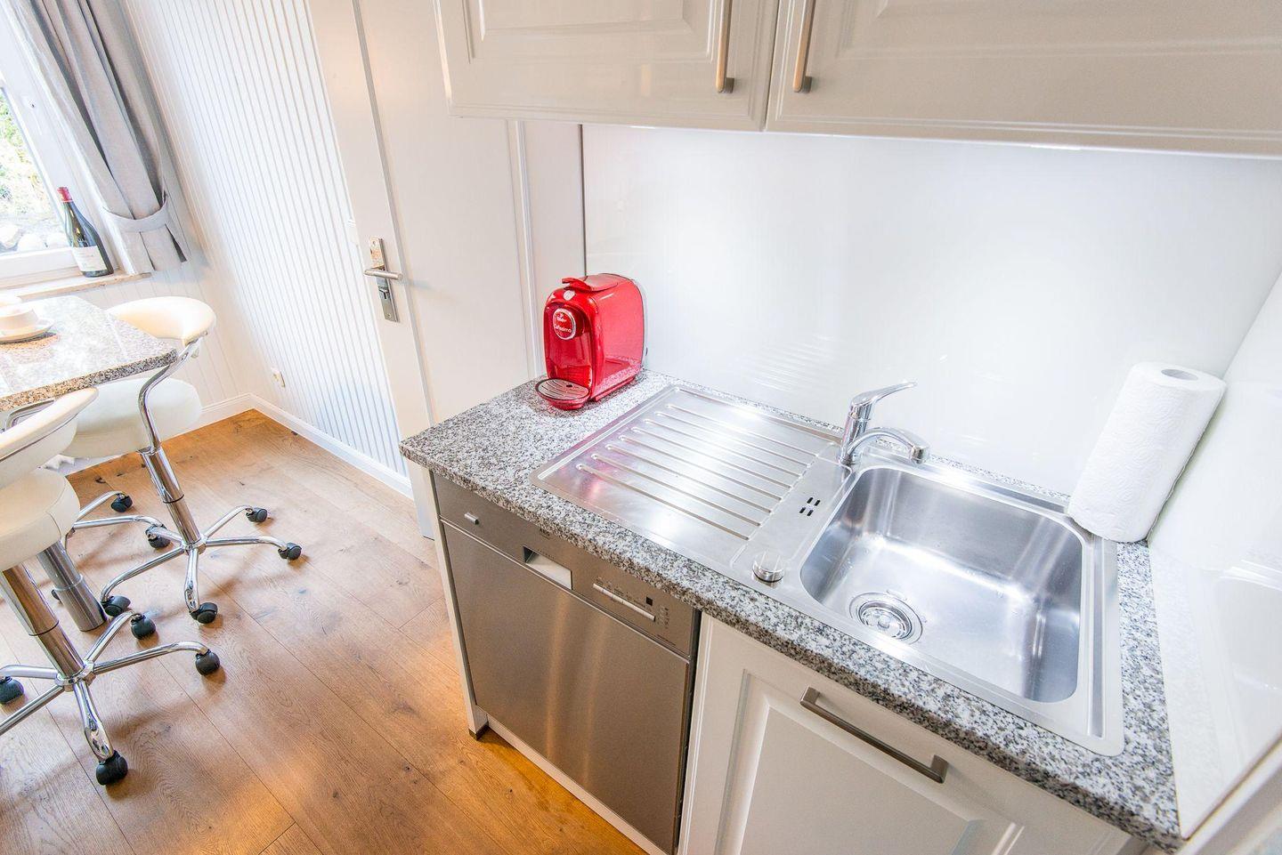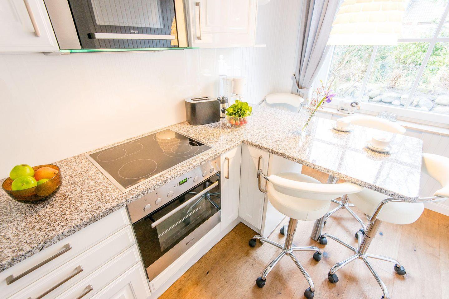 Die separate Küche ist modern ausgestattet und bietet jeglichen Komfort: hochwertige Granit-Arbeitsflächen, Cerankochfeld, Mikrowelle, Backofen, Nespresso-Kapselmaschine und Smoothie-Mixer. Hier finden Sie alles, um mit Freude leckere Mahlzeiten zuzubereiten und kulinarische Erlebnisse zu teilen.