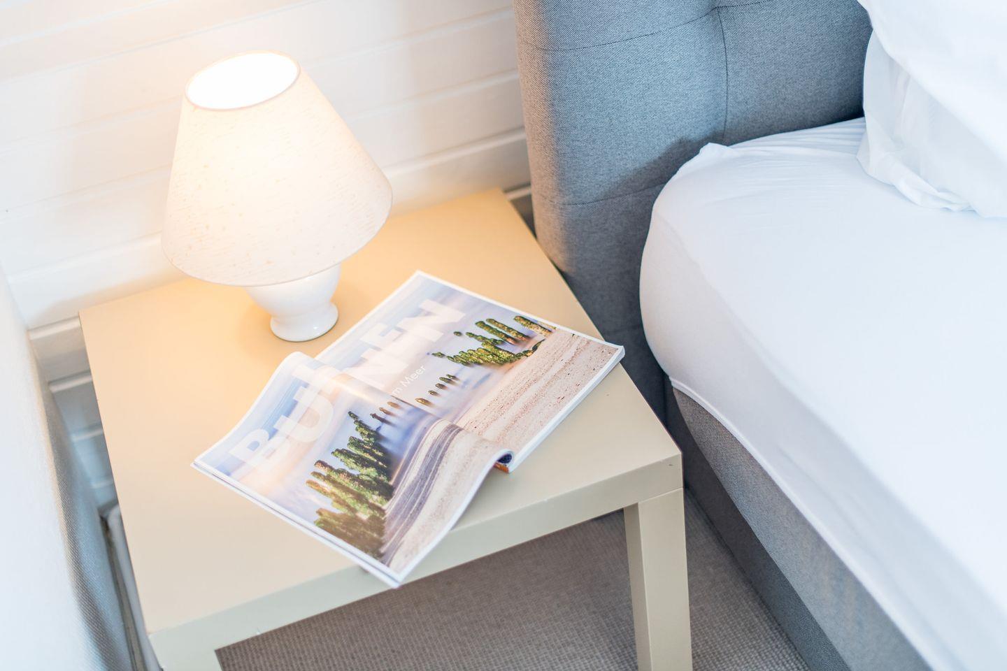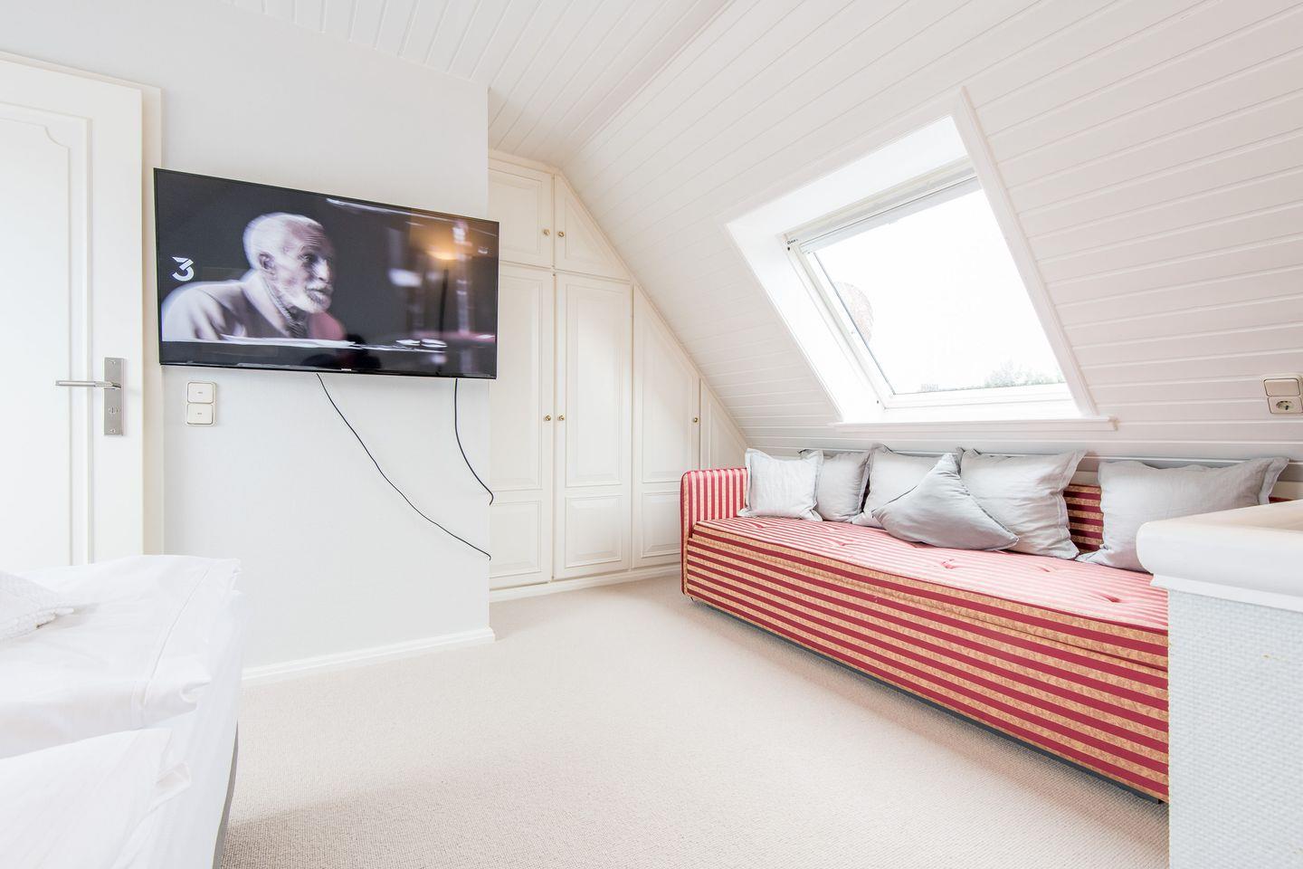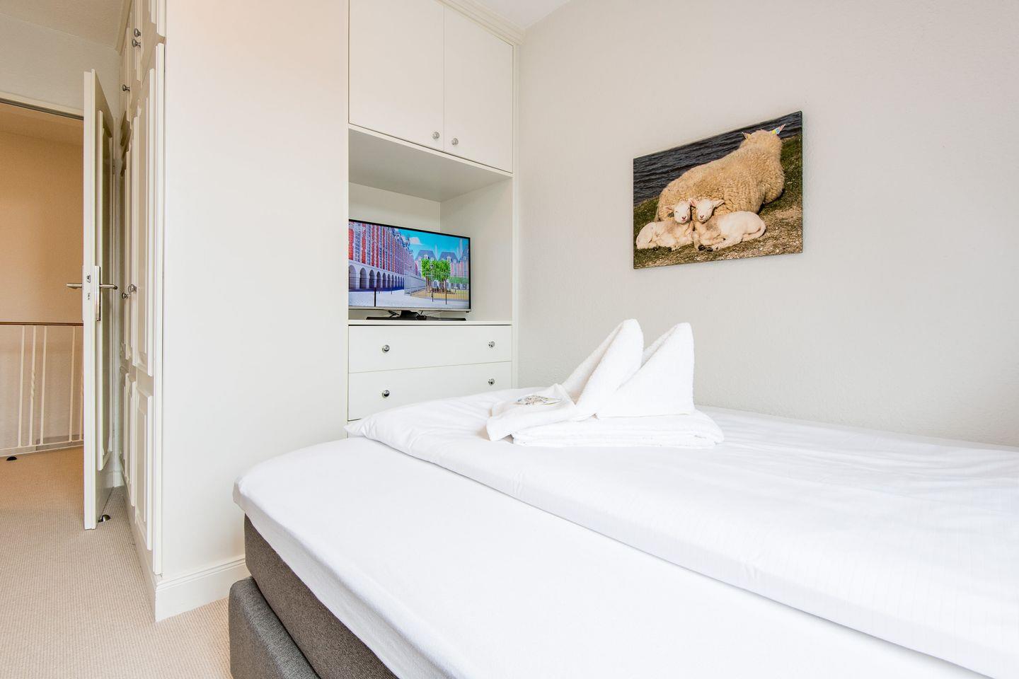 Vier einladende Schlafzimmer, die auf die oberen Etagen verteilt sind und erholsamen Schlafkomfort bieten. Zwei Schlafzimmer sind mit komfortablen Doppelbetten (je 180x200 cm) ausgestattet, haben jeweils ein eigenes TV und Einbauschränke für ausreichend Stauraum. Ein drittes Schlafzimmer verfügt über ein breites Einzel- bzw. Doppelbett (140x200 cm), ebenfalls mit TV und einem praktischen Einbauschrank. Das vierte Schlafzimmer bietet ein gemütliches Einzelbett (90x200 cm) und ist ebenfalls mit einem Einbauschrank versehen – ideal für zusätzlichen Komfort und viel Stauraum.