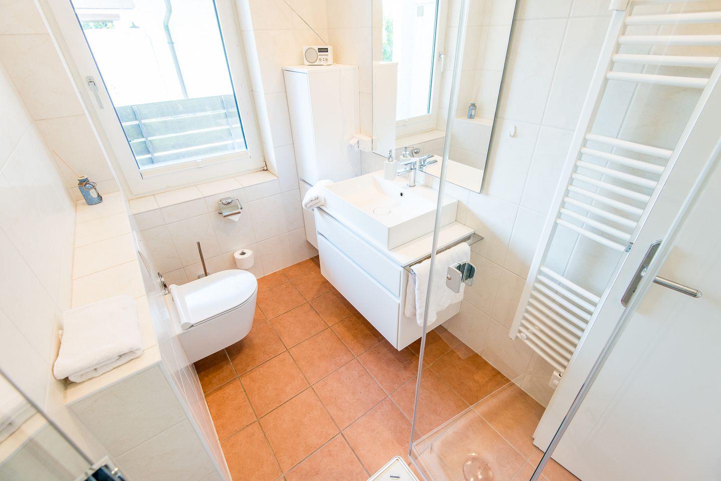 Das Badezimmer überzeugt mit einer geräumigen Dusche, einem großen Spiegel und einem Handtuchheizkörper. Hier können Sie den Tag entspannt beginnen oder nach einem Strandtag abschließen.