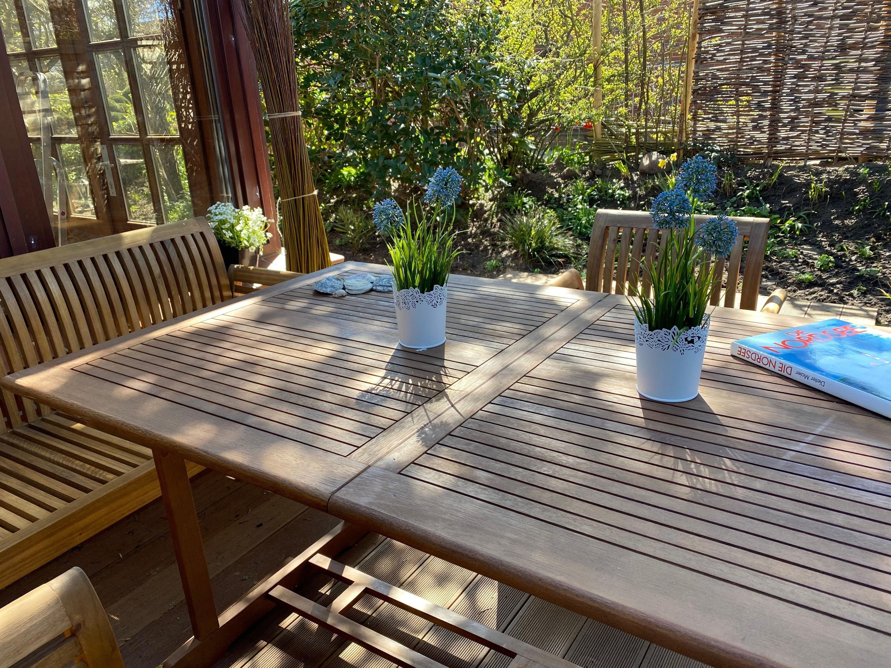 Zur Wohnung gehört eine Terrasse mit Möbeln.