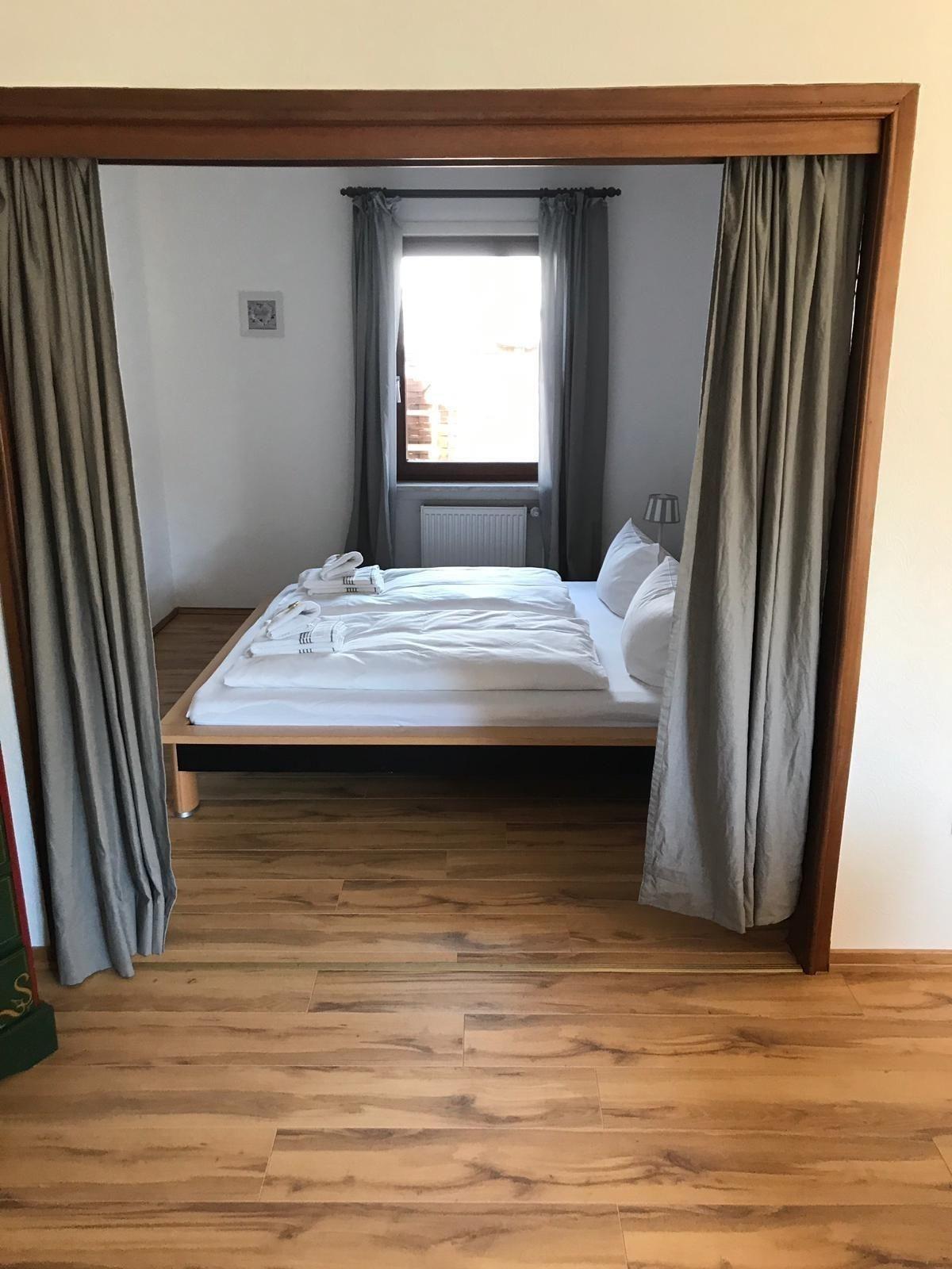 Das kleine Schlafzimmer ist mit einem Vorhang vom Wohnraum abgetrennt.