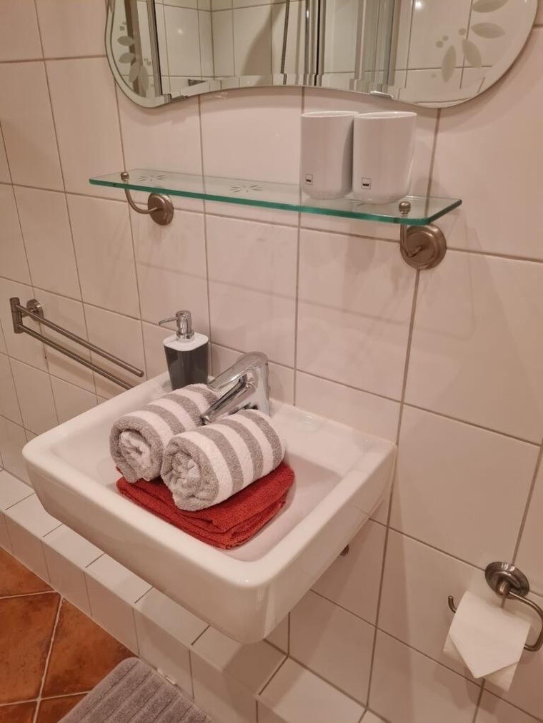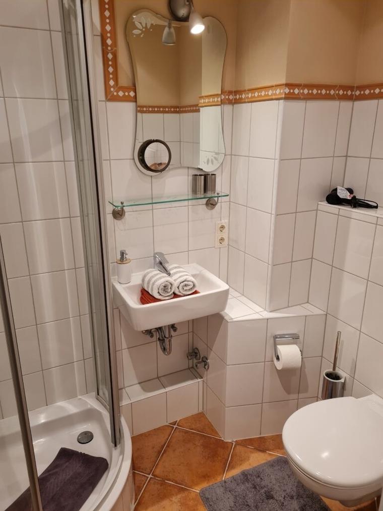 Das Zimmer befindet sich im 2 Obergeschoss. Holzboden, helle Möbel und nicht zuletzt der besondere Charme des Hauses gehören zu den Räumlichkeiten. Die Badezimmer in unserem Gästehaus sind alle topmodern und selbstverständlich in sehr gepflegtem Zustand.
