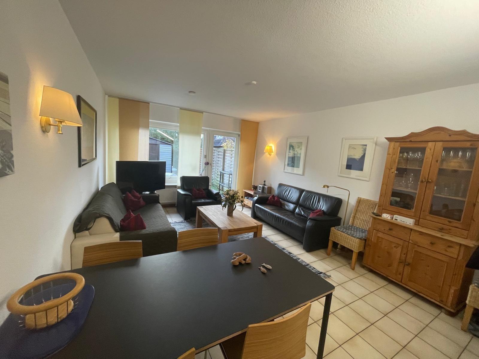 Vom Wohnraum aus gehen Sie direkt auf die Terrasse und in den Garten/ Rasen.