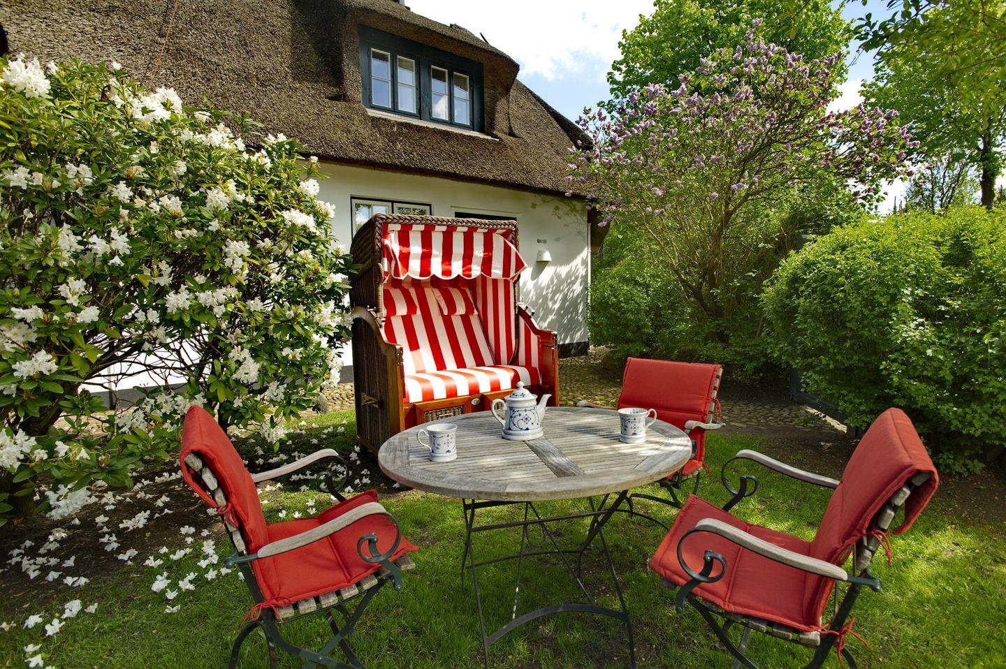 Das Weidemannhaus wird von einem für Keitum so typischen, wunderbar grünen Garten umschlossen. Inmitten dieser gepflegten Oase steht Ihnen als Gast der Wohnung Anthroposophie ein privater Gartenteil zur Verfügung. Genießen Sie die wunderbar frische Inselluft von Ihrem eigenen Strandkorb aus oder nehmen Sie sich einen Kaffee oder ein Stück Kuchen mit nach draußen - ein Sitzplatz ermöglicht eine herrliche Pause in der Sonne!