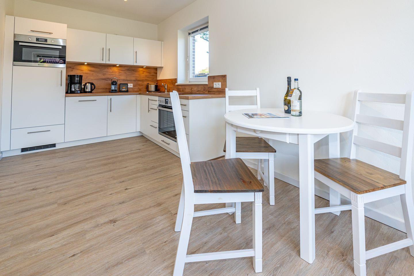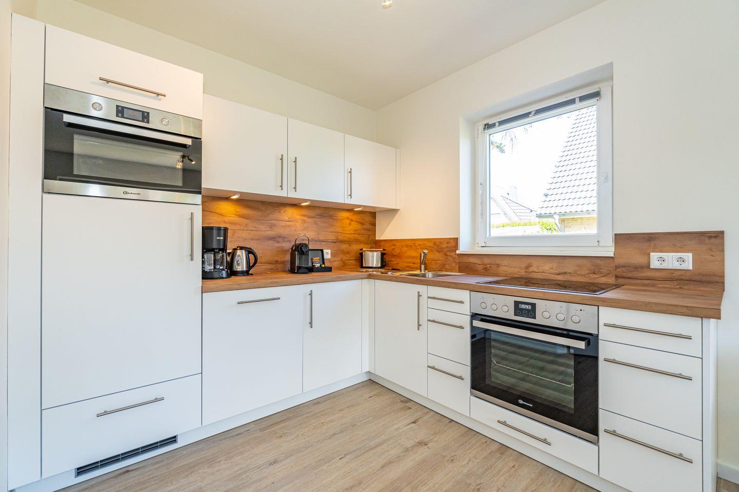 Die zum Wohnzimmer offene Küche ist praxisgerecht ausgestattet und unterstützt eine unkomplizierte Selbstversorgung. Zur Verfügung stehen Herd mit Cerankochfeld, Backofen, Mikrowelle, Spülmaschine, Kühlschrank mit Gefrierfach (Fach im Kühlschrank), Kaffeemaschine, Nespresso-Espressomaschine, Wasserkocher und Toaster sowie Küchenutensilien, Geschirr und Besteck.