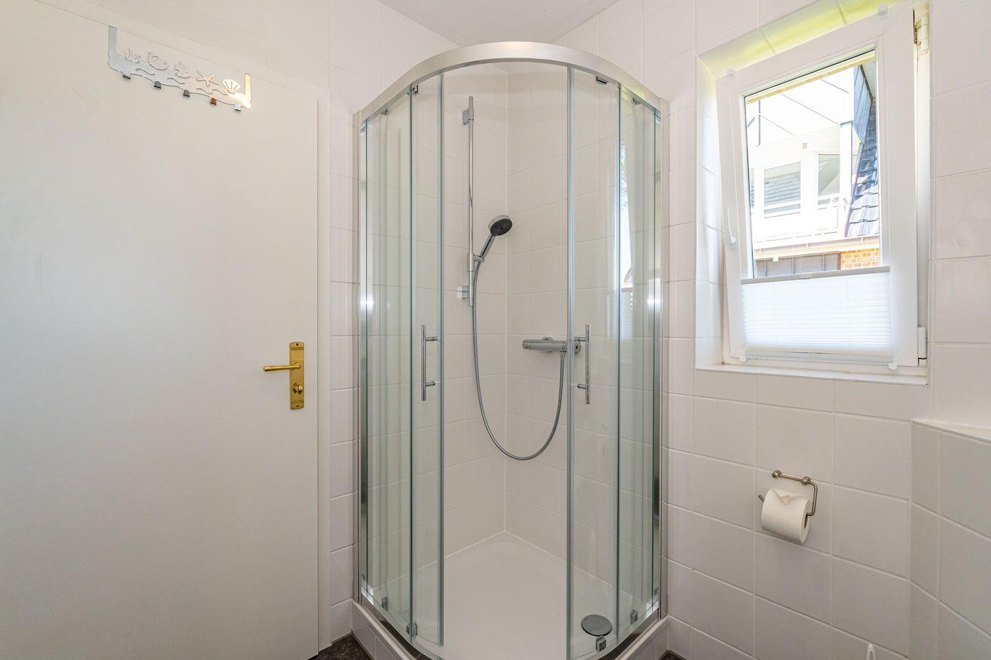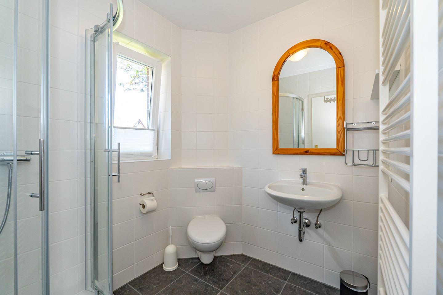 Das Badezimmer verfügt über Fenster, Waschbecken, Spiegel, WC und eine Dusche mit Wanne. Ein Haartrockner ist vorhanden, ebenso warmes Wasser. Zentralheizung und Heizung sorgen für angenehmen Wohnkomfort.