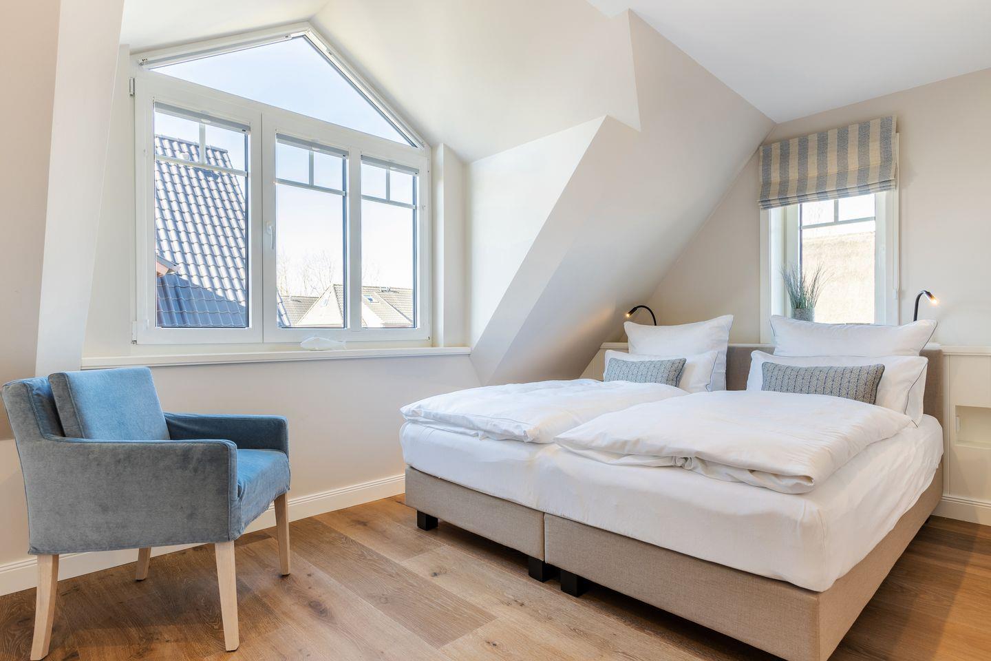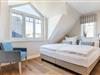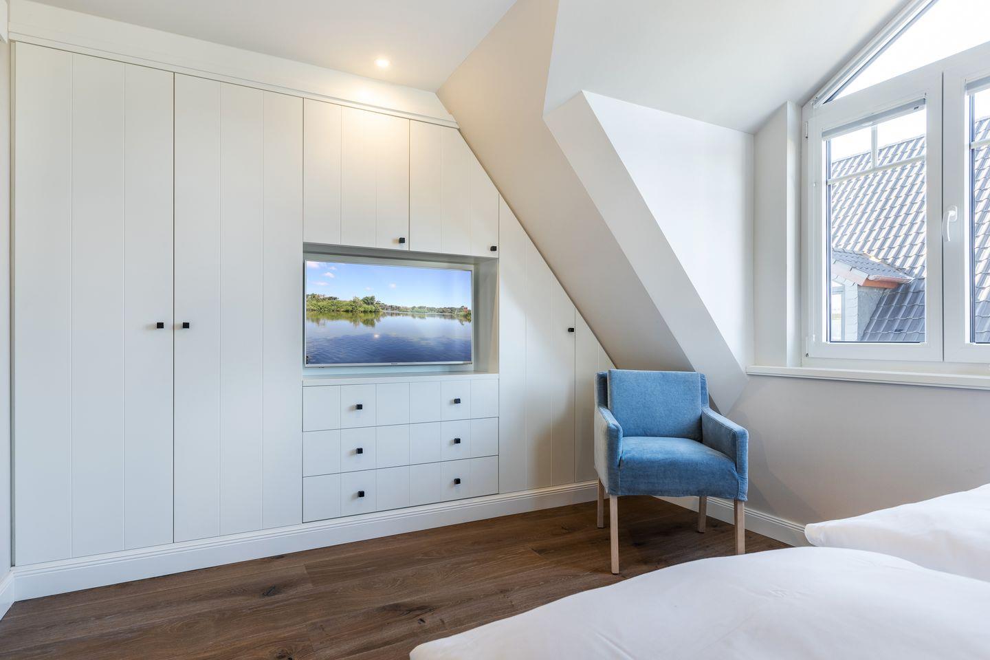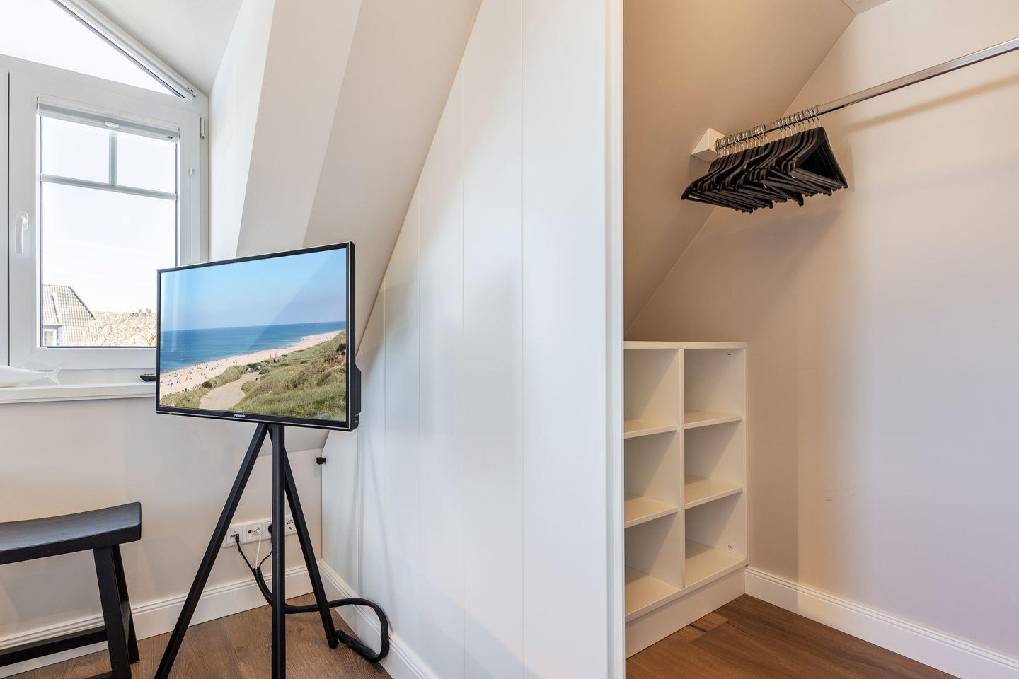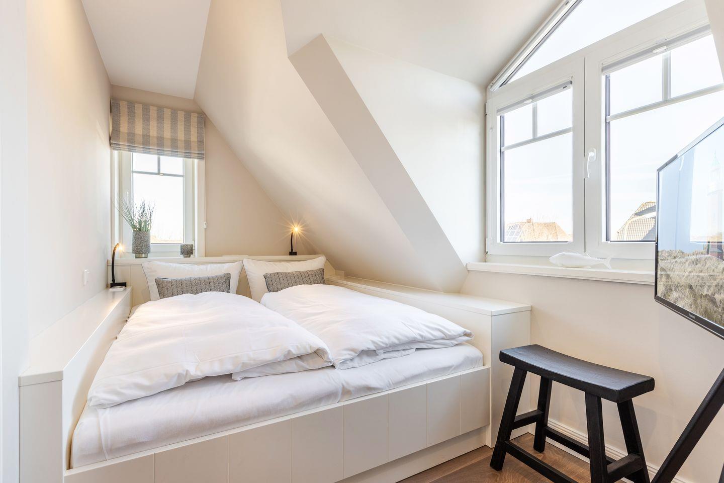 OG: zwei Räume mit Doppelbett (160 & 180x200) und TV, Badezimmer mit Dusche und WC.