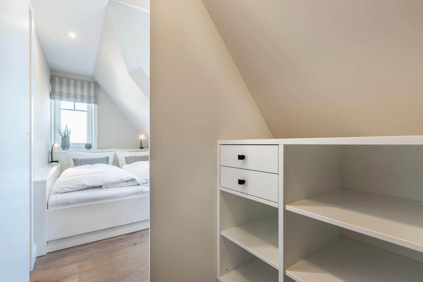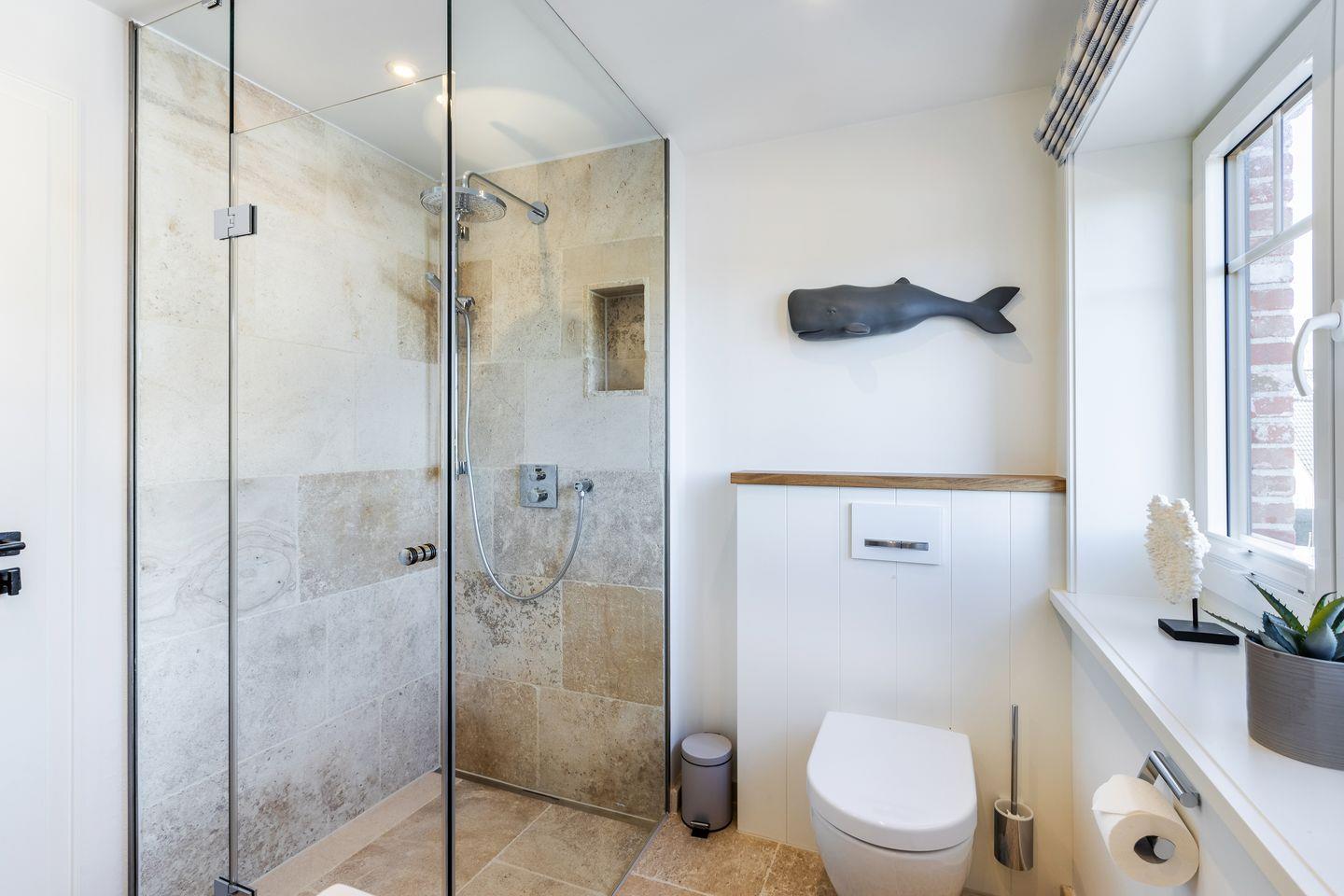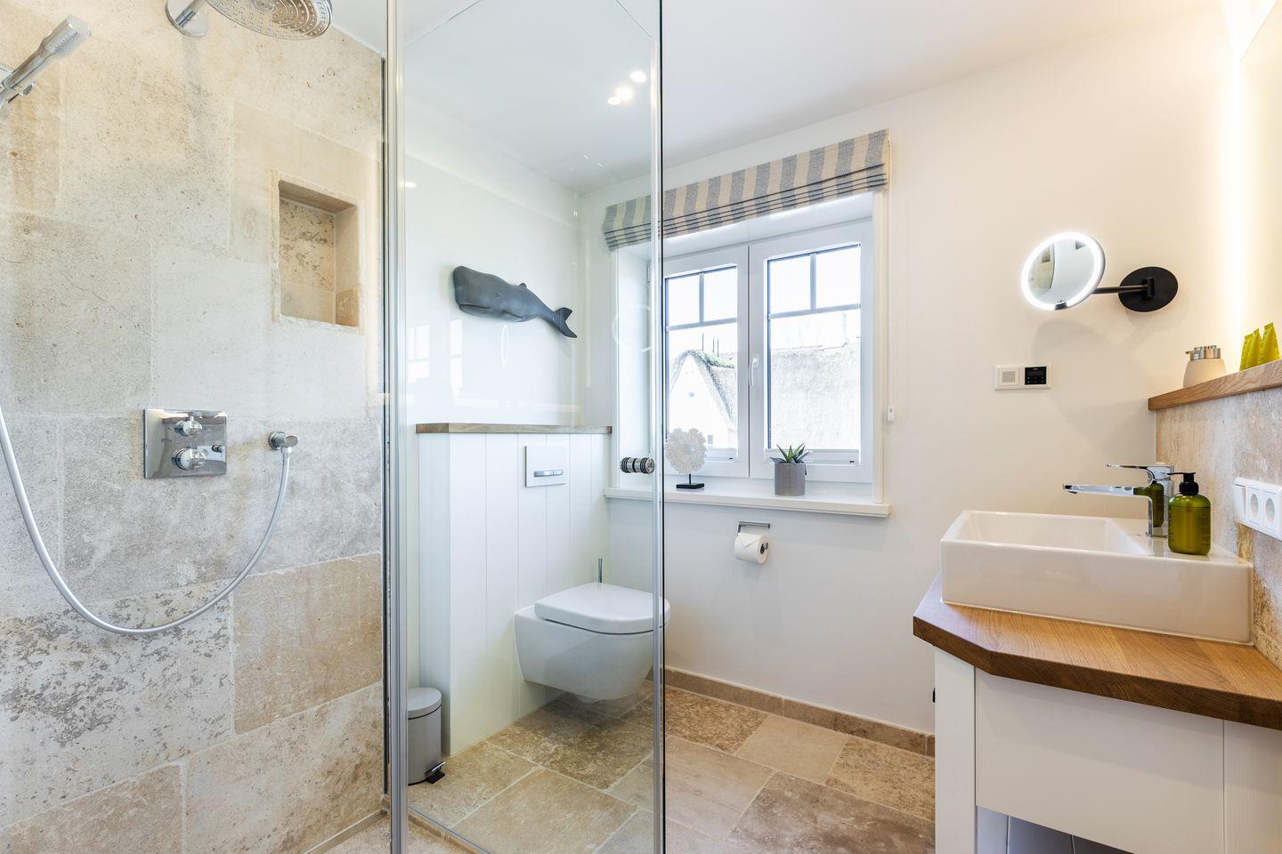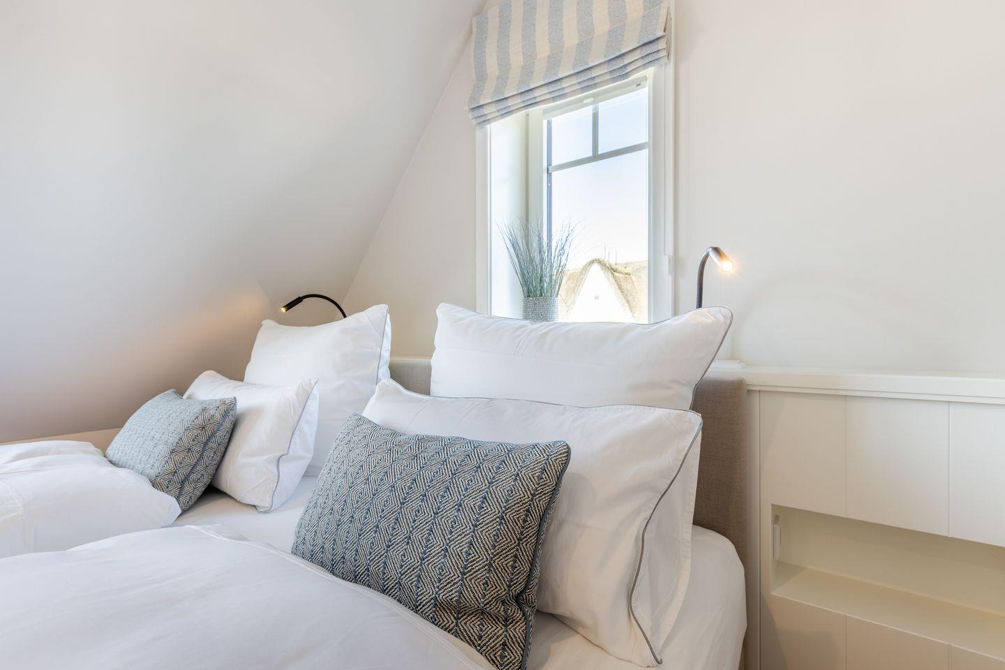 OG: zwei Räume mit Doppelbett (160 & 180x200) und TV, Badezimmer mit Dusche und WC.