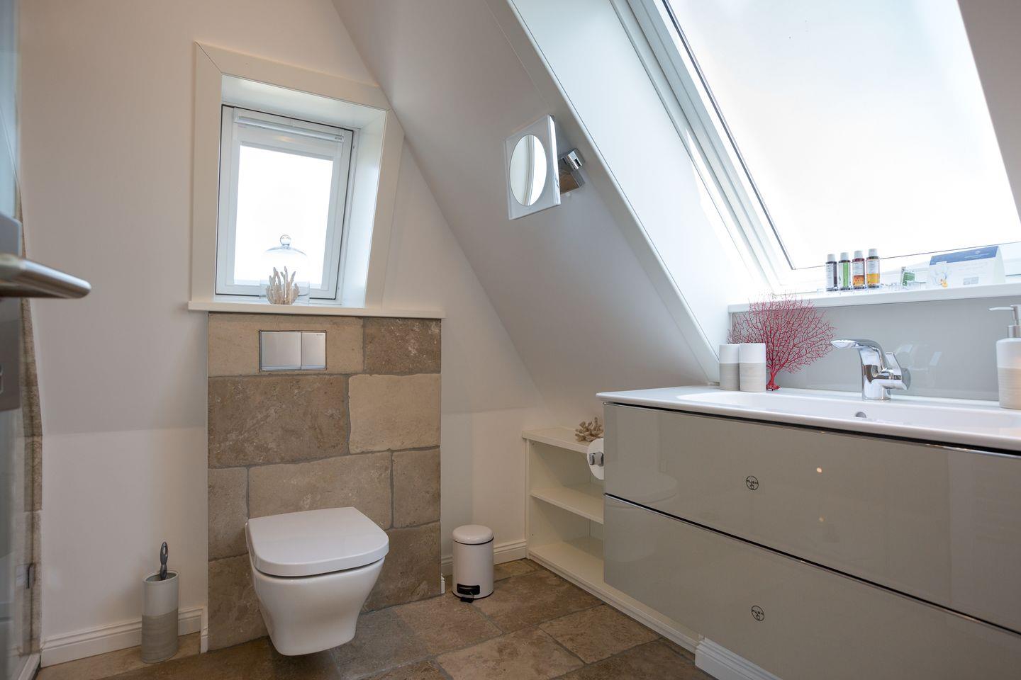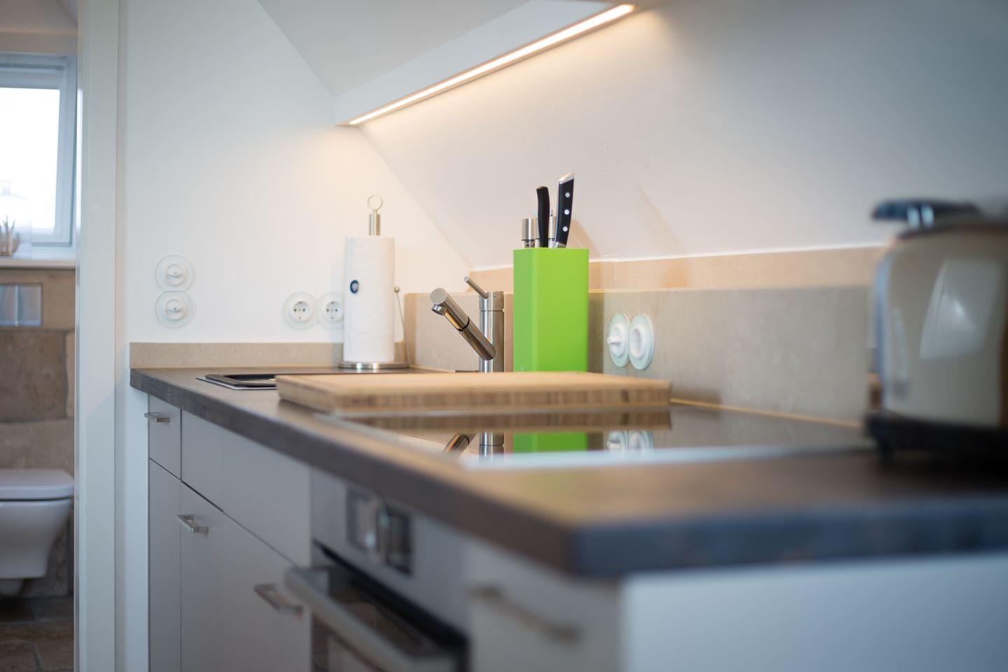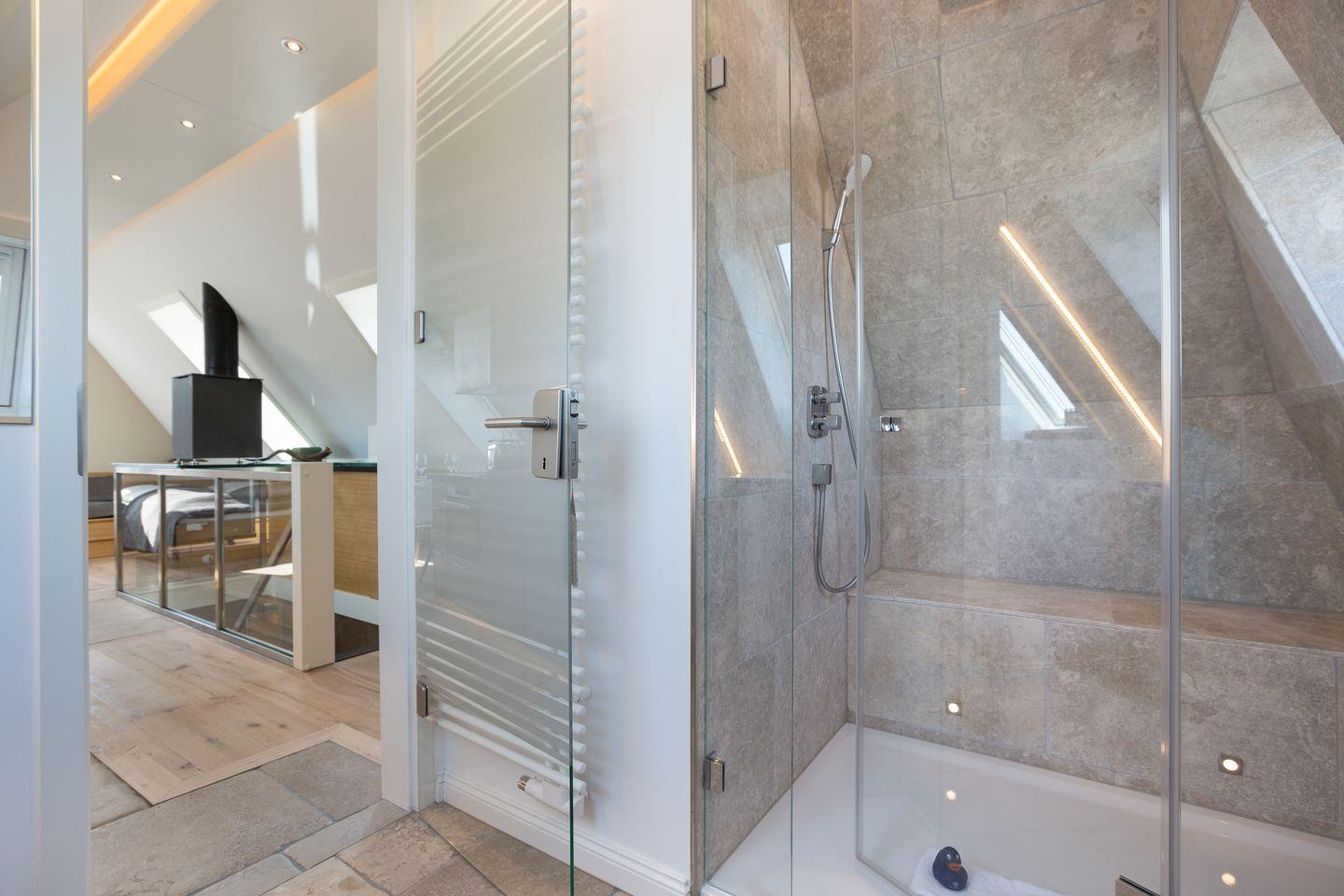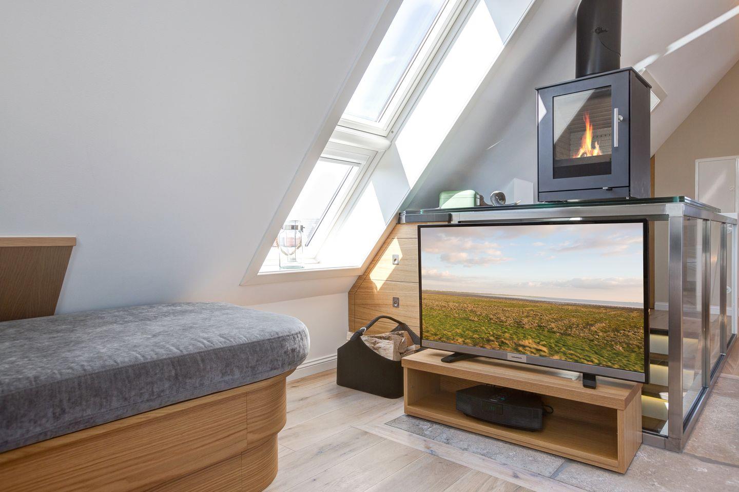Sehr hochwertig und stilvoll gestalteter, kombinierter Wohn-/Wohlfühlbereich mit komfortabler Schlafcouch -/Bett (ca.180x200-matratzen getrennt). Detailverliebte Ausstattung mit Flat-TV, iPod Dock, Radio und WLAN verstehen sich von selbst. Die edle Küchenzeile bietet Ihnen mit Geschirrspüler, Espressomaschine, Mikrowelle, Backofen und Ceranfeld jeglichen Komfort. Besonderes Highlight ist ein kompakter Kaminofen für lauschige und chillige Abende. Luxuriöses Bad mit WC und großzügiger Raindance-Dusche für Ihren perfekten Start in den Sylter Urlaubstag.