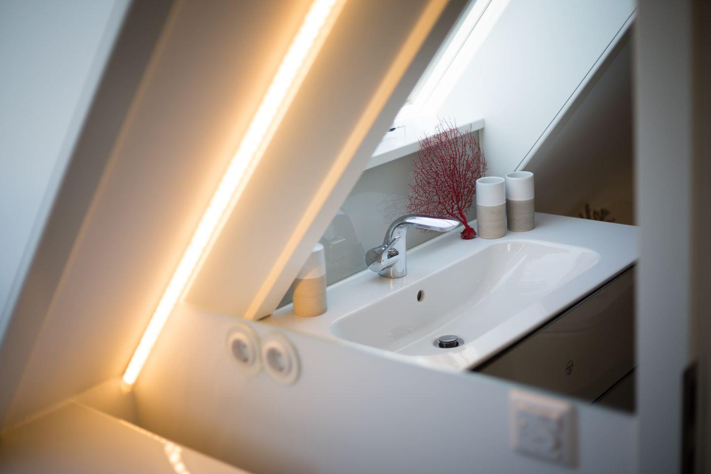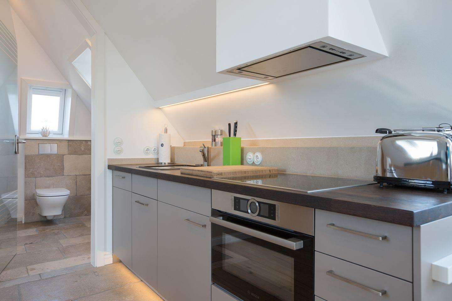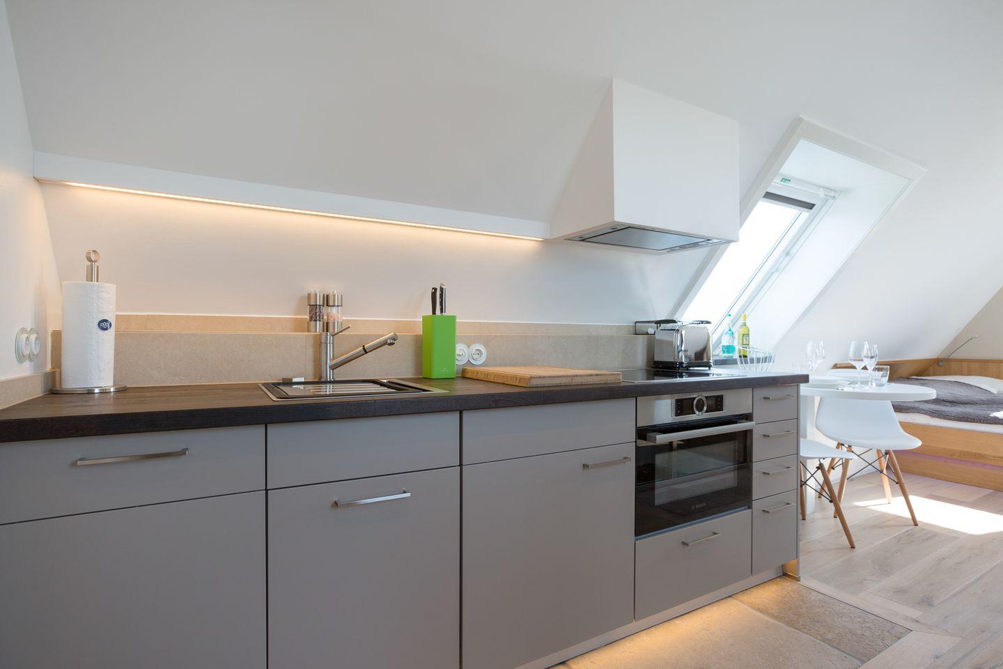 Und wer etwas von Architektur versteht, wird das universelle, flexible Raumkonzept lieben und bewundern, was auf kompaktem Raume alles möglich ist. Verzichten müssen Sie daher woanders, aber nicht hier. Freuen Sie sich auf ein fantastisches Luxusbad, eine voll ausgestattete, hochwertige Küchenzeile und auf edle Materialien, wie zum Beispiel Ihre wertige Eichendielung, feinster Naturstein oder stylishe Bad-Armaturen. Sogar ein kompakter Kaminofen steht Ihnen für kuschelige Stunden zur Verfügung. Das innovative Leuchtenkonzept wird Sie bestimmt ebenfalls überraschen.