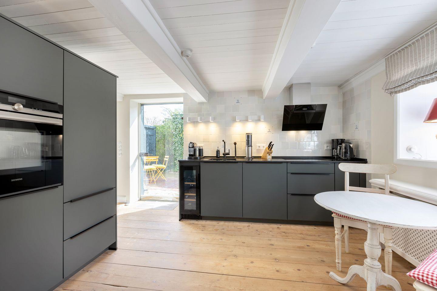 EG: Wohnraum mit TV und Kachelofen, Essbereich, offene Küche mit Microwelle-Backofen-Kombi, Geschirrspüler, Induktionsherd, Nespresso-Maschine, SodaStream, Duschbad, Terrasse mit Gartenmöbeln und Strandkorb (April-Oktober).