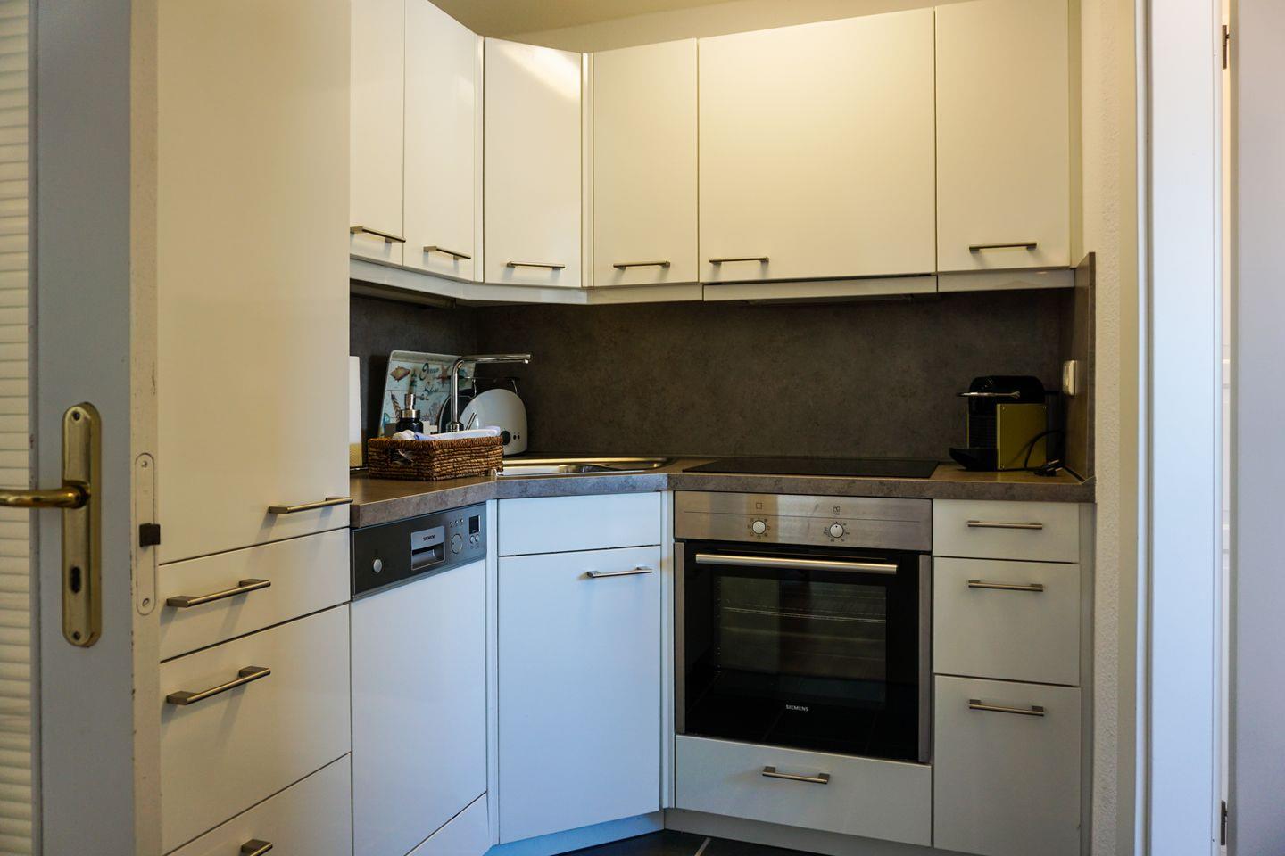 OG: Sehr schön heller, hochwertig gestalteter Wohnraum mit Smart-TV mit integriertem DVD-Player, Bluetooth-Box, und WLAN. Schöne Sitzecke. Kleiner Ostbalkon mit Gartenmöbeln für zwei Personen (ca. April–Oktober). Design-Küche mit Geschirrspüler, Backofen und Nespresso-Maschine. Kleines Schlafzimmer mit zwei Einzelbetten (80x190cm), am besten für Kids geeignet. Modernisiertes Wohlfühlbad mit Dusche und WC.
