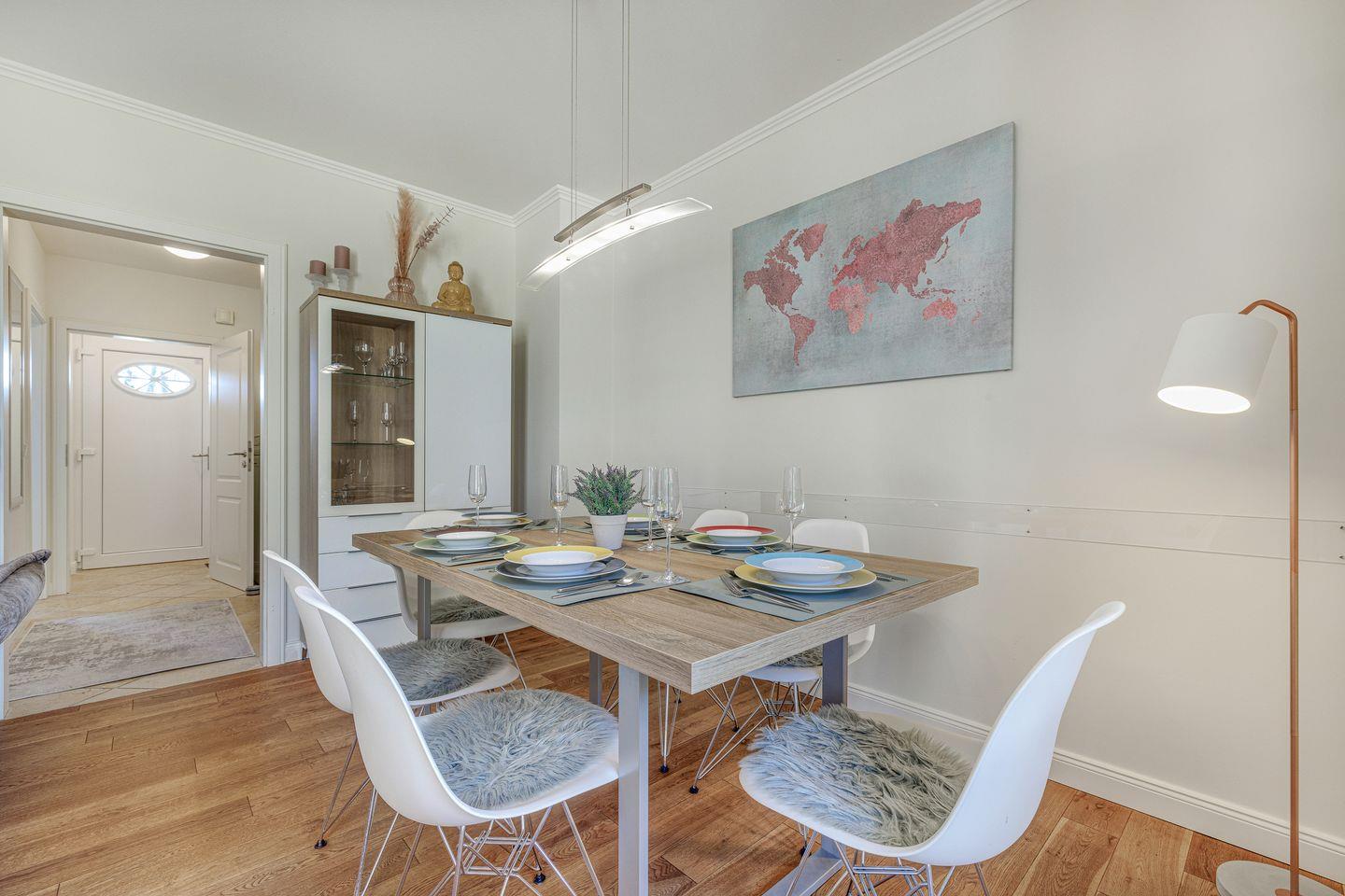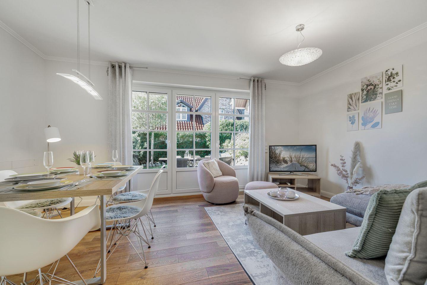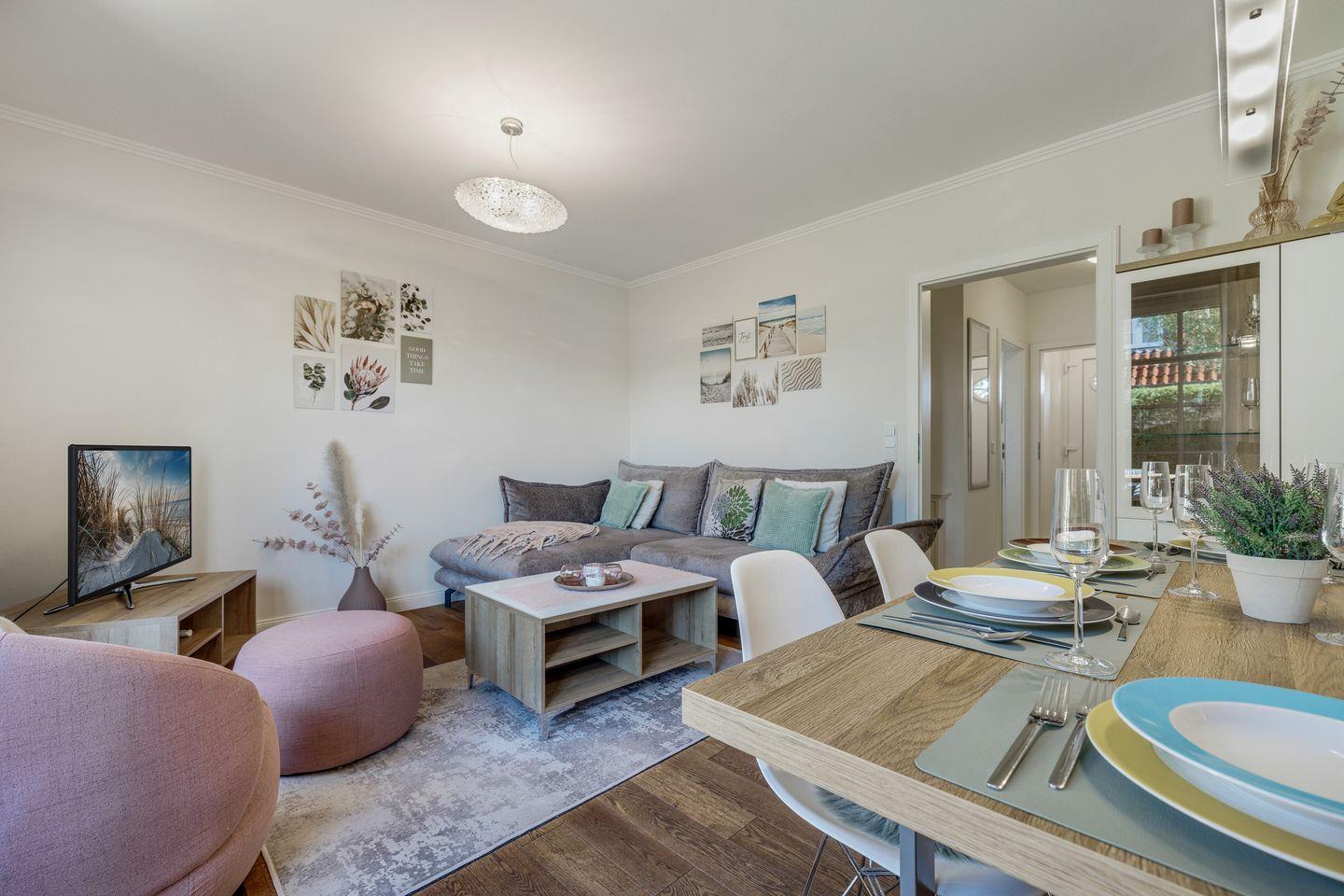 EG: Wohnbereich mit Flatscreen-TV; Essbereich, CD-Radio, separate Küche mit Backofen, E-Herd, Geschirrspüler, Mikrowelle, Nespressomaschine; Gäste-WC; möblierte Gartenterrasse