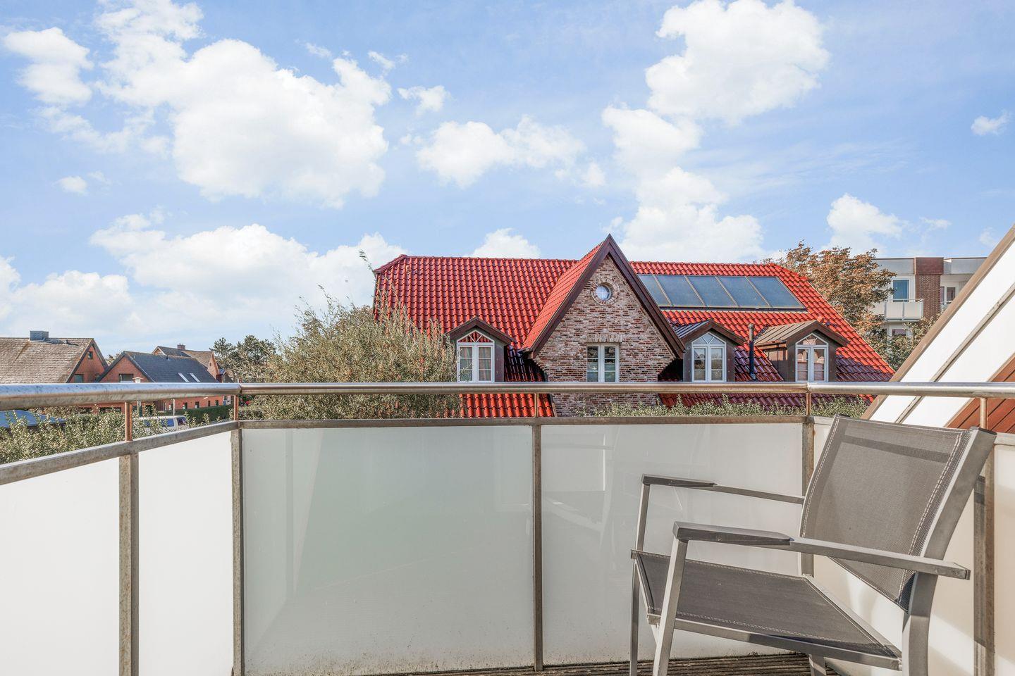OG: Schlafzimmer mit Doppelbett (2x90x200cm), Flatscreen-TV und Balkon, Badezimmer mit Dusche und WC