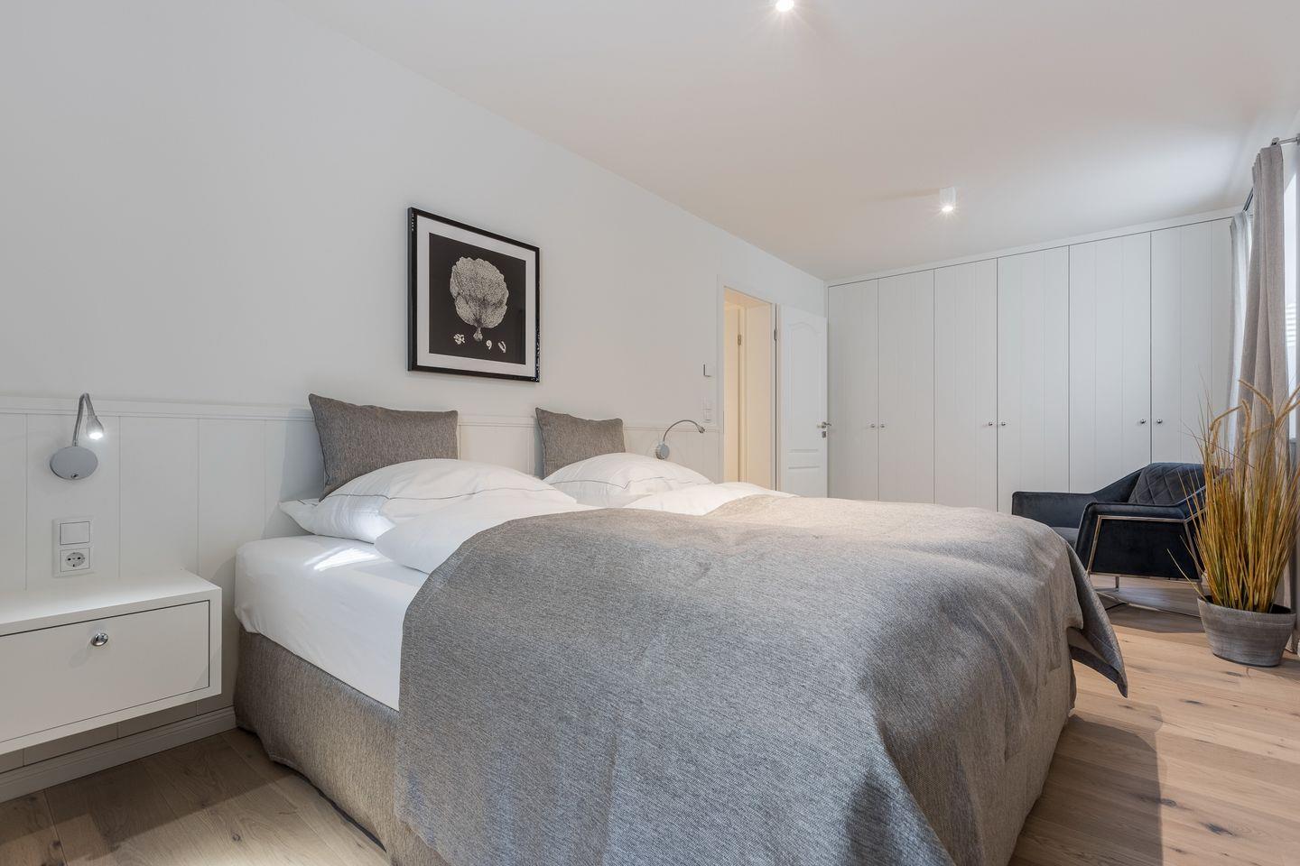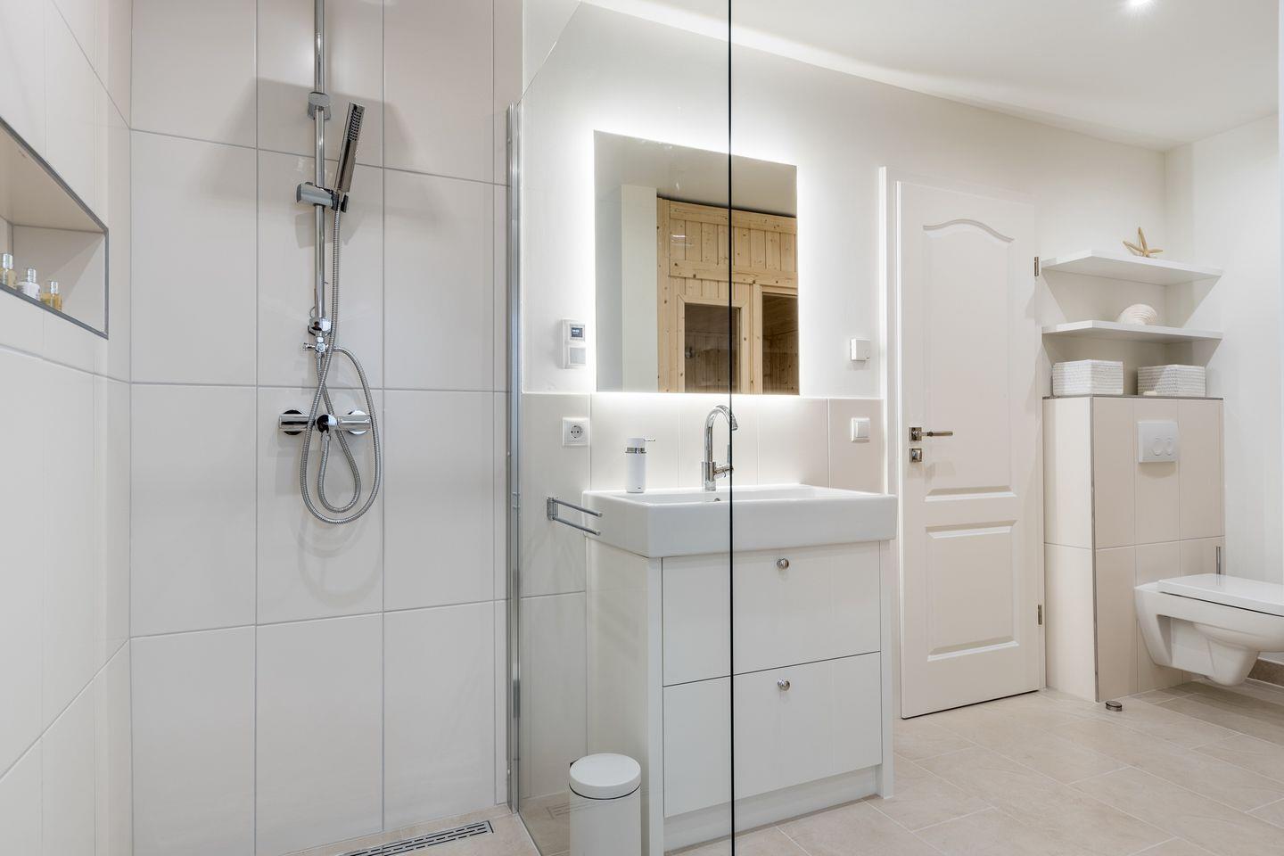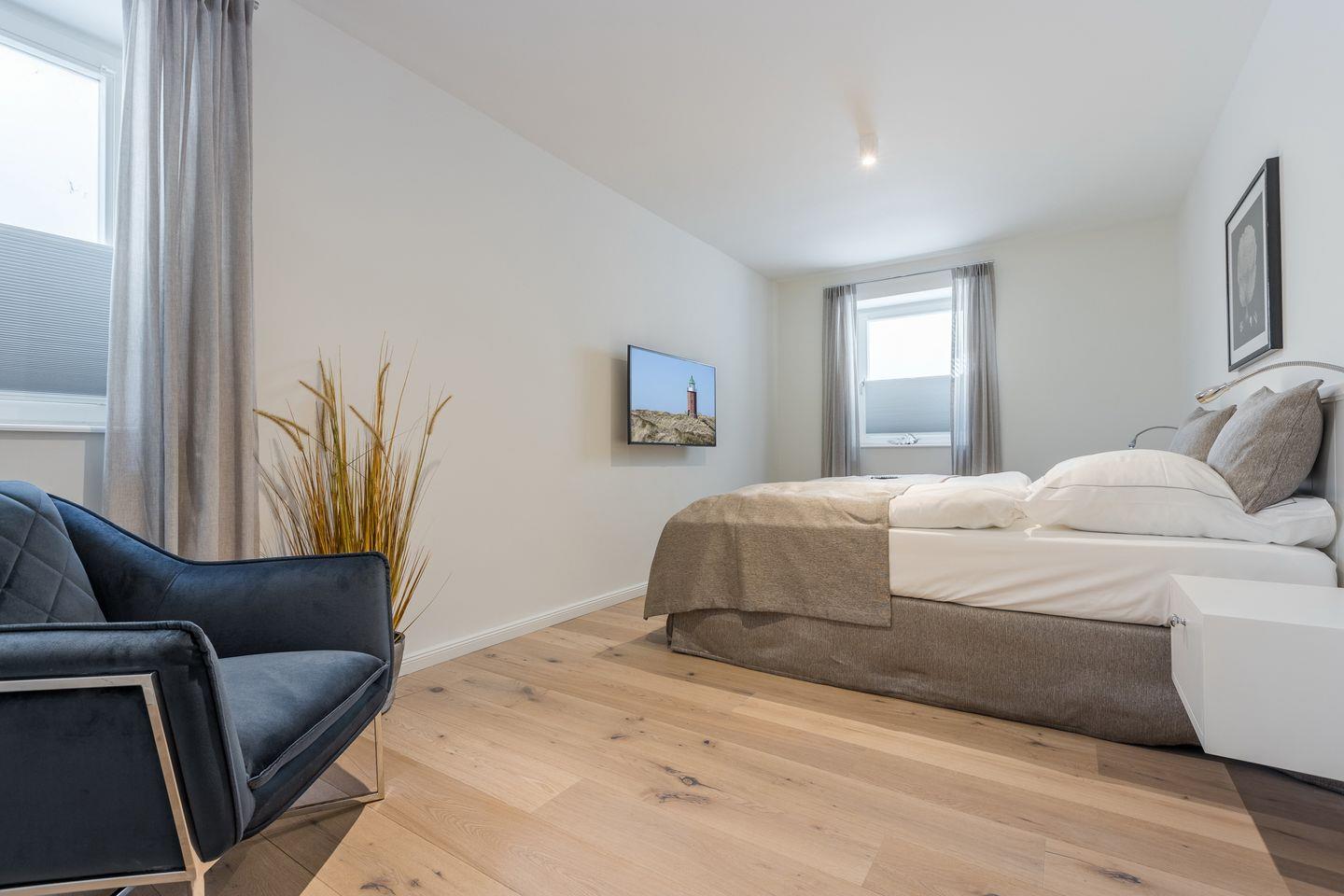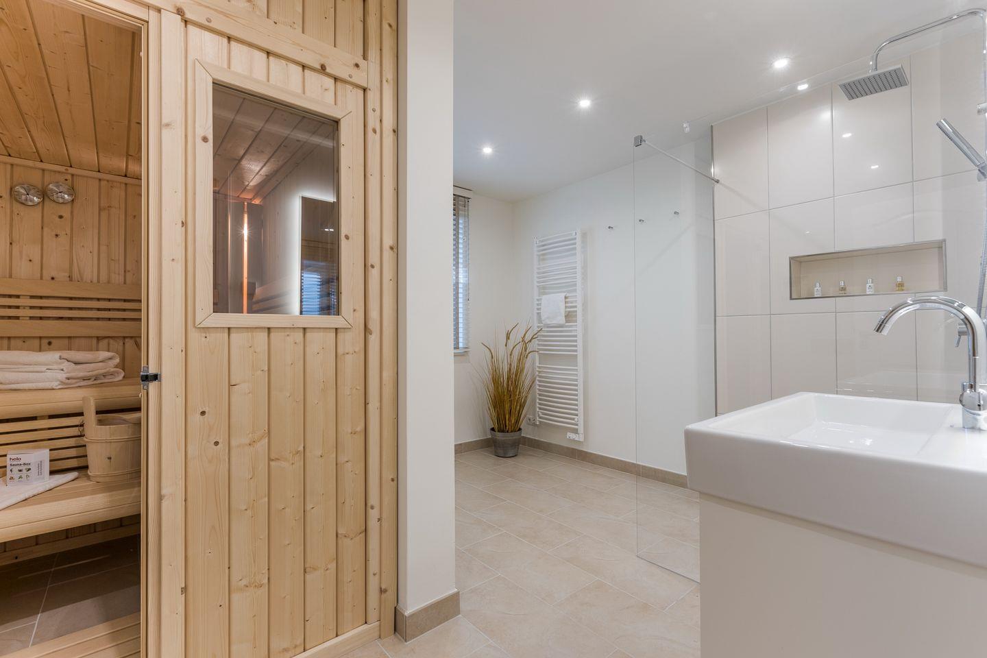 Im Untergeschoss des Hauses erwartet Sie ein Zimmer mit Boxspringbett und Flatscreen-TV sowie Ihre persönliche Wohlfühloase mit einer privaten Sauna und einem großen Duschbad mit WC. Im Obergeschoss des Hauses finden Sie zwei Schlafräume mit je einem Boxspringbett und Flatscreen-TV. Diese Etage verfügt außerdem ebenfalls über ein Badezimmer mit Dusche und WC.