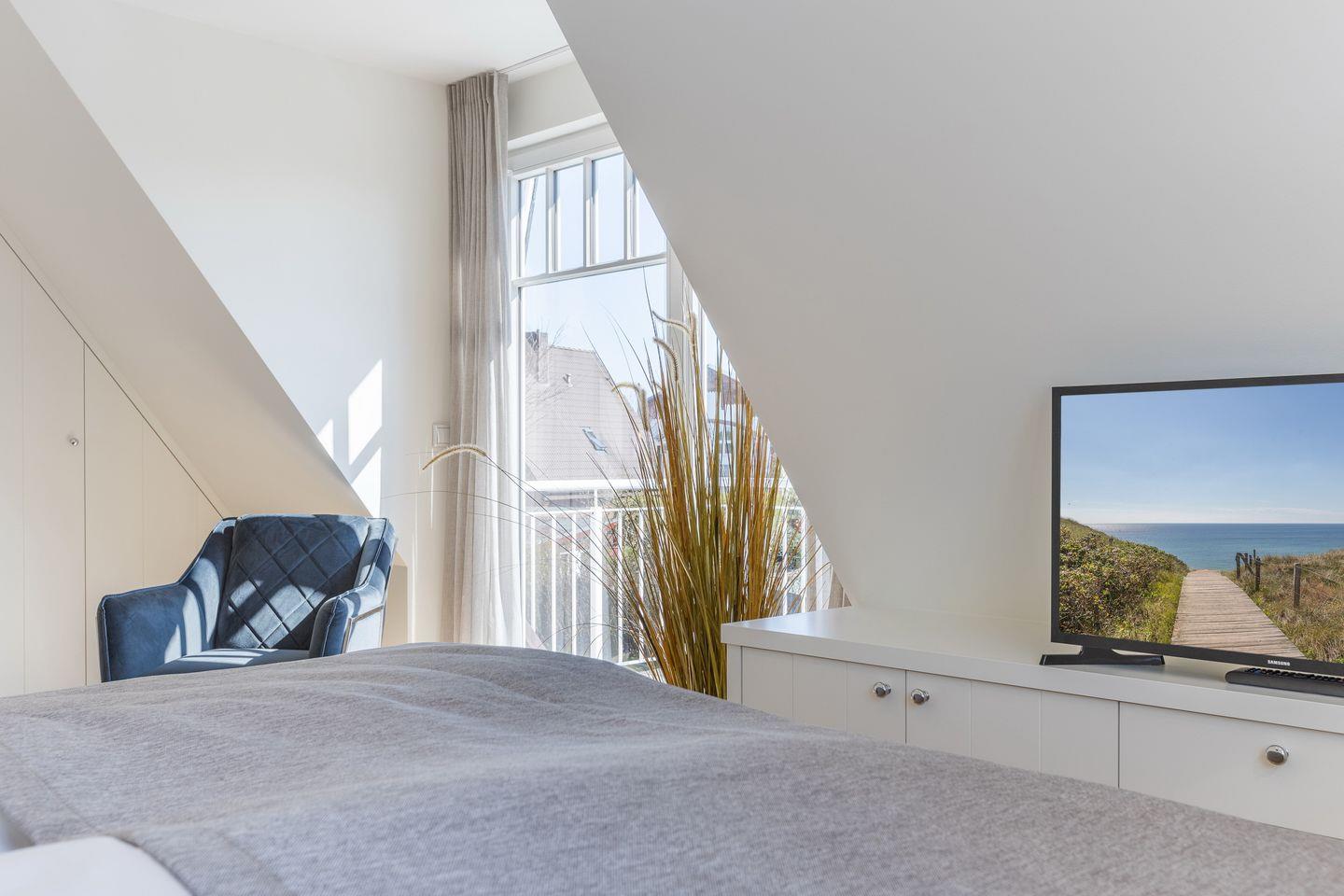 OG: 1 Schlafraum mit Boxspringbett (180x200cm) und Flatscreen-TV und eigenem Balkon, 1 kleiner Schlafraum mit Boxspringbett (180x200cm) und Flatscreen-TV, Badezimmer mit Dusche und WC.