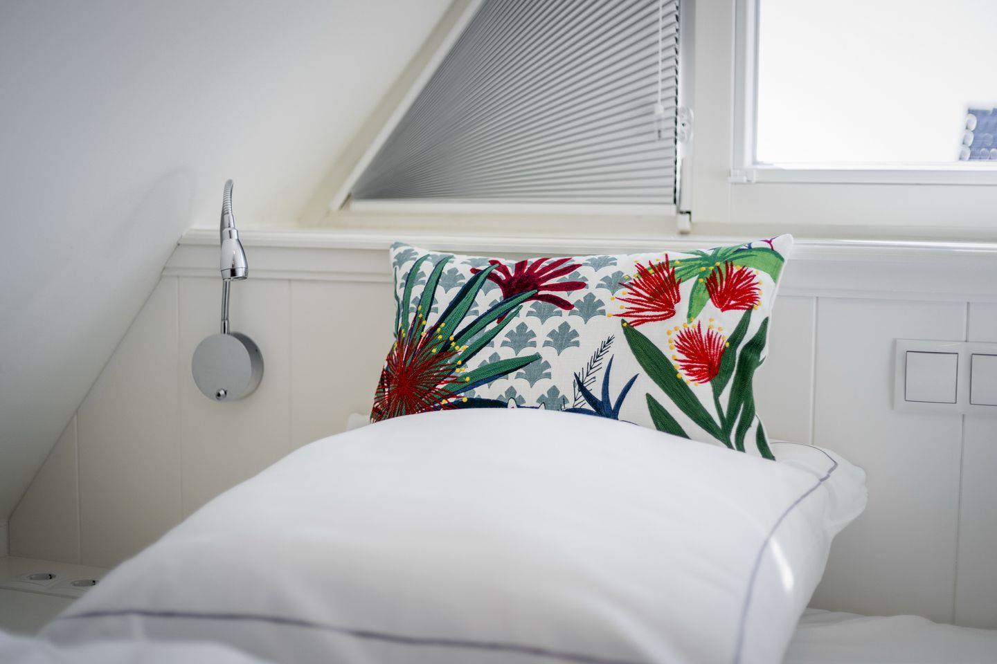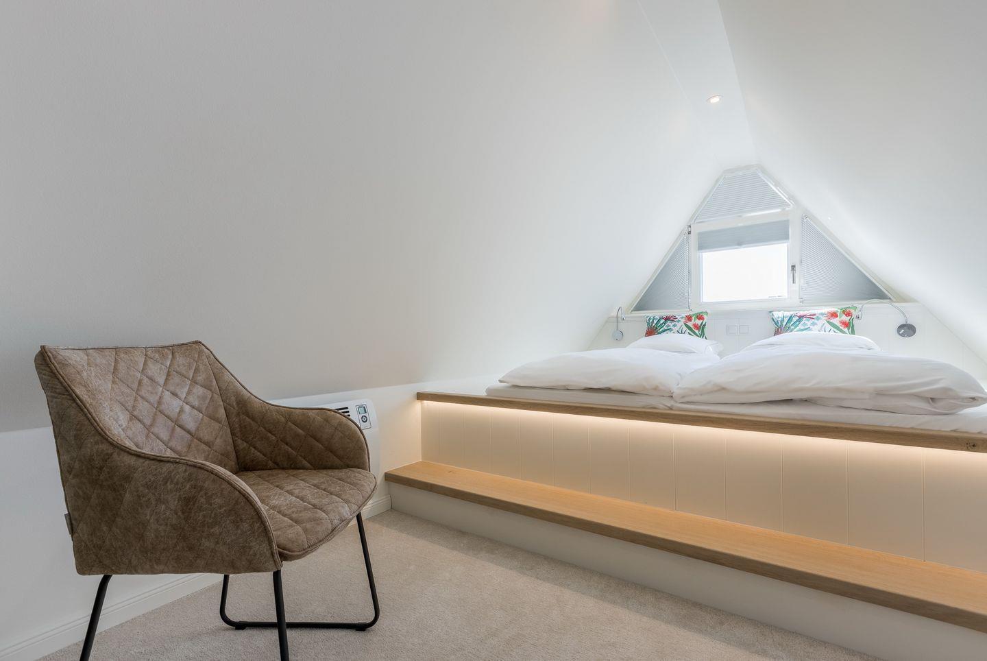 Im Dachgeschoss des Hauses findet sich ein weiteres, gemütliches Zimmer mit eingebautem Doppelbett, das zum Träumen einlädt.