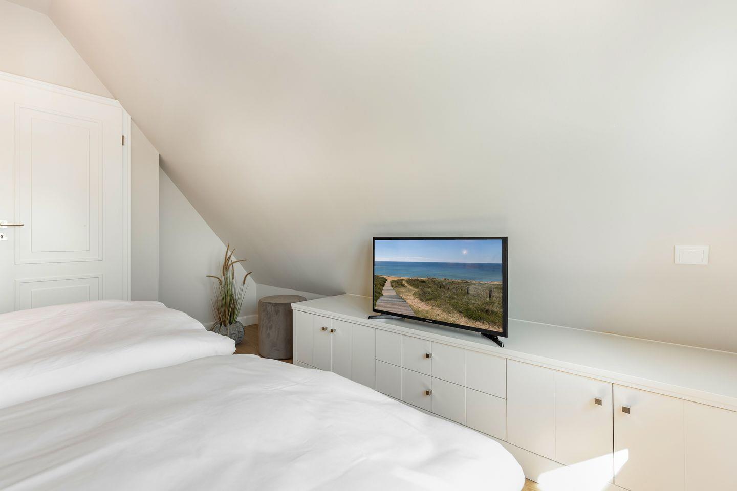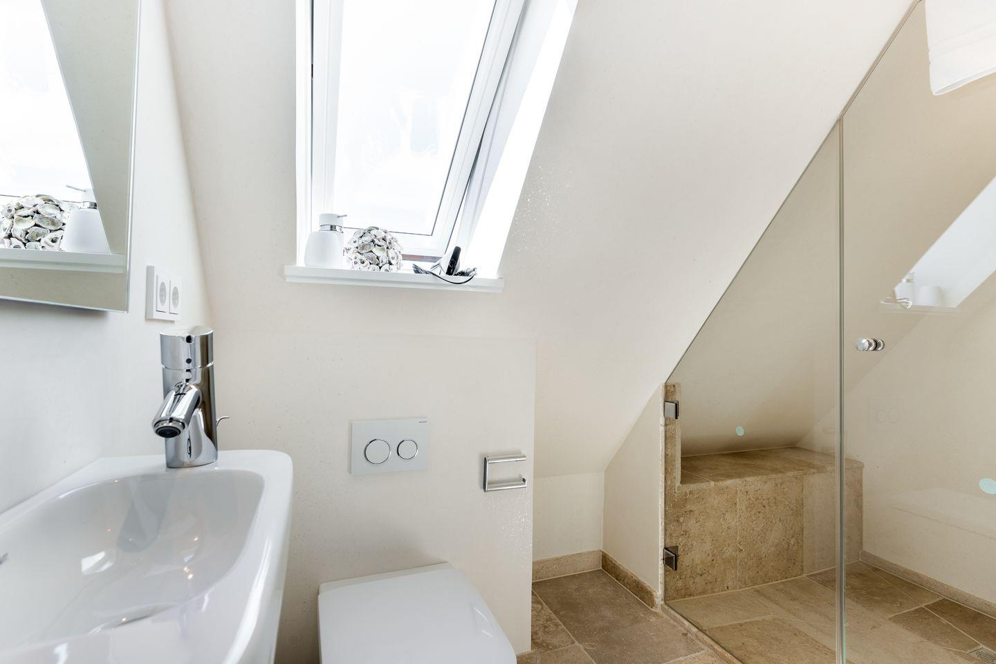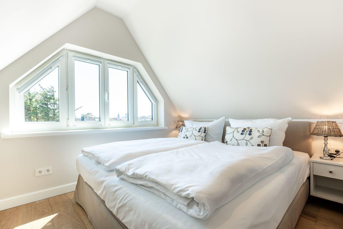 Im voll ausgebautem Dachgeschoß befindet sich ebenfalls ein bequemes Boxspring-Doppelbett (180x200). Die große Fensterfront im Giebel (natürlich komplett abdunkelbar) sorgt tagsüber für einen herrlichen Lichteinfall. Eine kleine Besonderheit dieses Dachgeschosses liegt in dem eigenen Duschbad mit WC.
