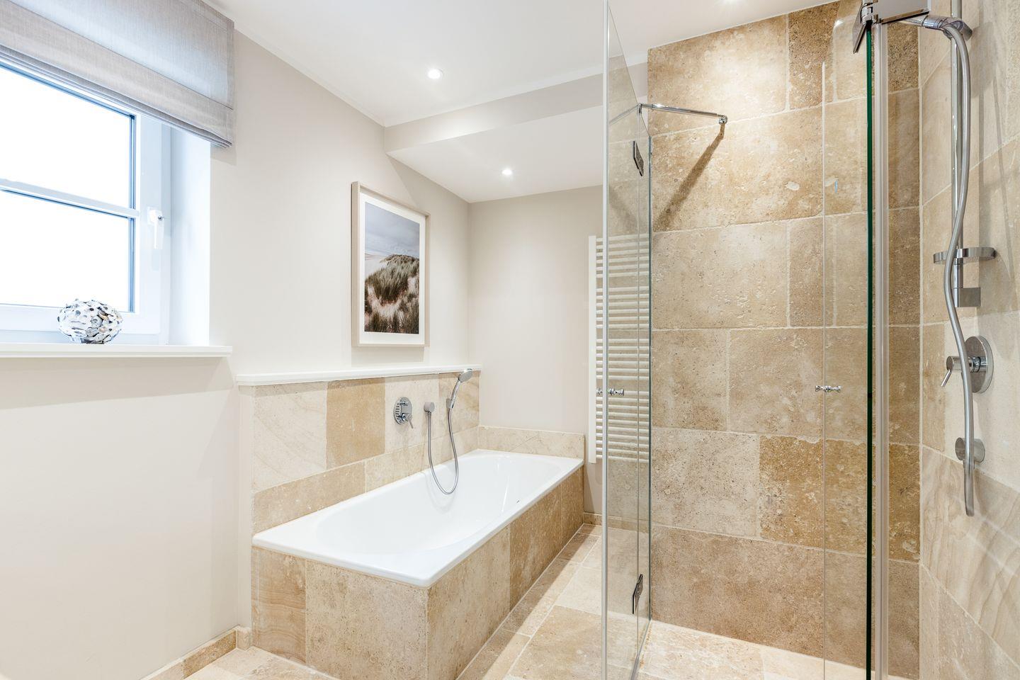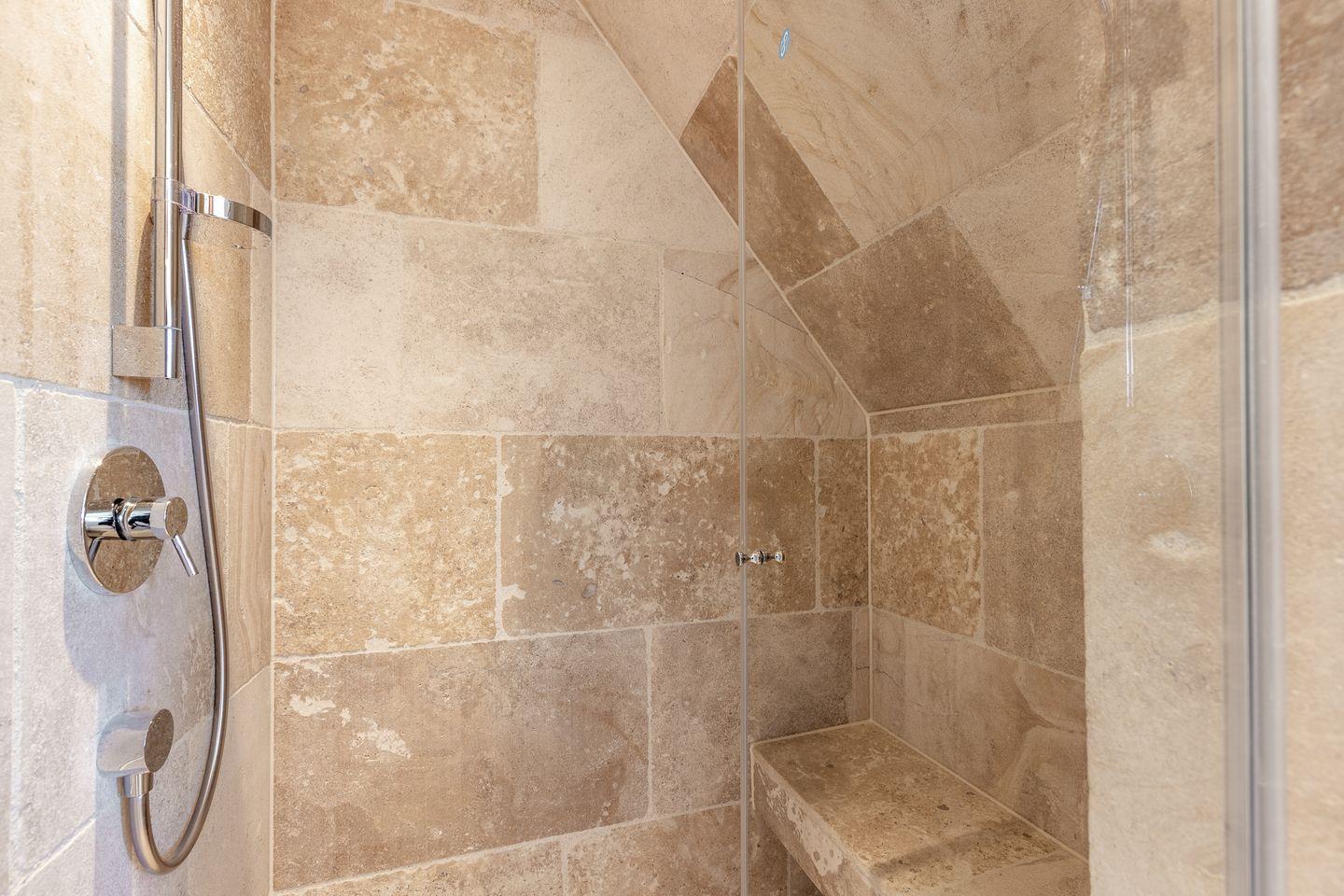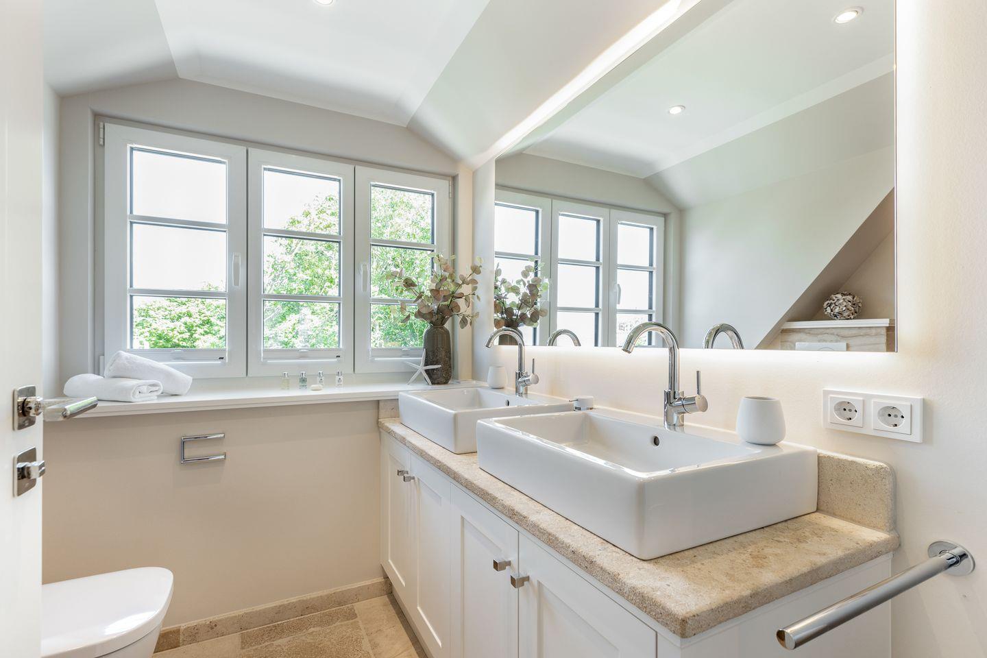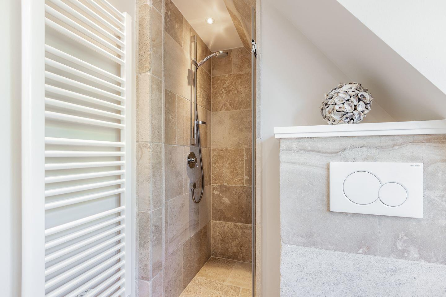 Im Obergeschoß erwartet Sie ein besonders großzügiges Schlafzimmer mit einem herrlichen Boxspring-Doppelbett (200x200cm) und einem schönen Schreibtisch. Das zweite Schlafzimmer auf dieser Ebene ist mit 2 Einzelbetten (je 90x200cm) ausgestattet, das geräumige Duschbad in hochwertigem Naturstein gehalten.