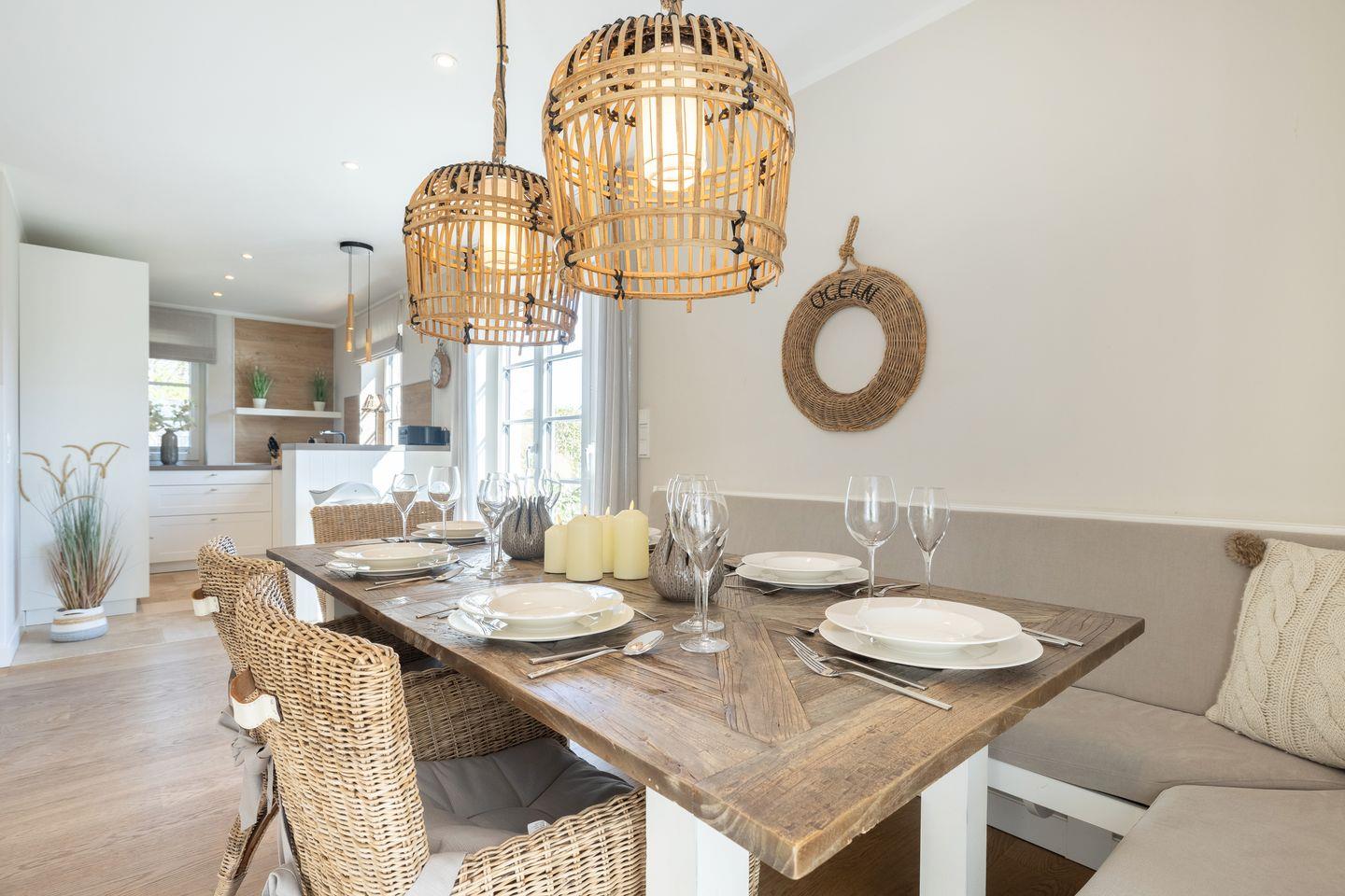 EG: Wohnraum mit Sofaecke, Gaskamin und Flatscreen-TV; Essbereich mit großer Sitzbank; offene Küche mit Geschirrspüler, Bora-Induktionskochfeld, Backofen-/Mikrowellenkombigerät, Nespresso und Filterkaffeemaschine; Gäste-WC; Garten mit 2 möblierten Terrassen, Strandkorb und Gartenhütte mit Lademöglichkeit für E-Bikes.