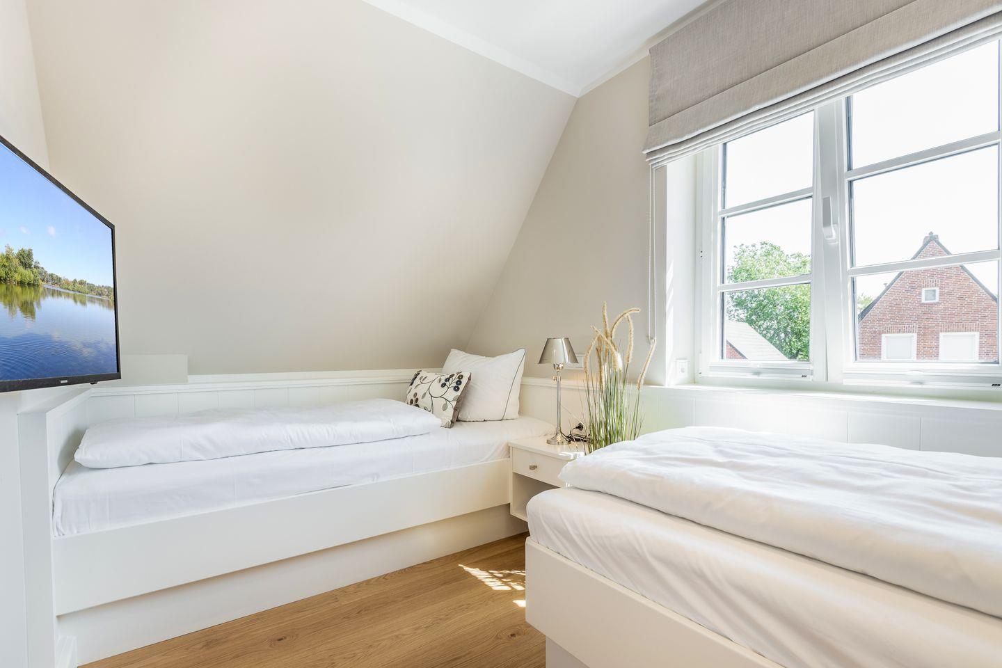 OG: Schlafzimmer mit Doppelbett (200x200cm-Matratzen getrennt), Flatscreen-TV, Schreibtisch; Schlafzimmer mit zwei Einzelbetten (je 90x200cm); Duschbad mit Doppelwaschbecken, WC