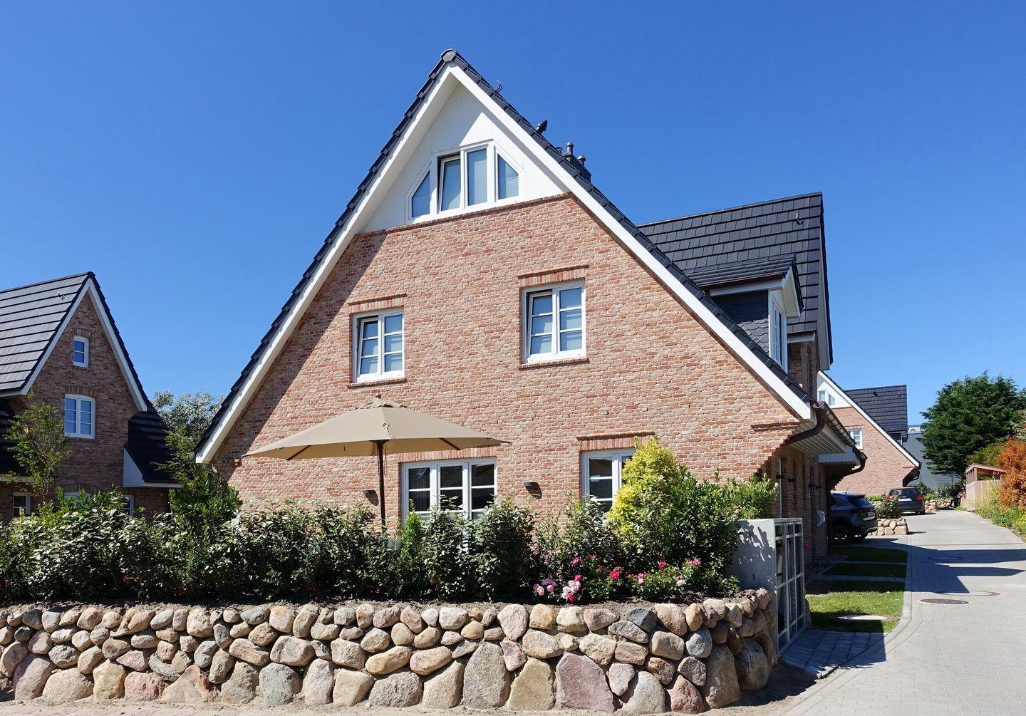 Im Erdgeschoß befindet sich der lichtdurchflutete und offene Wohnbereich mit seiner Sofalandschaft und dem Gaskamin, der bestens ausgestatteten Küche und dem großen Esstisch mit gemütlicher Ecksitzbank. Von hier aus gelangen Sie direkt auf die zwei Terrassen (Süd und West) und in den eigenen Garten, welcher komplett mit Friesenwällen umgeben ist. Hunde sind hier herzlich willkommen. Dort steht ebenfalls ein kleines Gartenhäuschen (mit Lademöglichkeit) für Ihre Fahrräder.