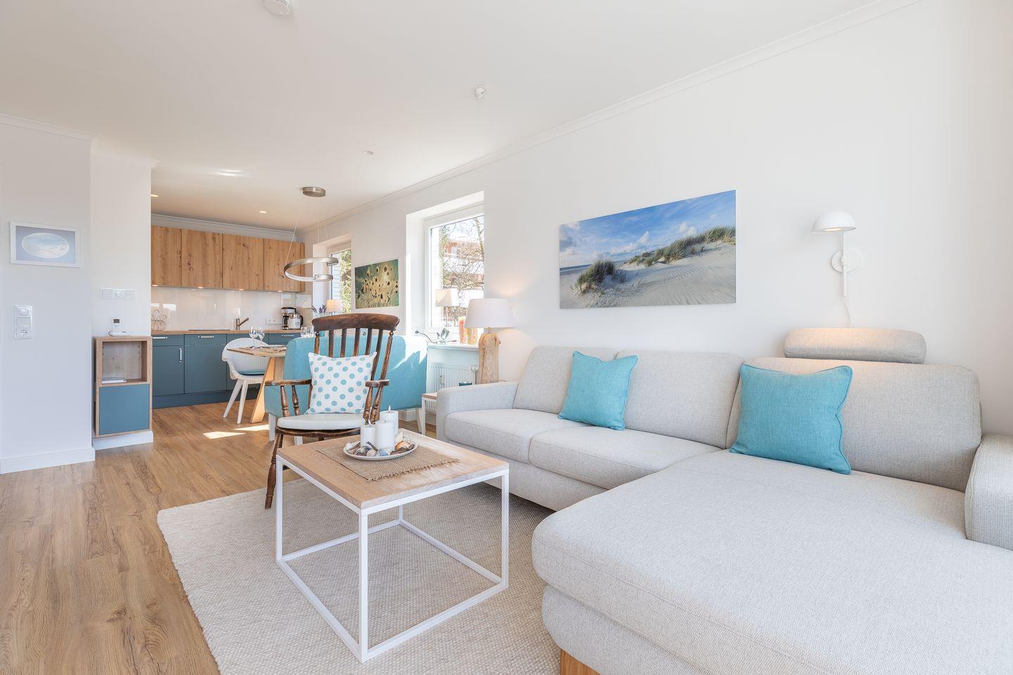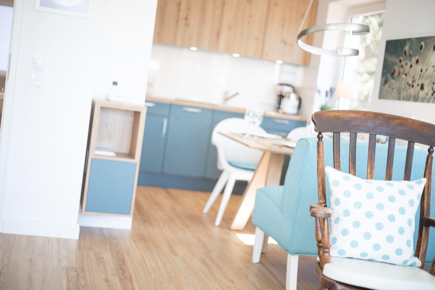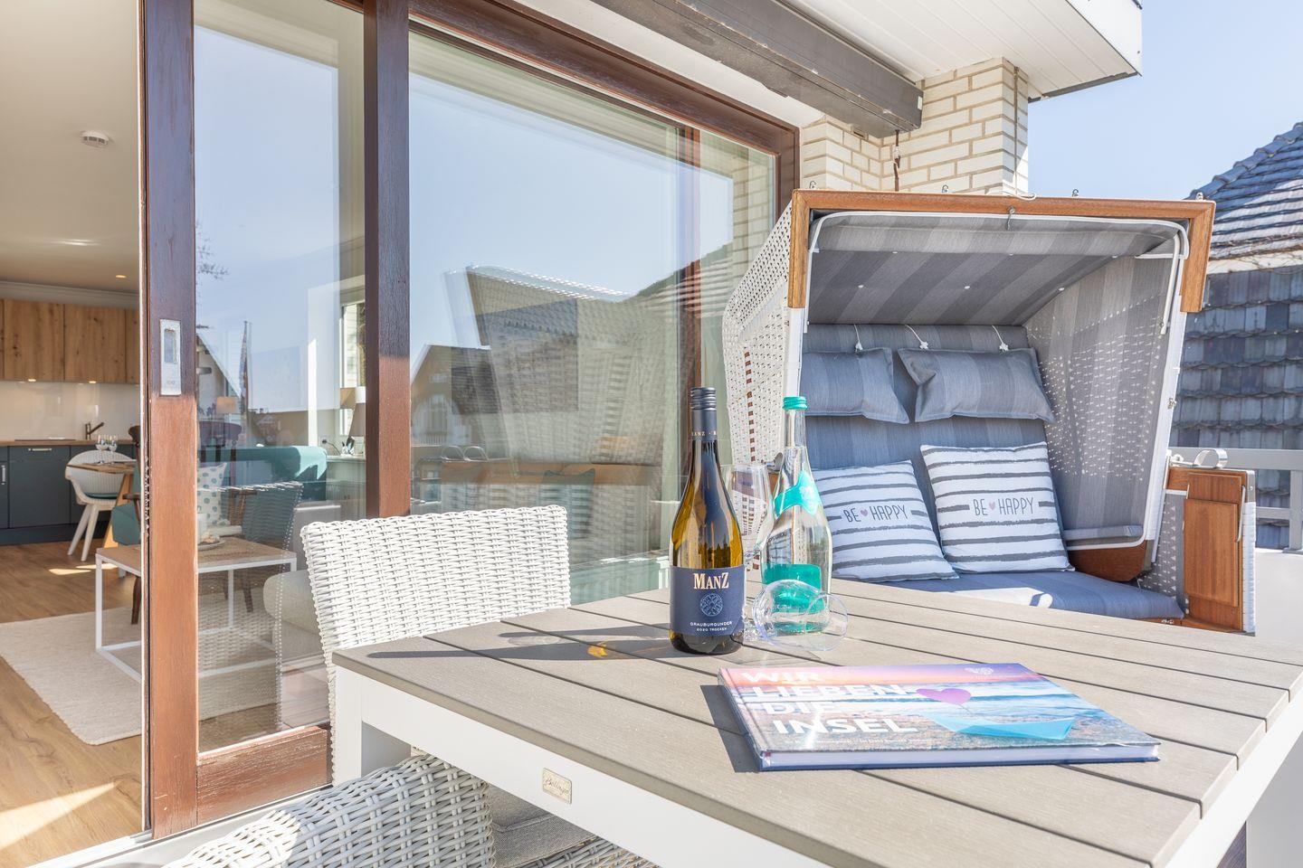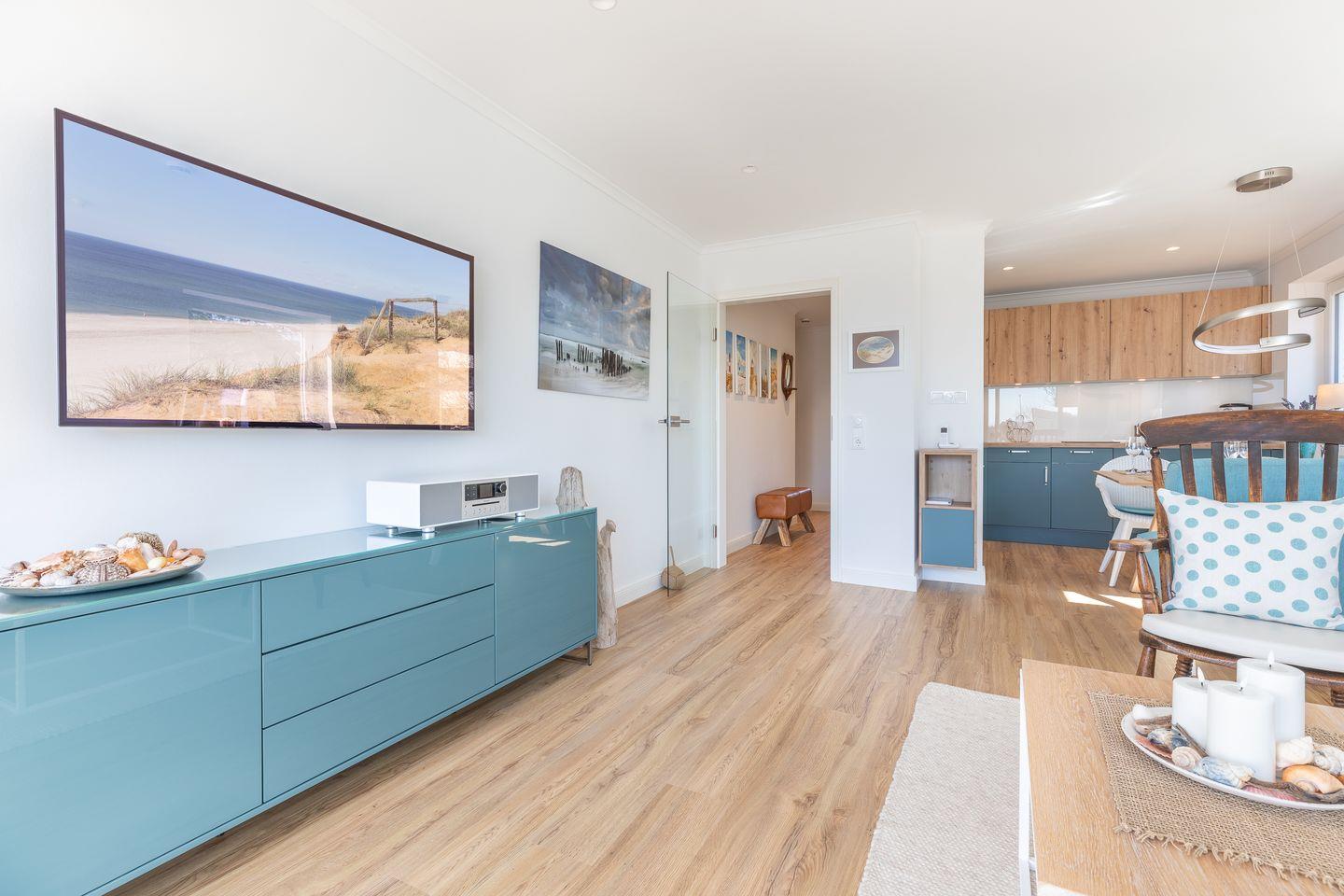 Wohnraum mit Flatscreen-TV, Sonoro-Anlage, W-Lan, Essbereich, offene Küche mit Microwelle-Backofen-Kombi, Induktionsherd, Geschirrspüler, Heißluftfritteuse, Filterkaffeemaschine, Nespresso-Kaffeemaschine. Balkon mit Balkonmöbeln (ca. April - Oktober) und Strandkorb. Ein Schlafraum mit Doppelbett und Flatscreen-TV. Ein Badezimmer mit Dusche und WC. Parkplatz am Hause, Nichtraucher, keine Haustiere erlaubt.