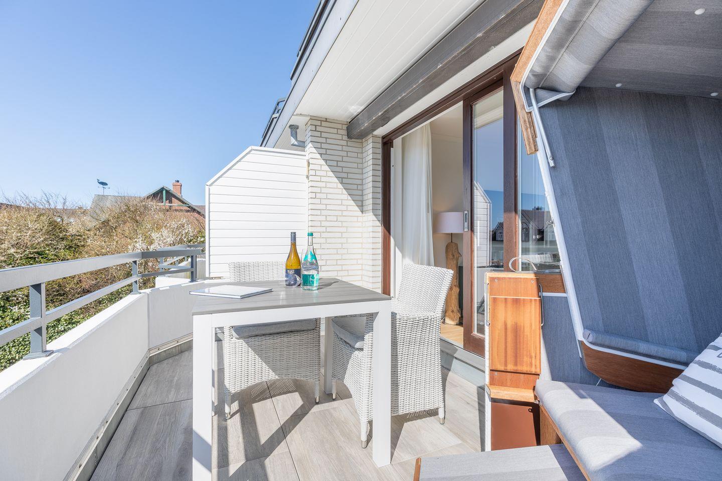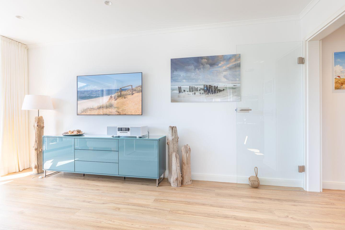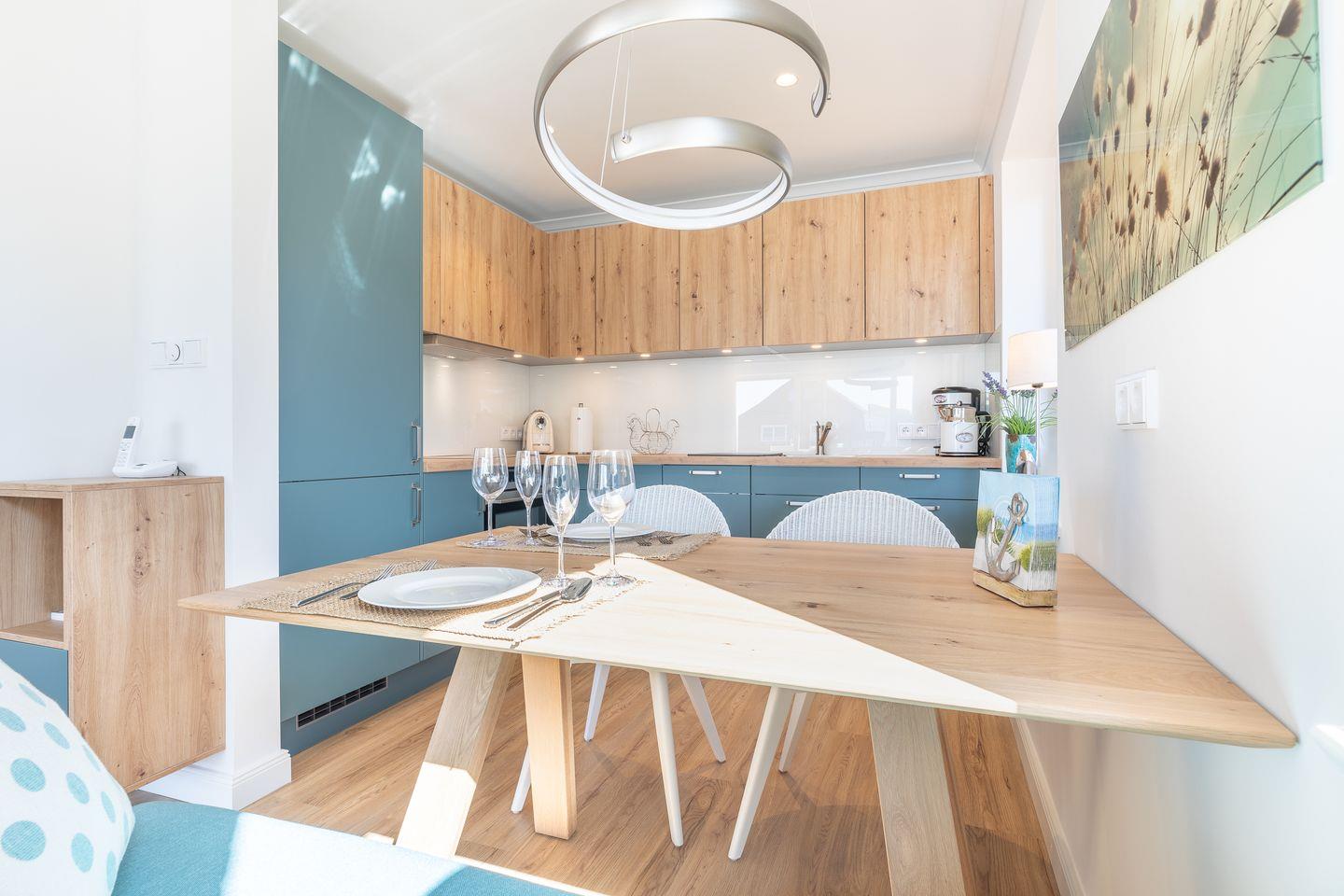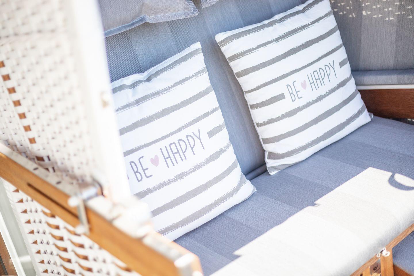 Wohnraum mit Flatscreen-TV, Sonoro-Anlage, W-Lan, Essbereich, offene Küche mit Microwelle-Backofen-Kombi, Induktionsherd, Geschirrspüler, Heißluftfritteuse, Filterkaffeemaschine, Nespresso-Kaffeemaschine. Balkon mit Balkonmöbeln (ca. April - Oktober) und Strandkorb. Ein Schlafraum mit Doppelbett und Flatscreen-TV. Ein Badezimmer mit Dusche und WC. Parkplatz am Hause, Nichtraucher, keine Haustiere erlaubt.