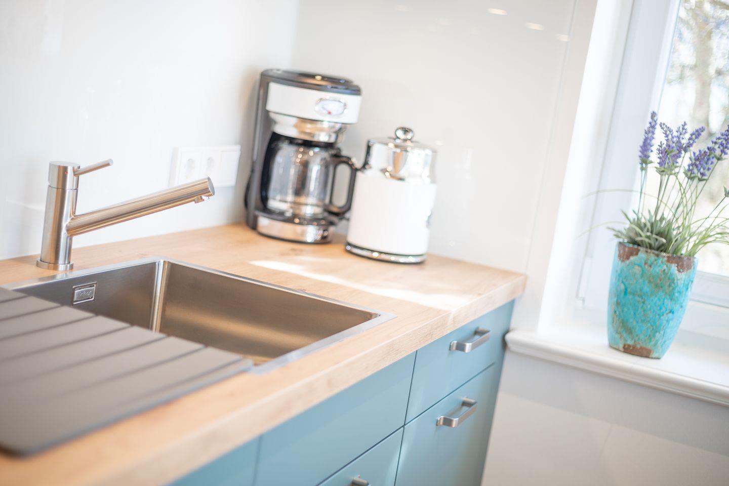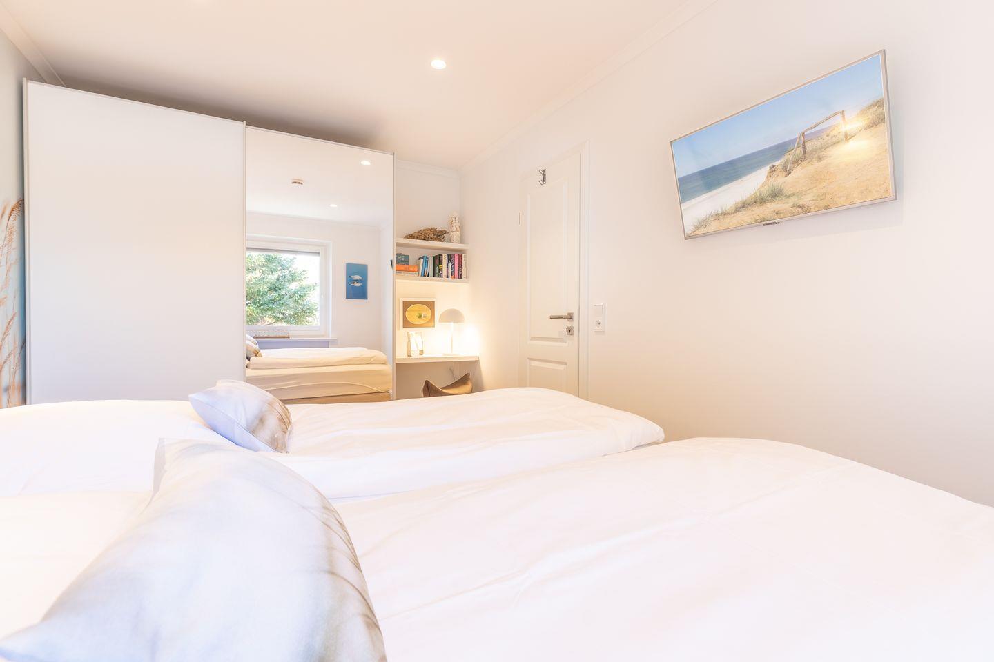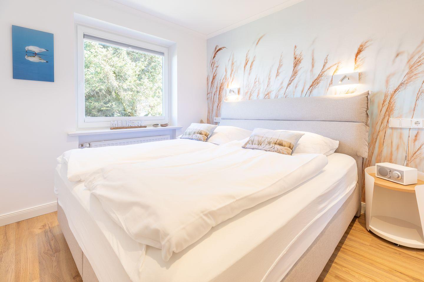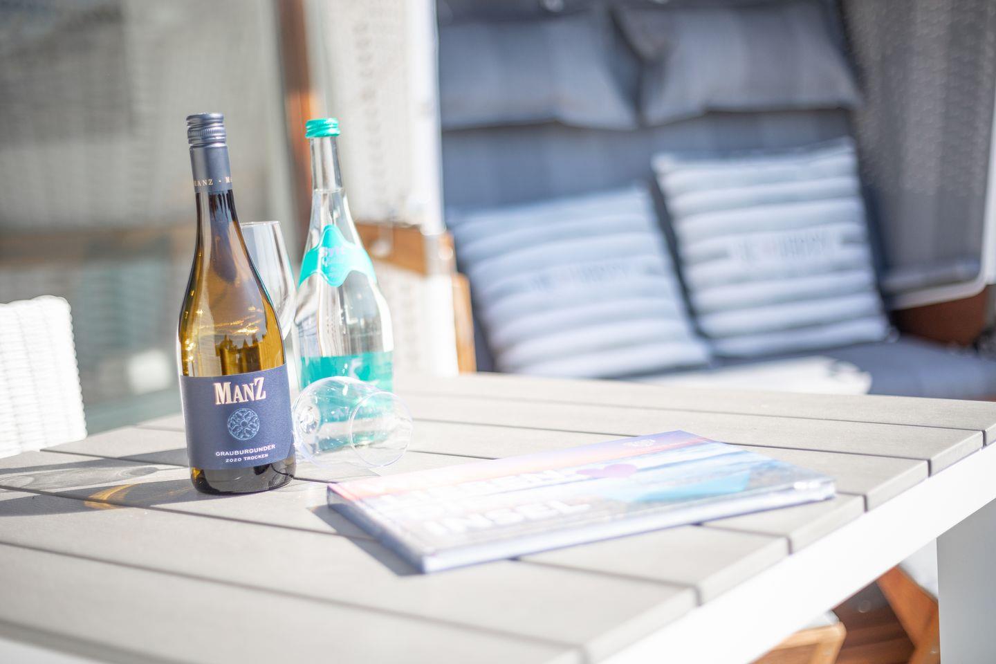 Wohnraum mit Flatscreen-TV, Sonoro-Anlage, W-Lan, Essbereich, offene Küche mit Microwelle-Backofen-Kombi, Induktionsherd, Geschirrspüler, Heißluftfritteuse, Filterkaffeemaschine, Nespresso-Kaffeemaschine. Balkon mit Balkonmöbeln (ca. April - Oktober) und Strandkorb. Ein Schlafraum mit Doppelbett und Flatscreen-TV. Ein Badezimmer mit Dusche und WC. Parkplatz am Hause, Nichtraucher, keine Haustiere erlaubt.