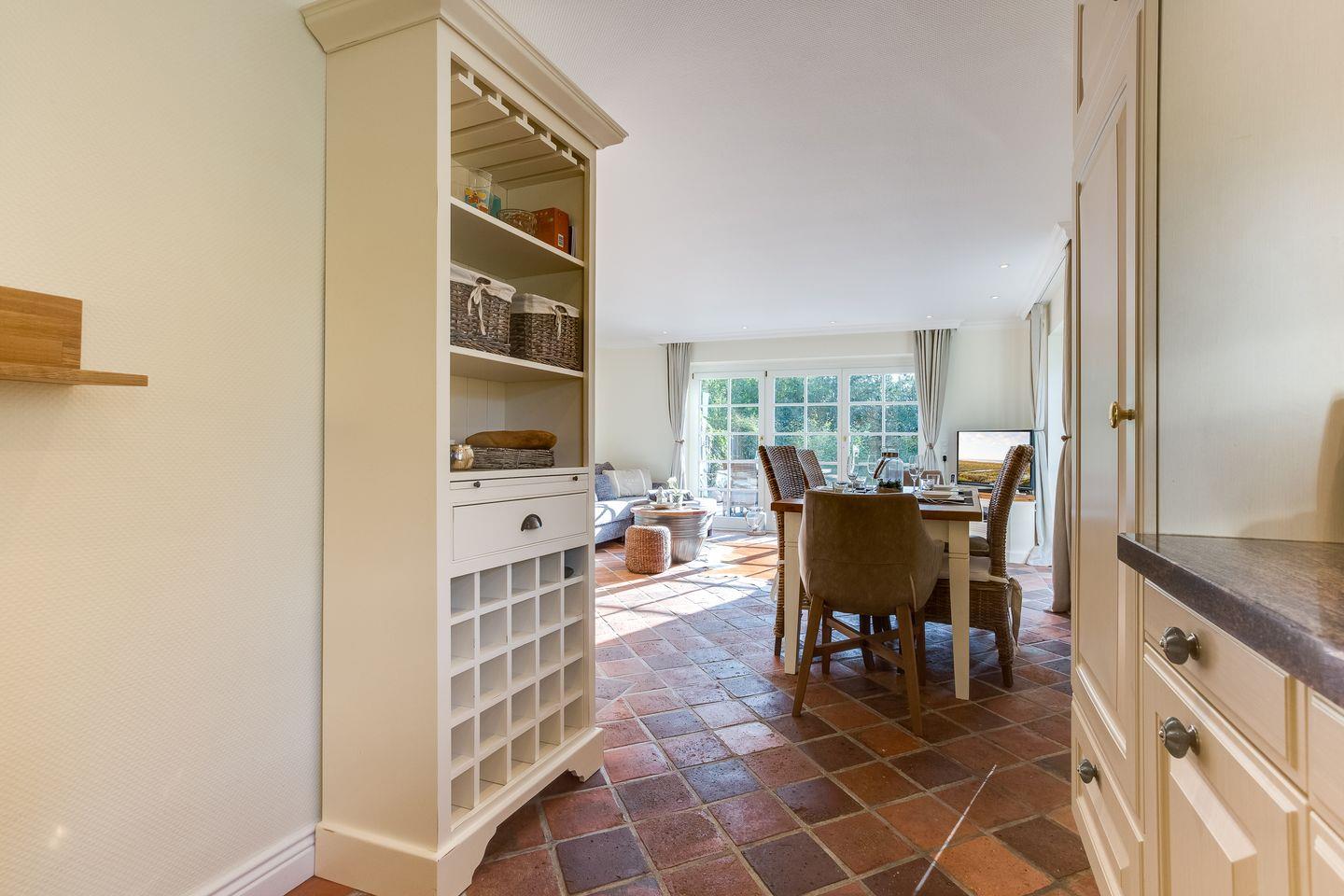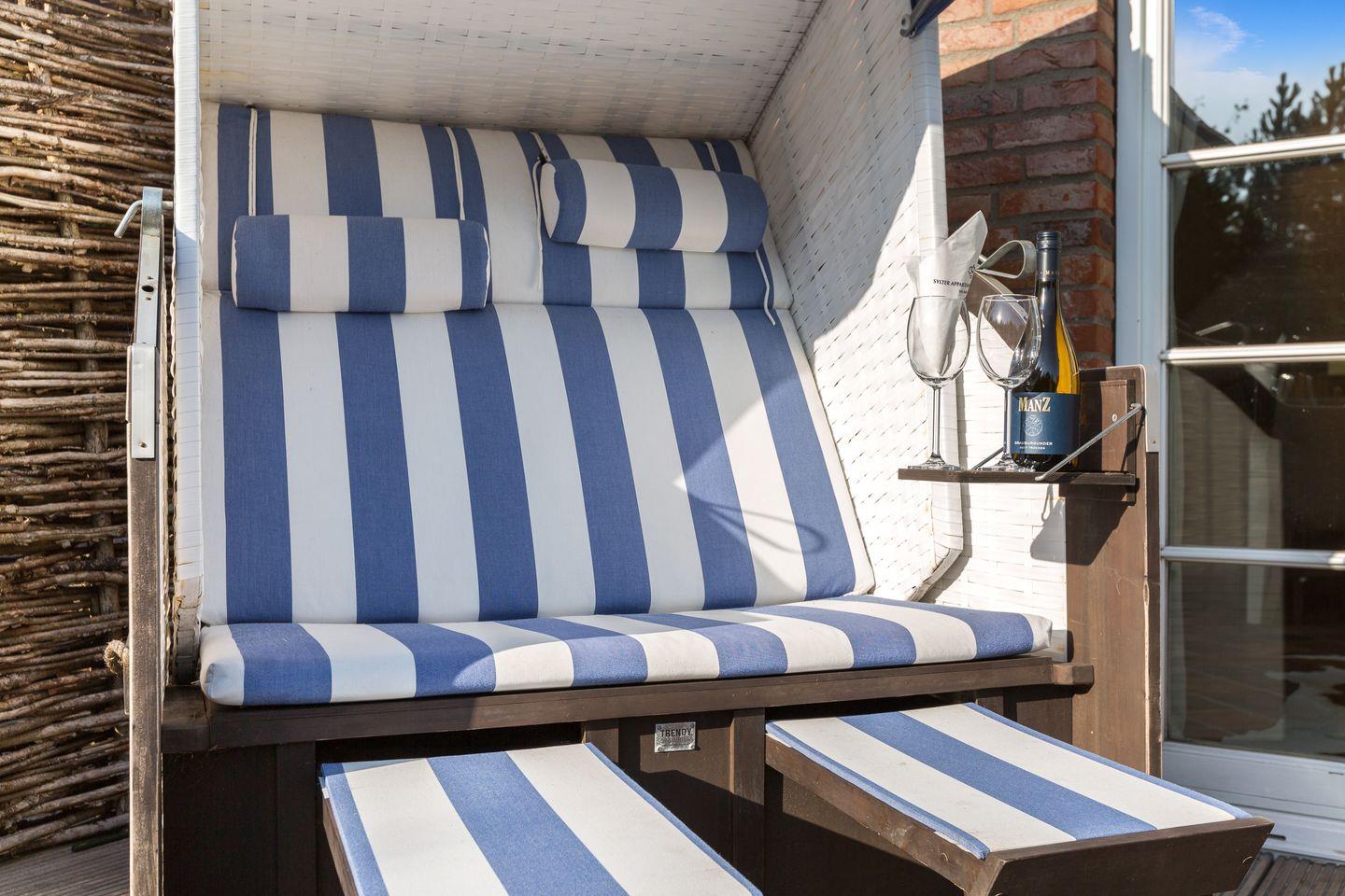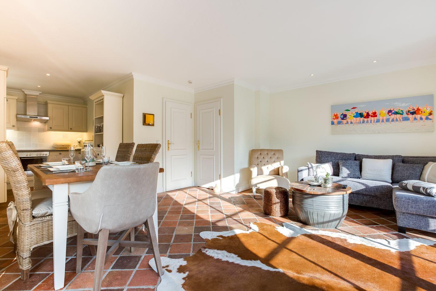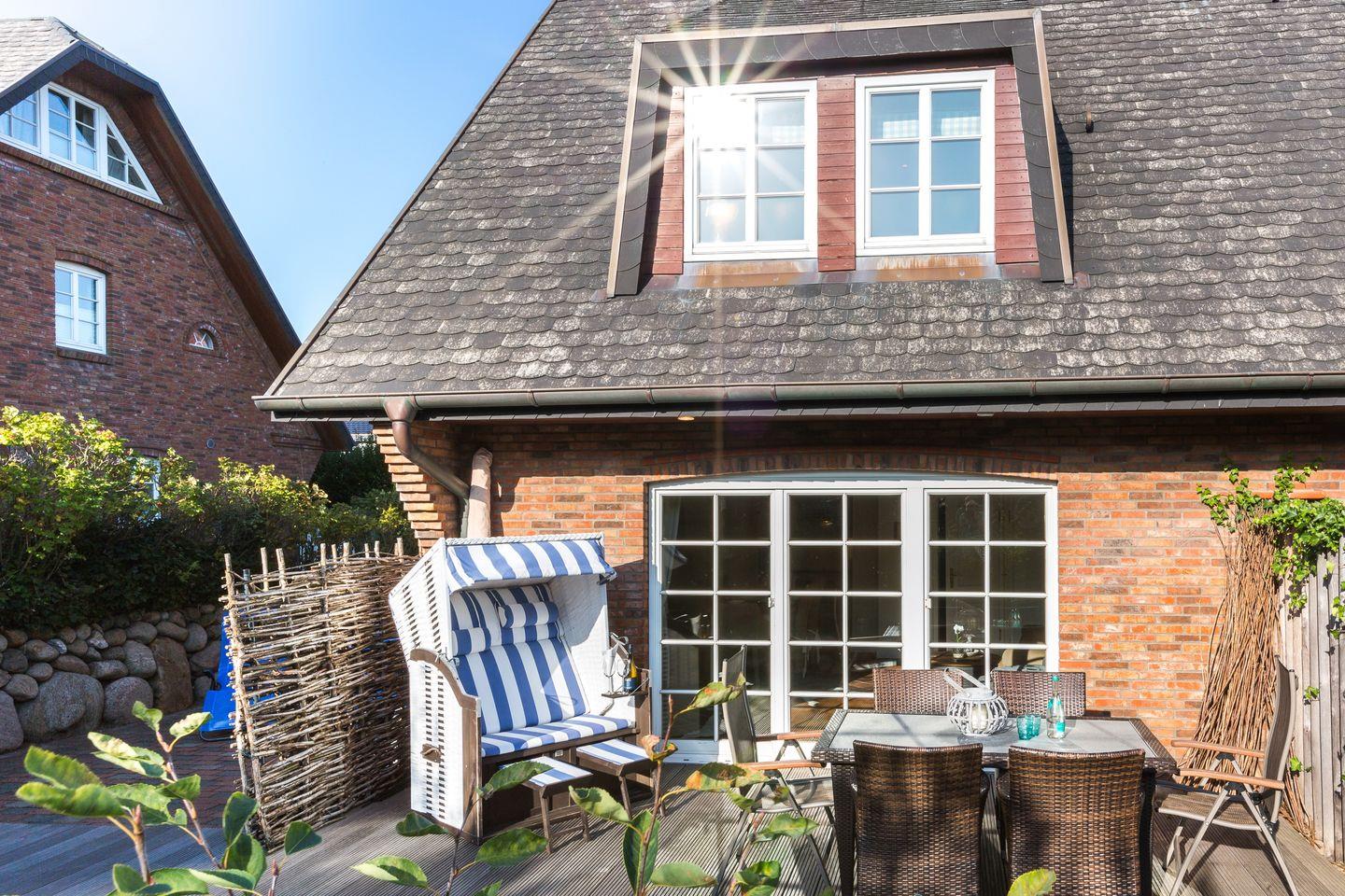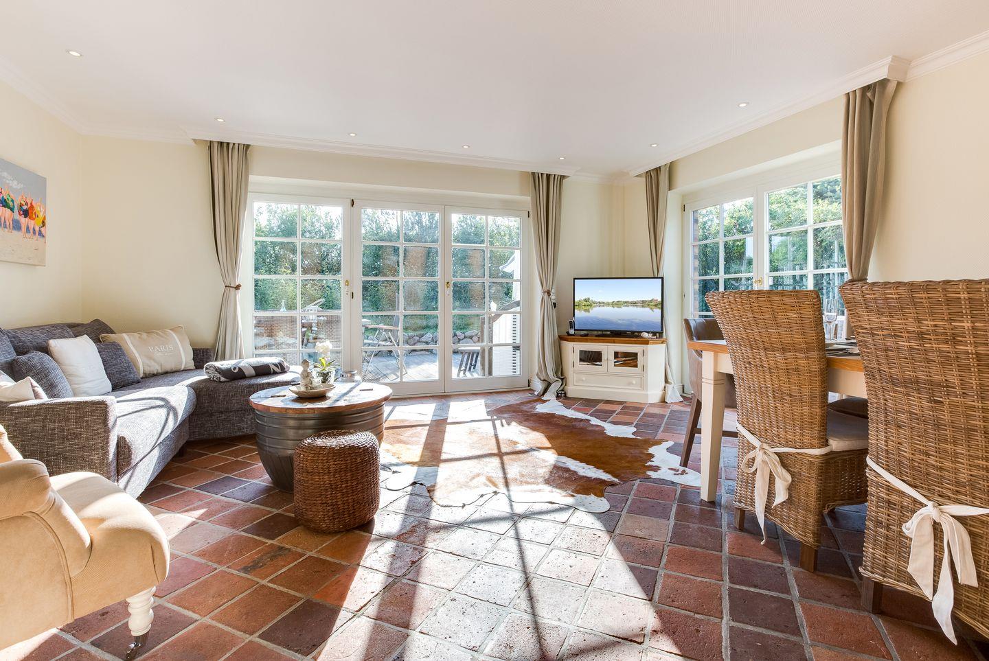 Vom großzügigen Wohnzimmer aus gelangen Sie auf Ihre möblierte Terrasse mit typischem Sylter Strandkorb, Esstisch und Sonnenliegen. Im Erdgeschoss befindet sich außerdem ein Badezimmer mit Dusche und ein großzügiger Eingangsbereich.
