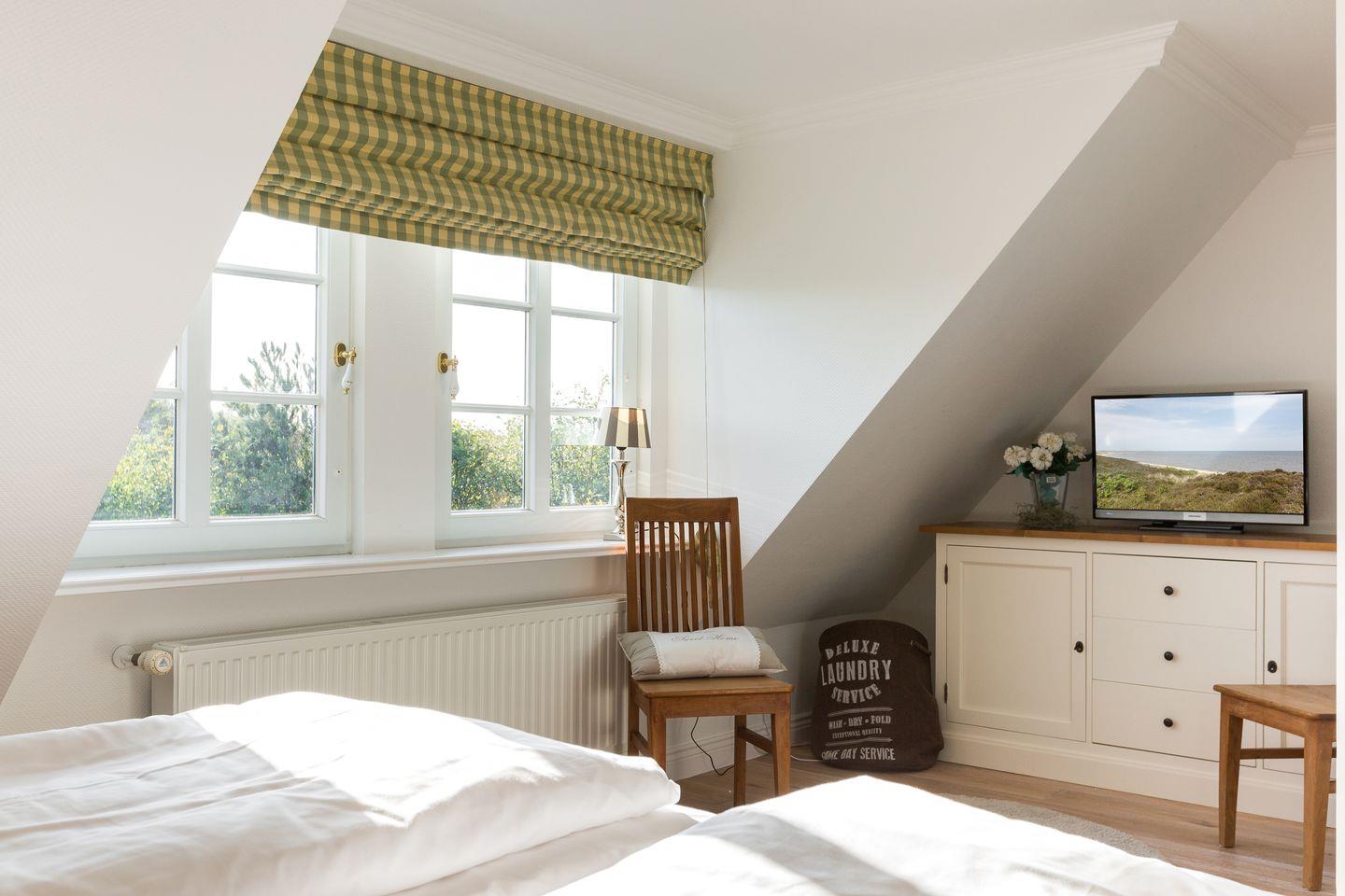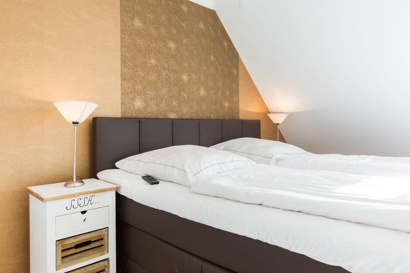 Über die Treppe erreichen Sie das Obergeschoss, in dem sich zwei Schlafzimmer mit jeweils einem Doppelbett (Boxspringbett) und TV befinden und ein weiteres Tageslichtbad mit Dusche.