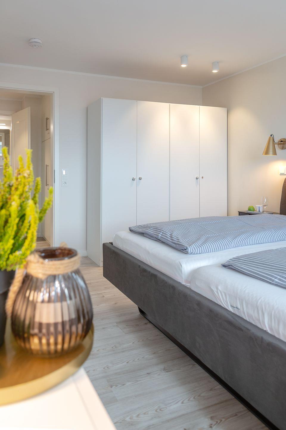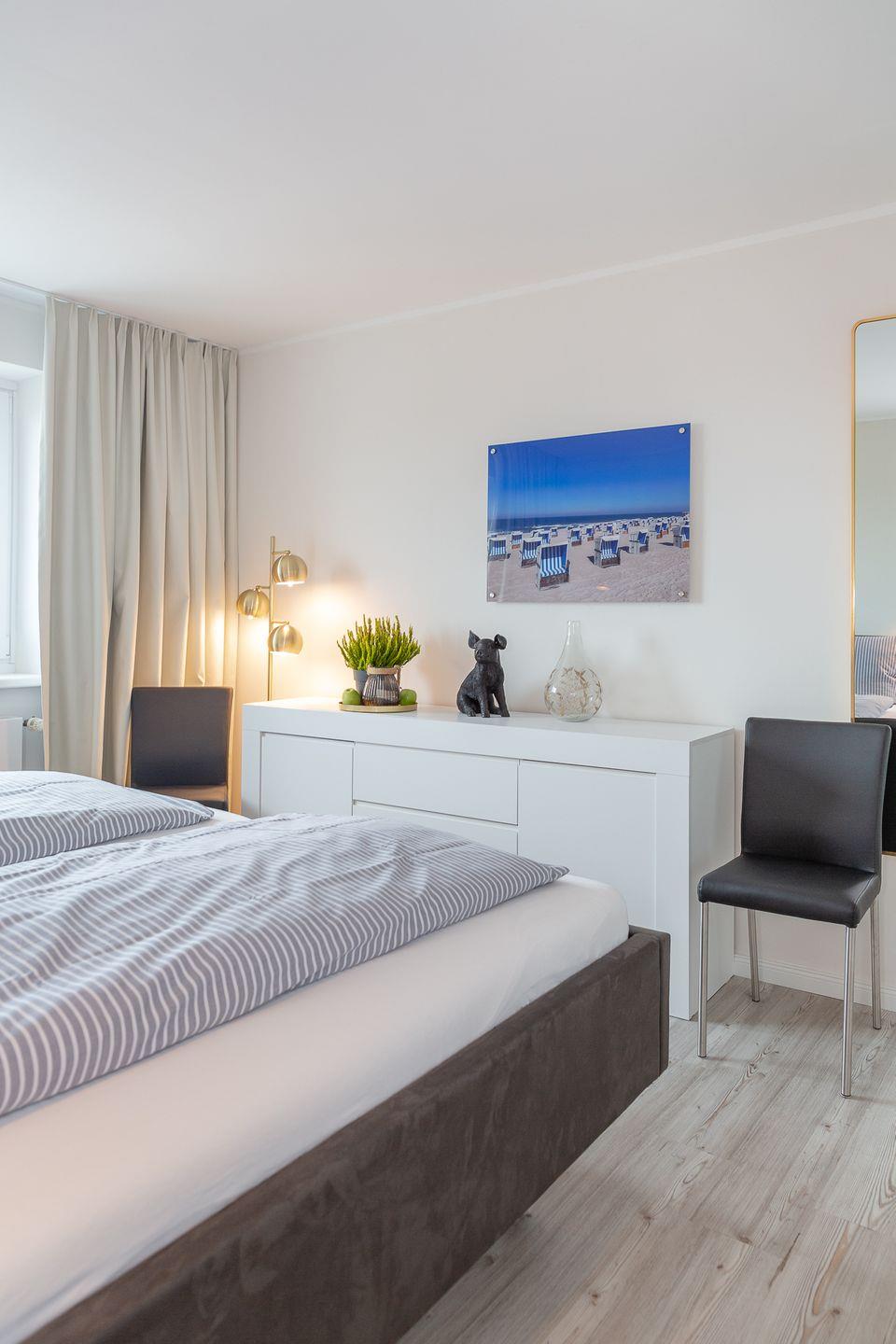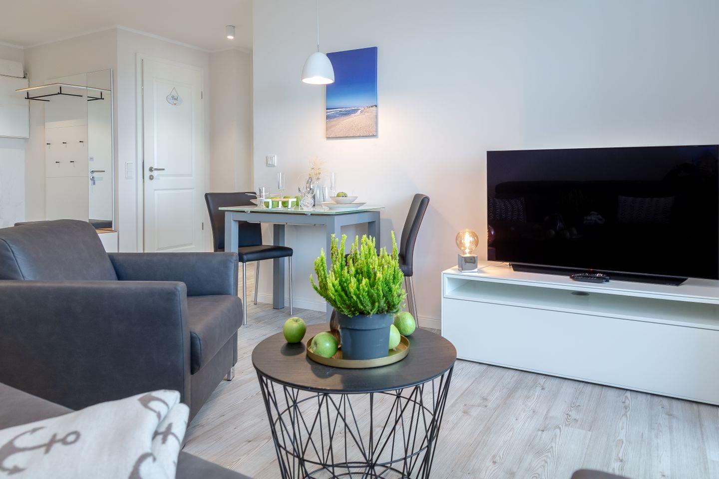 Wohnbereich mit Sofaecke, Loungesessel, gr. TV, Essplatz. Schlafzimmer mit Doppelbett (180 x 200cm), mit Tempur Matratze.