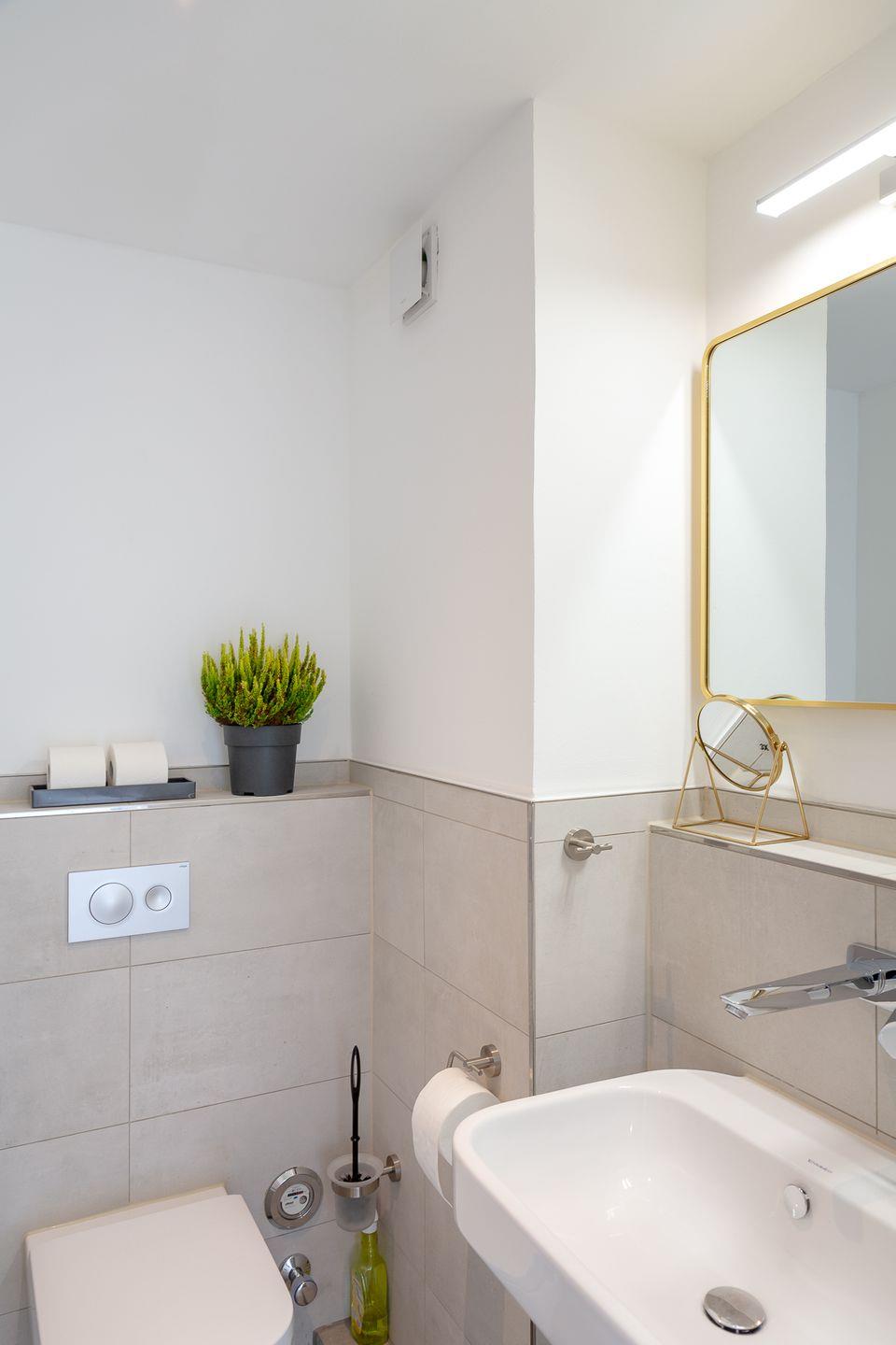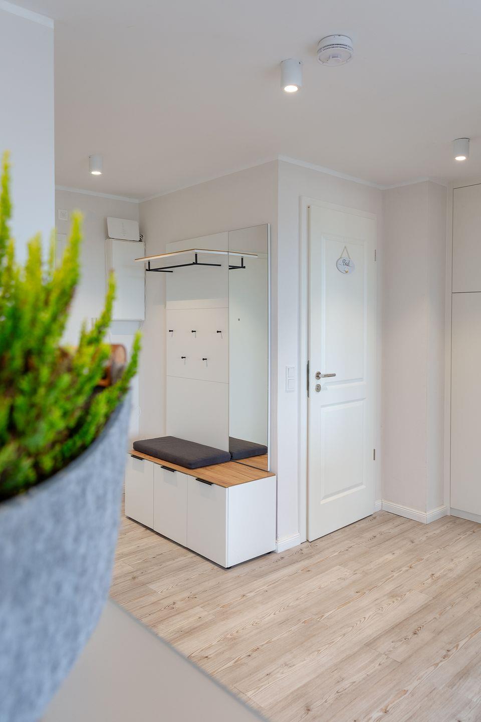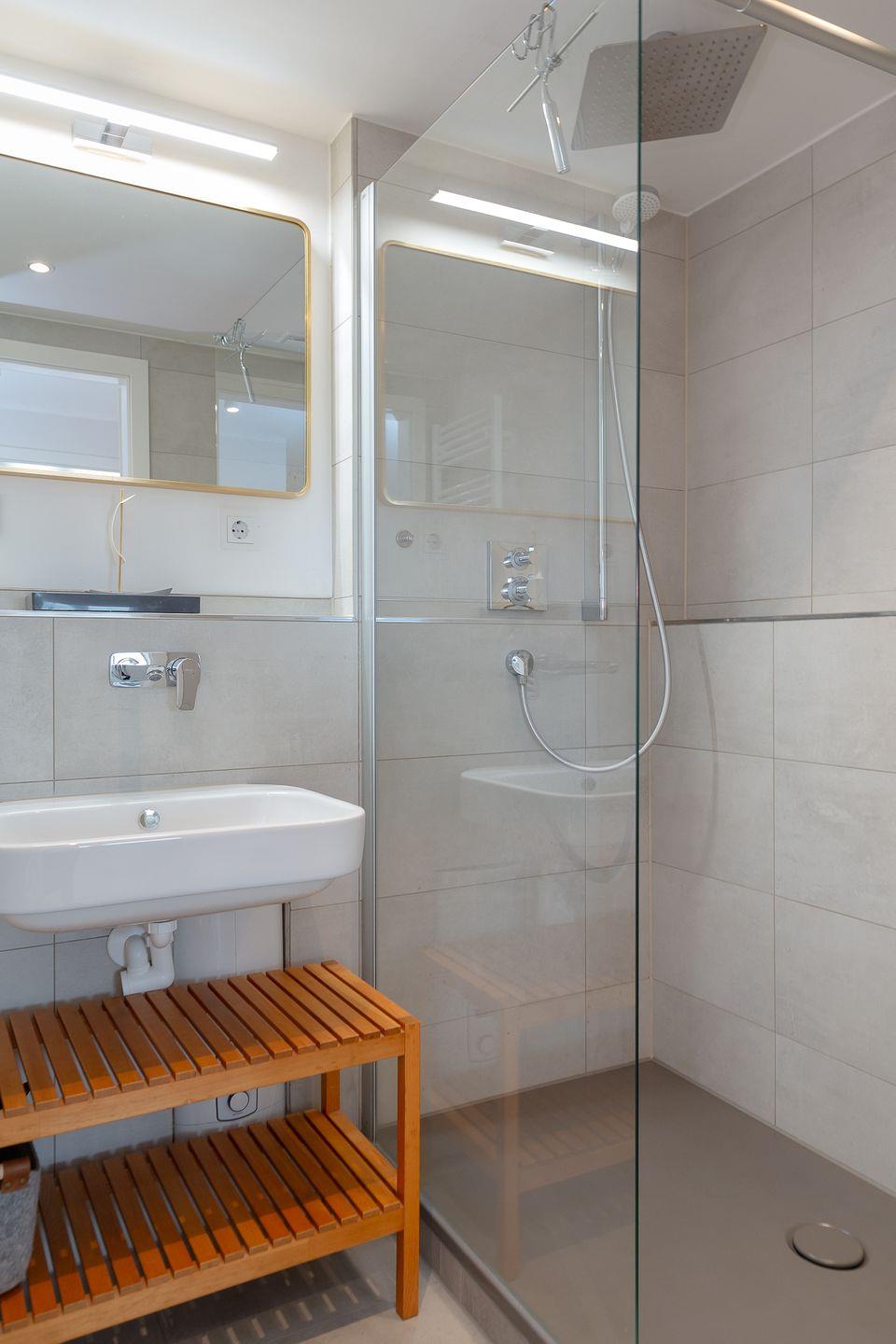 Die Aufteilung: Eingang / Flur mit Garderobe, neues modernes Duschbad mit bodentiefer Dusche, Handtuchtrockner, Handwaschbecken, Fön.