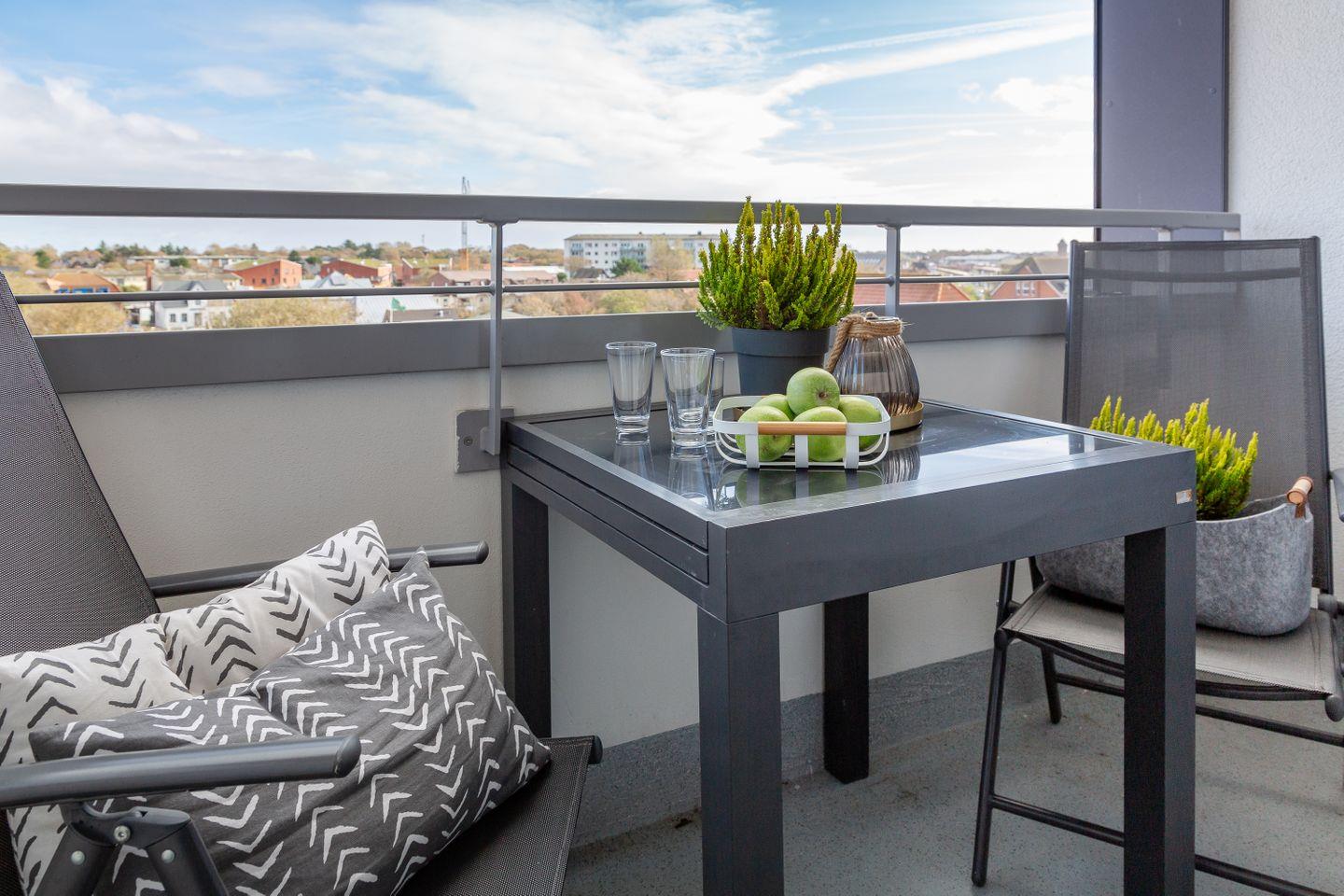 Der elegante offene Wohn / Essbereich ist angeschlossen an den nach Osten ausgerichteten Balkon.