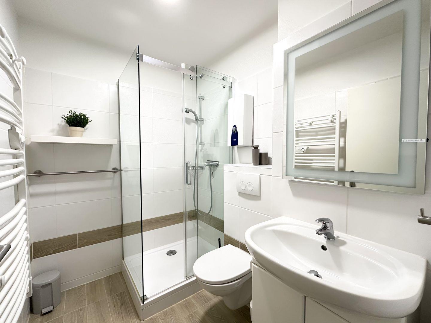 Das Badezimmer ist ebenfalls sehr hell gehalten und mit Dusche, WC, Handtuchwärmer, Föhn und einer Personenwaage ausgestattet.