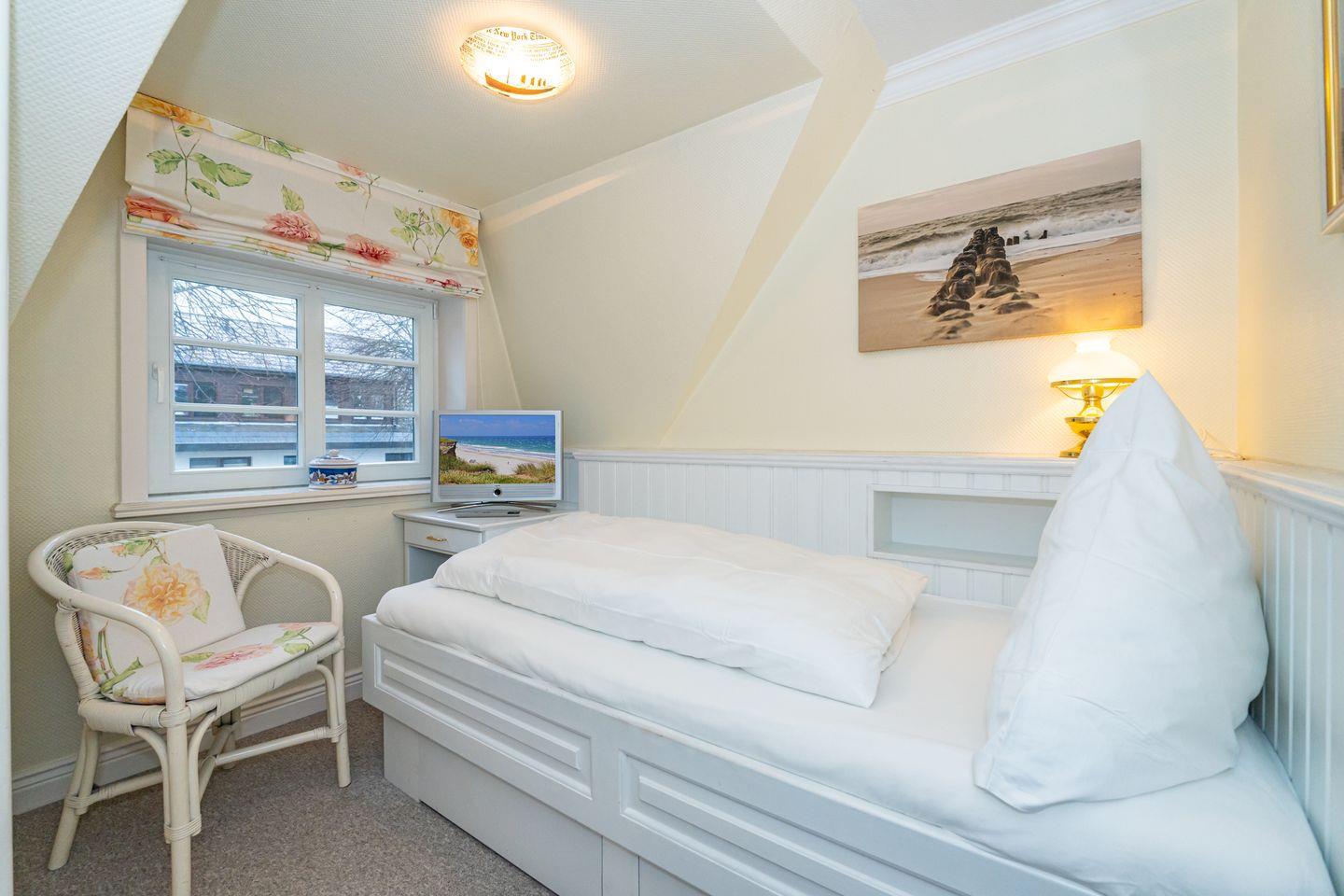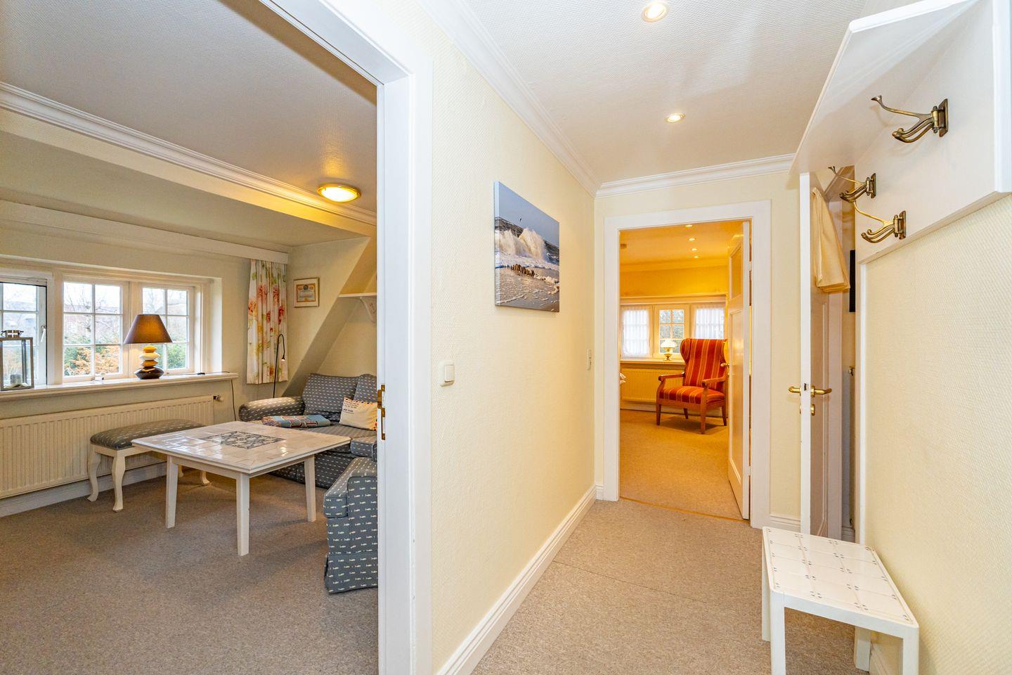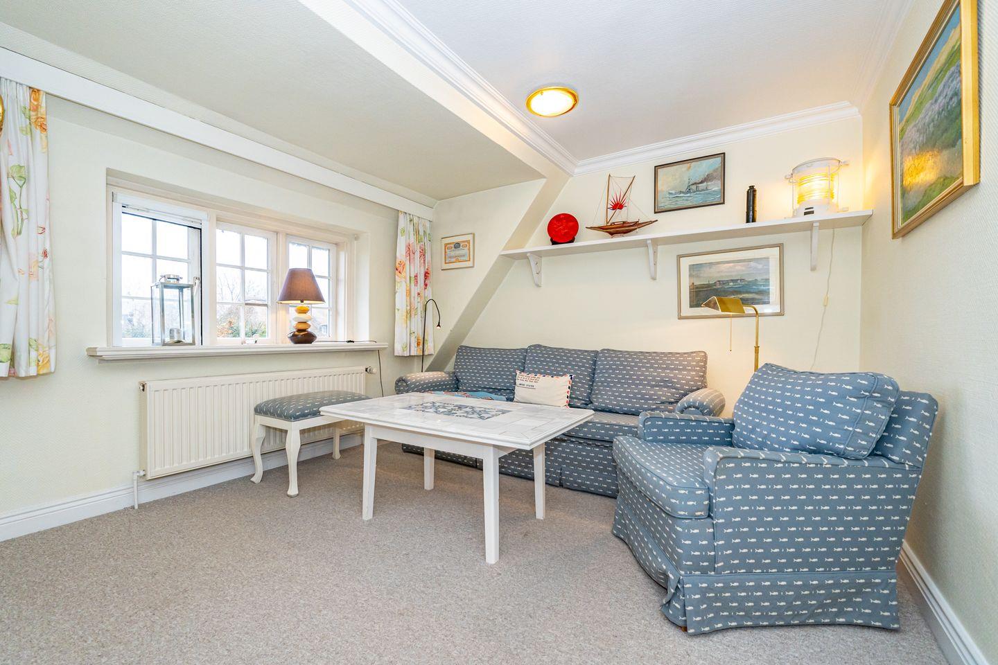 Diese friesische 3-Zimmer-Ferienwohnung liegt im Herzen von Keitum. Über eine Treppe gelangen Sie ins 1. OG, dort befindet sich die "Admiralswohnung". Vom Flur mit Garderobe haben Sie Zugang zu allen Räumen. Die Küche verfügt über einen Essplatz, Backofen, Geschirrspüler, Kühlschrank mit Gefrierfach und Nespressokapselmaschine. Im Wohnbereich erwartet Sie ein Sofa, Sessel und TV. Das erste Schlafzimmer ist ausgestattet mit einem Doppelbett und einem Kleiderschrank. Das zweite Schlafzimmer verfügt über ein Einzelbett und TV. Im lichtdurchfluteten Badezimmer erwartet Sie eine bodengleiche Dusche und WC. Ein PKW Stellplatz steht Ihnen am Haus zur Verfügung. Eine kleine Terrasse im Gemeinschaftsgarten des 3 Parteien Haus gehört zur Ferienwohnung "Admiral"
