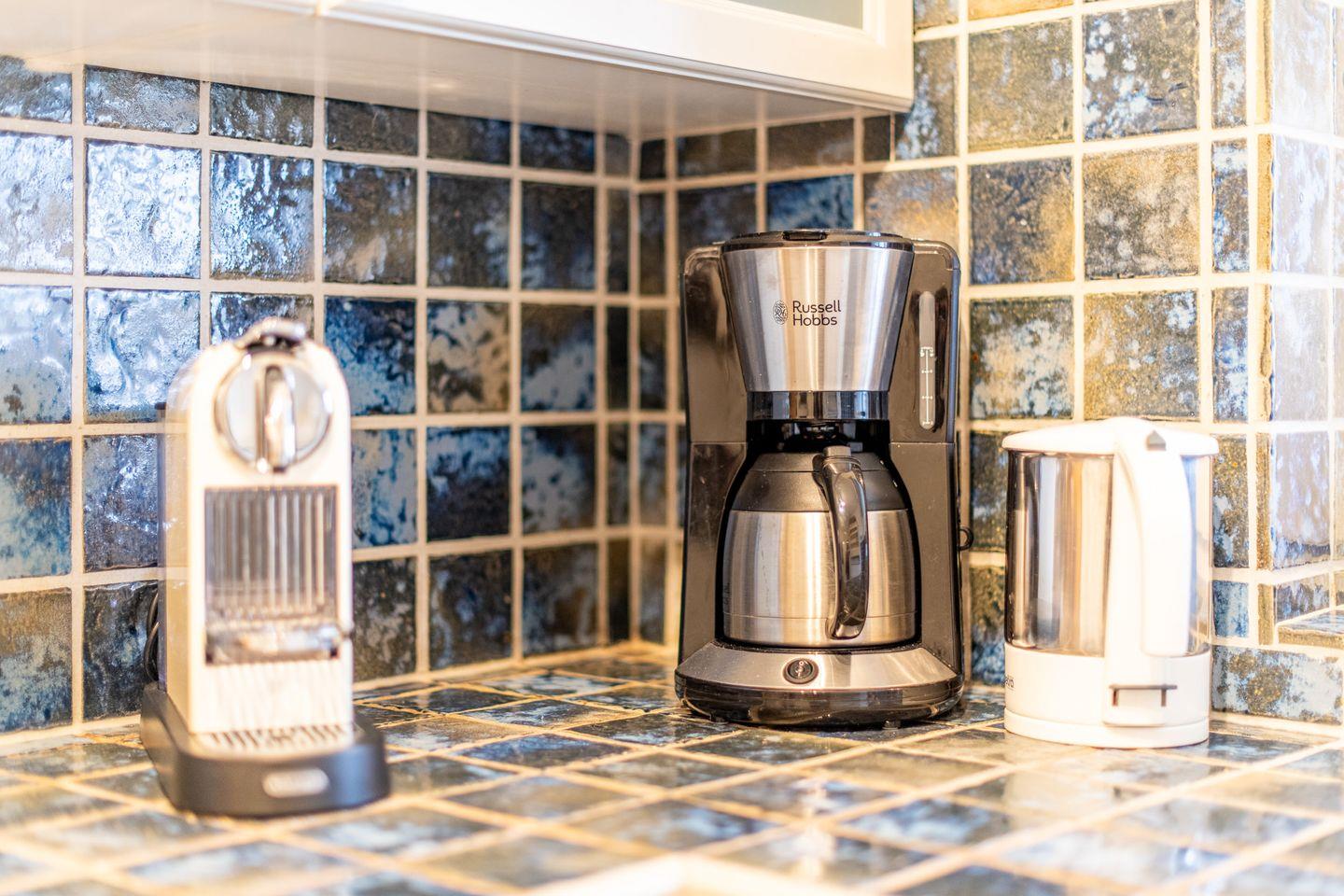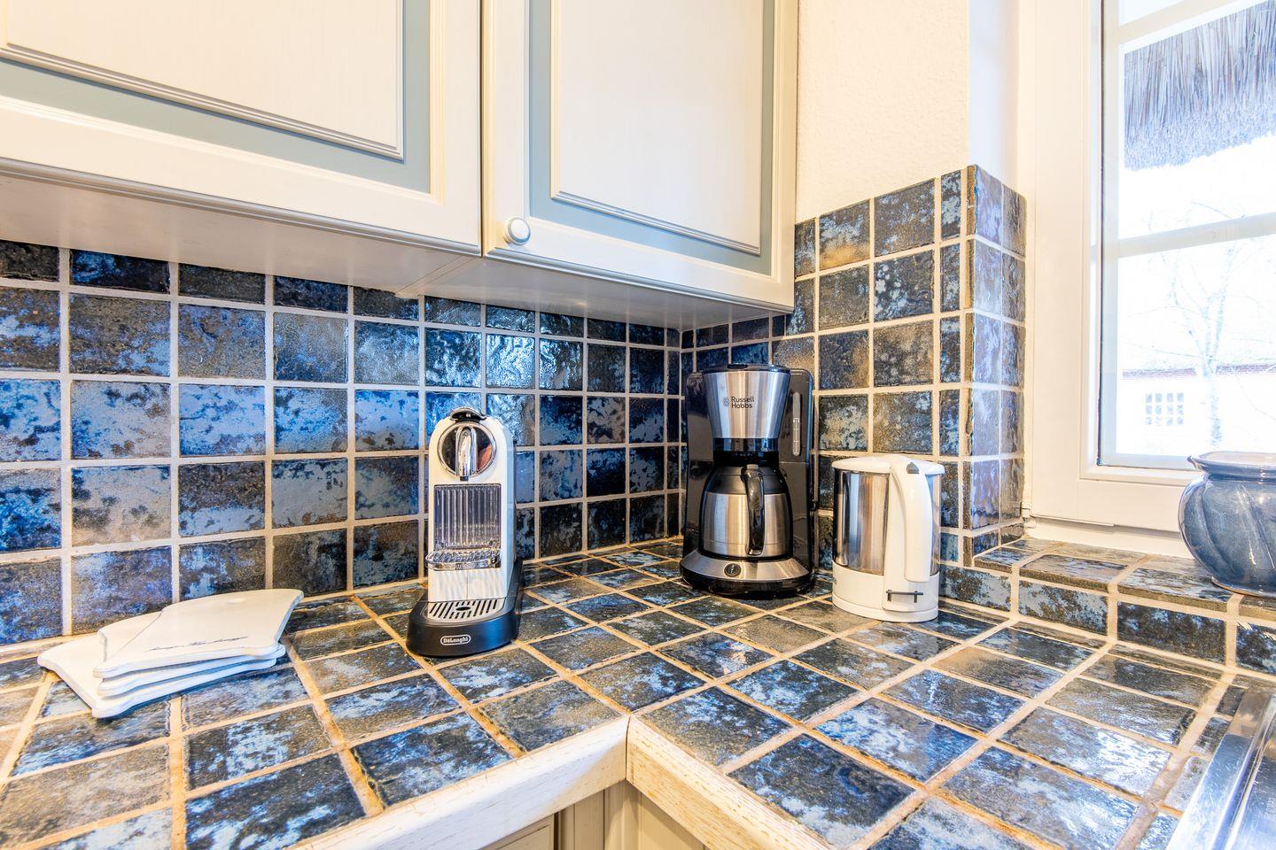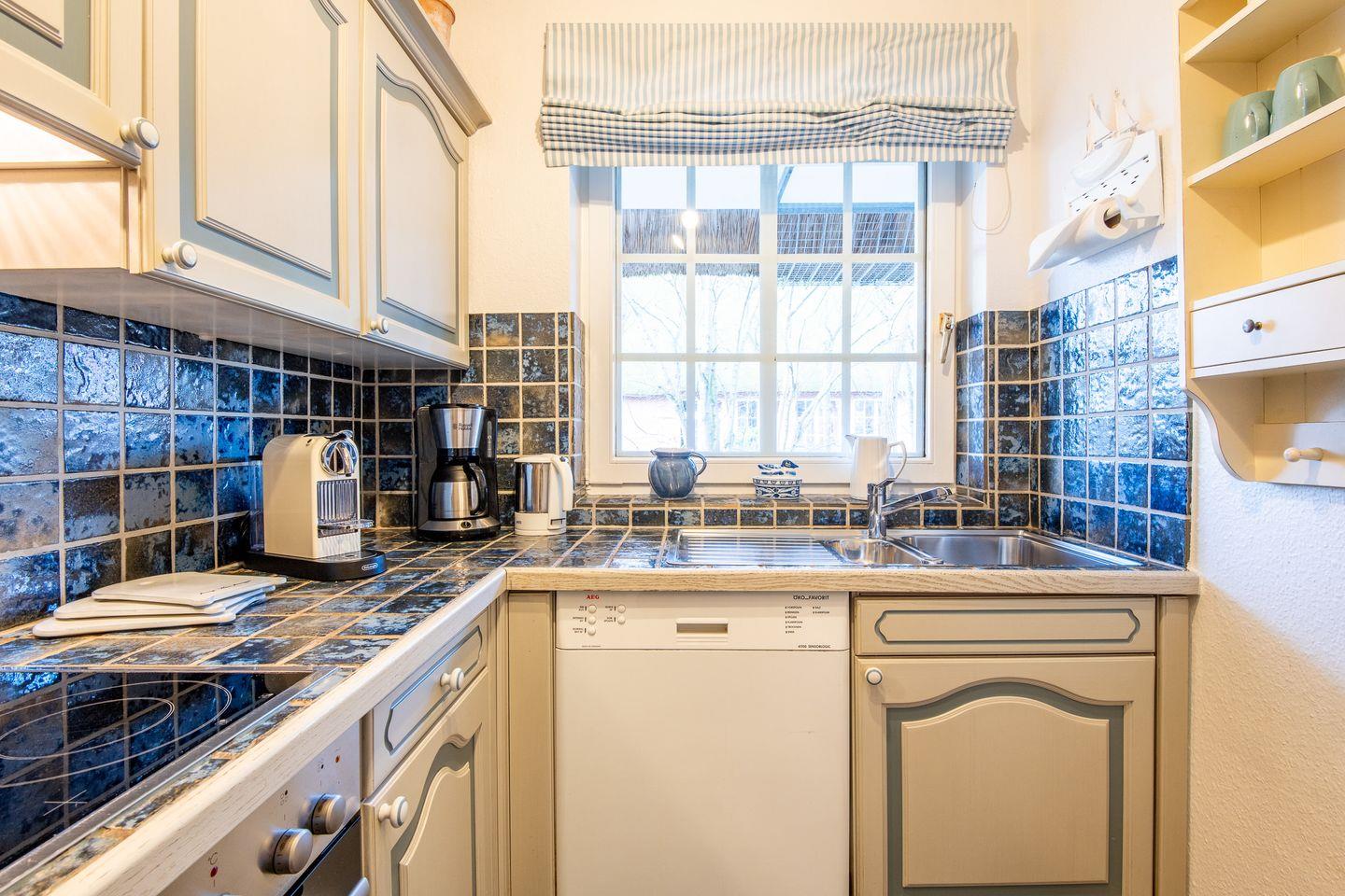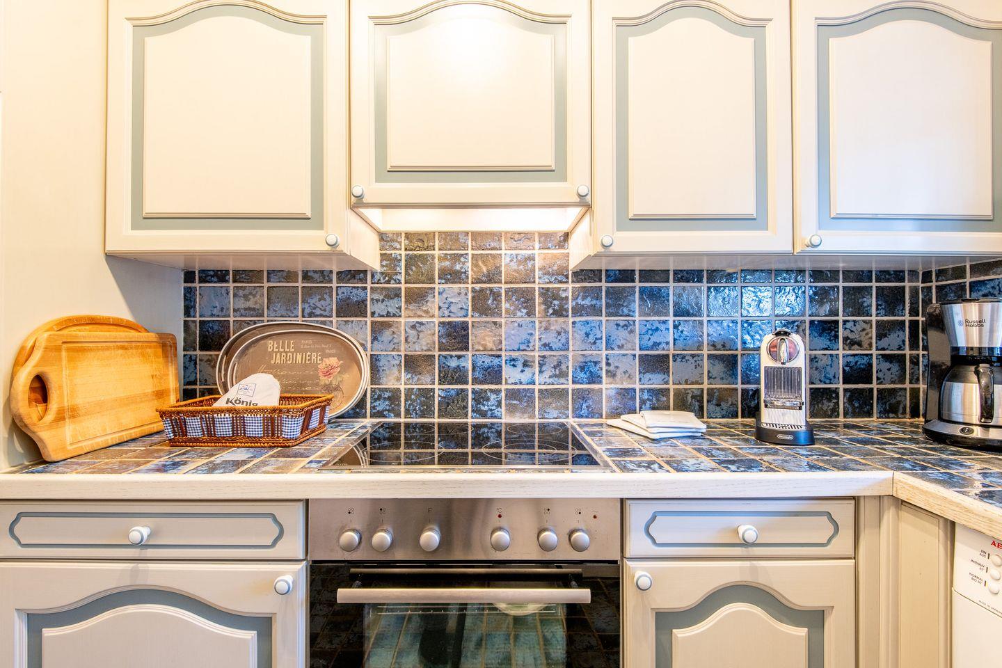 Die Küche ist separat gehalten und hochwertig ausgestattet. Ein Cerankochfeld, Backofen, Geschirrspüler und eine Filter-Kaffeemaschine bieten alles, was Sie zur Zubereitung Ihrer Lieblingsgerichte benötigen.