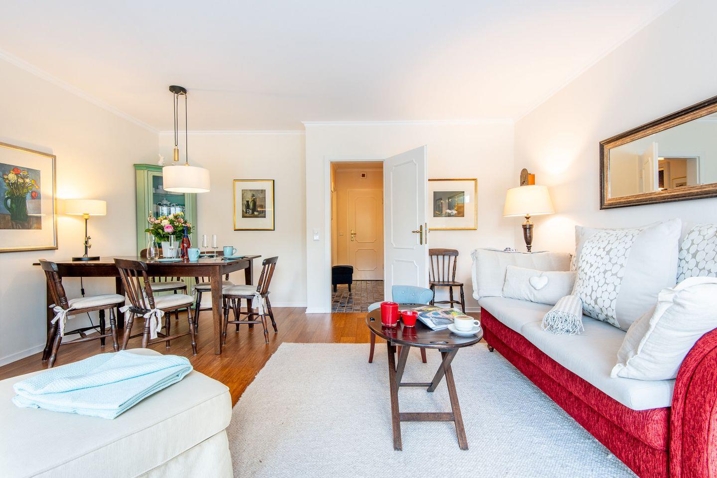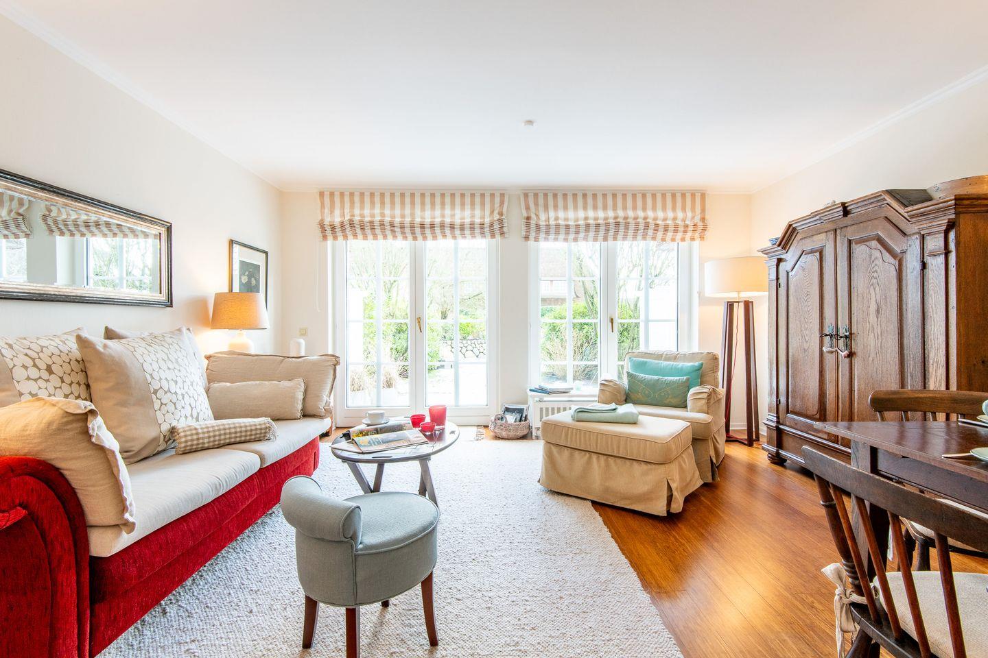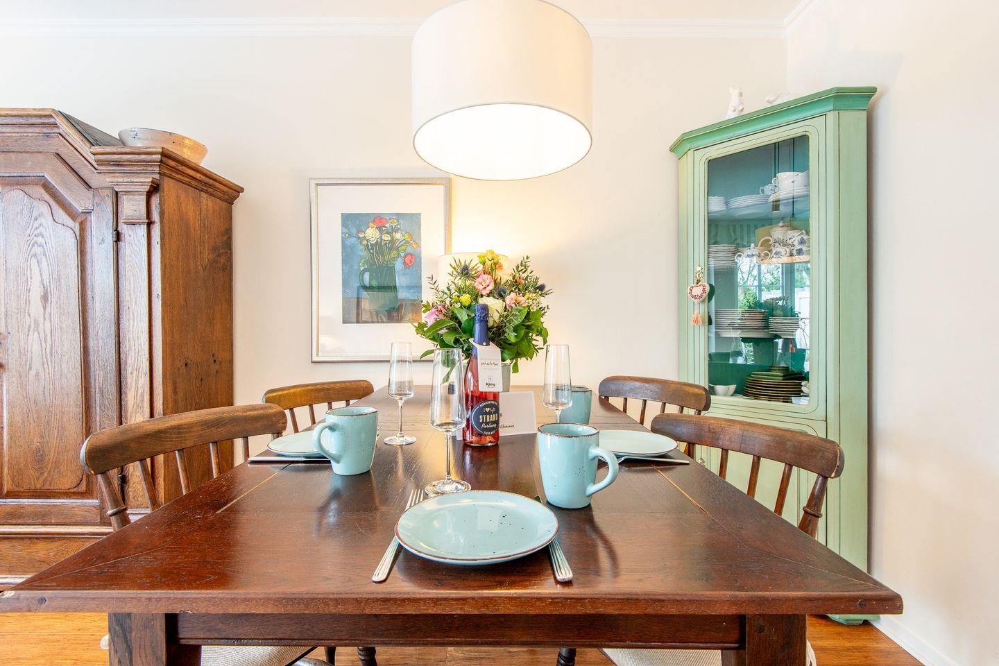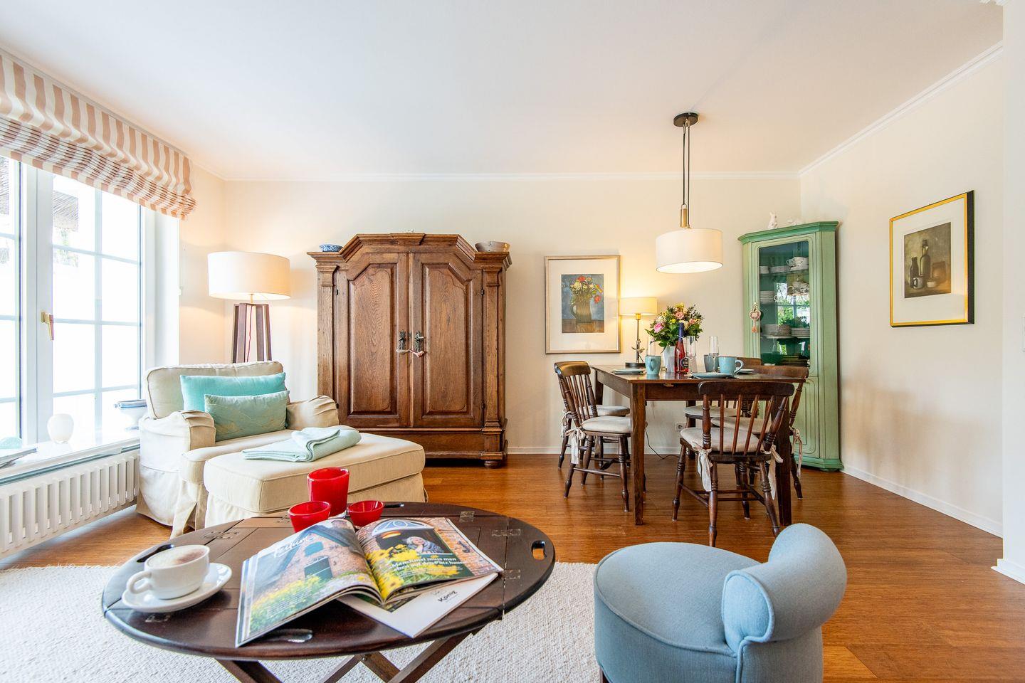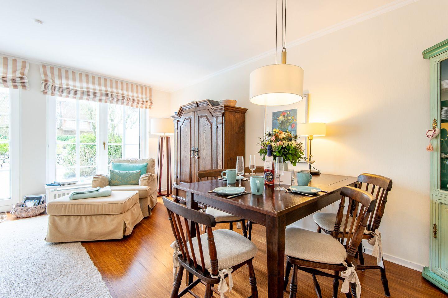 Das helle Wohn- und Esszimmer lädt zum Entspannen und Beisammensein ein. Durch den direkten Zugang zur Terrasse und dem kleinen Gartenanteil können Sie die frische Nordseeluft auch im Strandkorb genießen – ideal für ruhige Abende im Freien. Der gemütliche Essbereich bietet den perfekten Rahmen für gemeinsame Mahlzeiten.