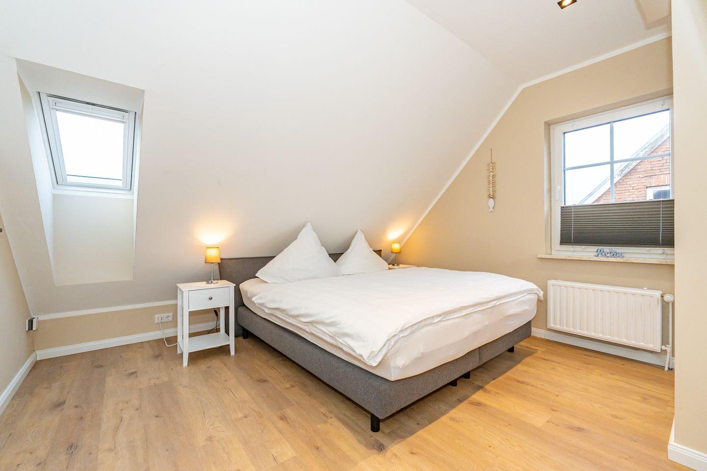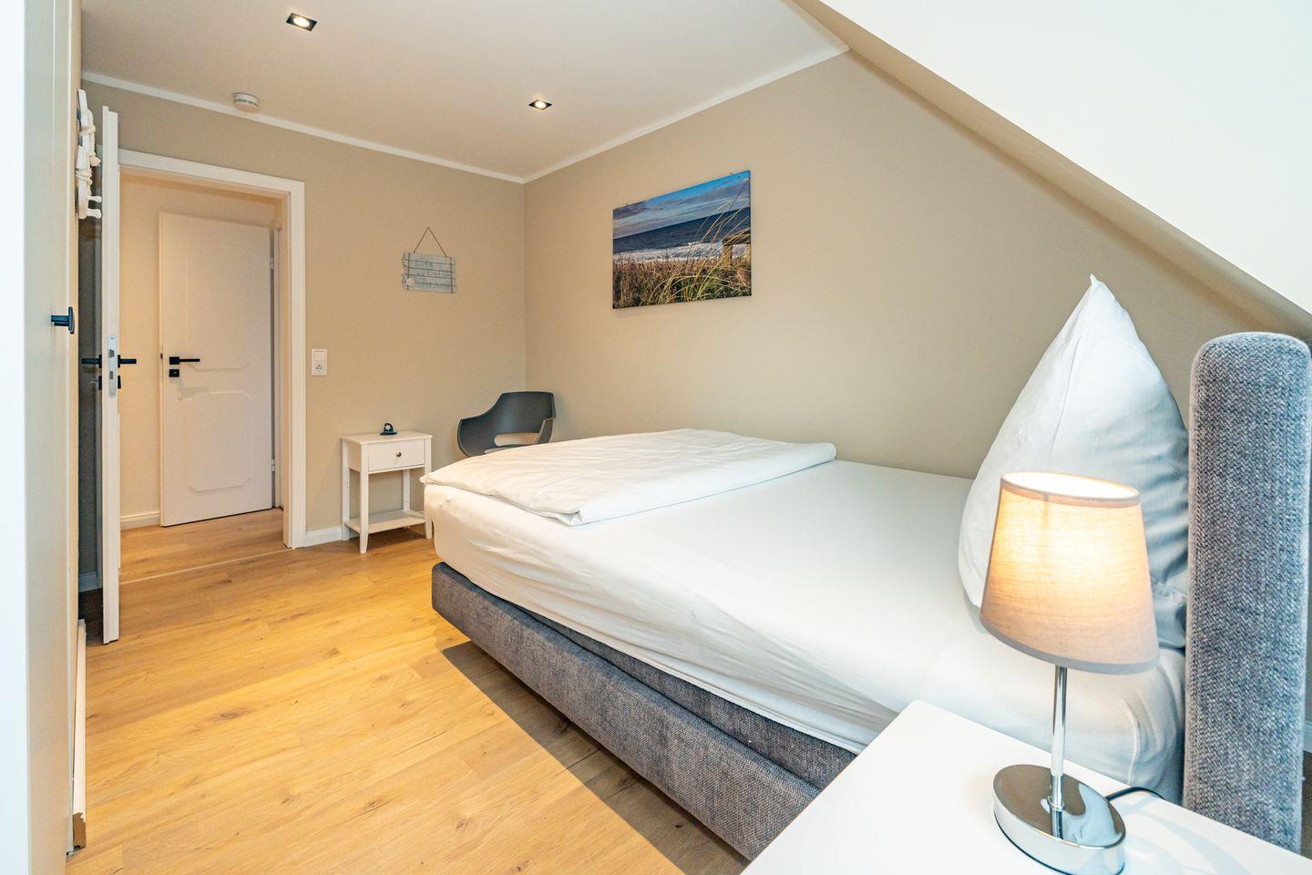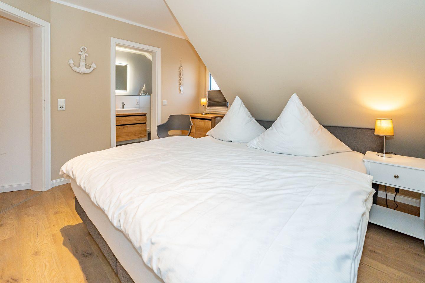 Im Dachgeschoss ist das vierte Schlafzimmer mit einem Doppelbett (180x200) und eigenem Wannenbad. Ein Waschtrockner ist ebenfalls für Sie vorhanden.