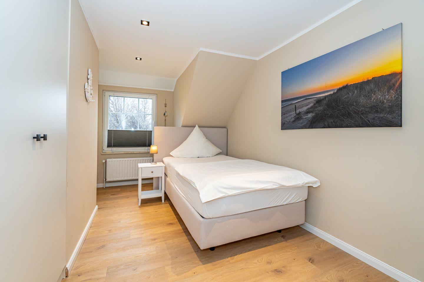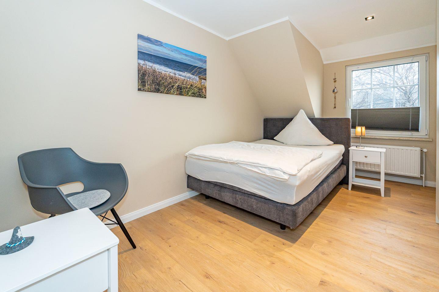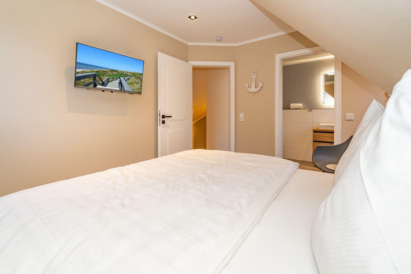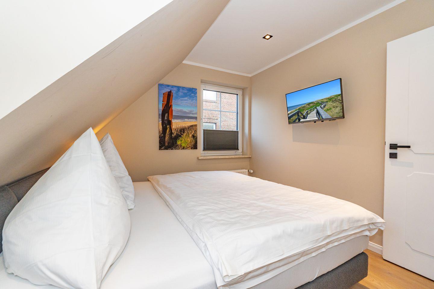 Im Dachgeschoss ist das vierte Schlafzimmer mit einem Doppelbett (180x200) und eigenem Wannenbad. Ein Waschtrockner ist ebenfalls für Sie vorhanden.