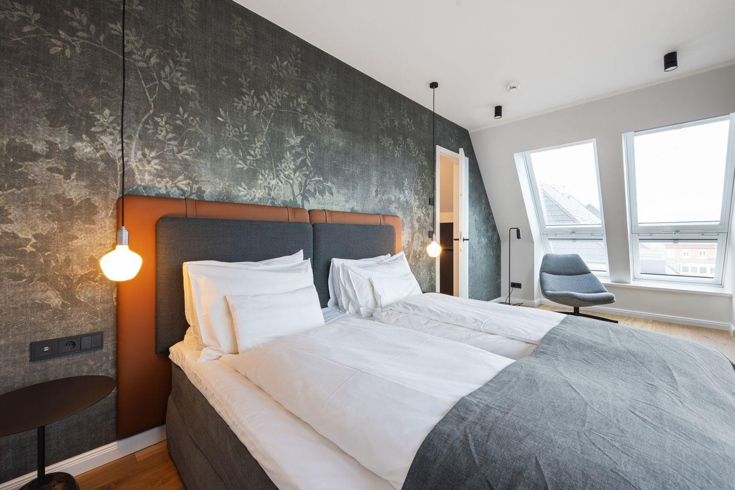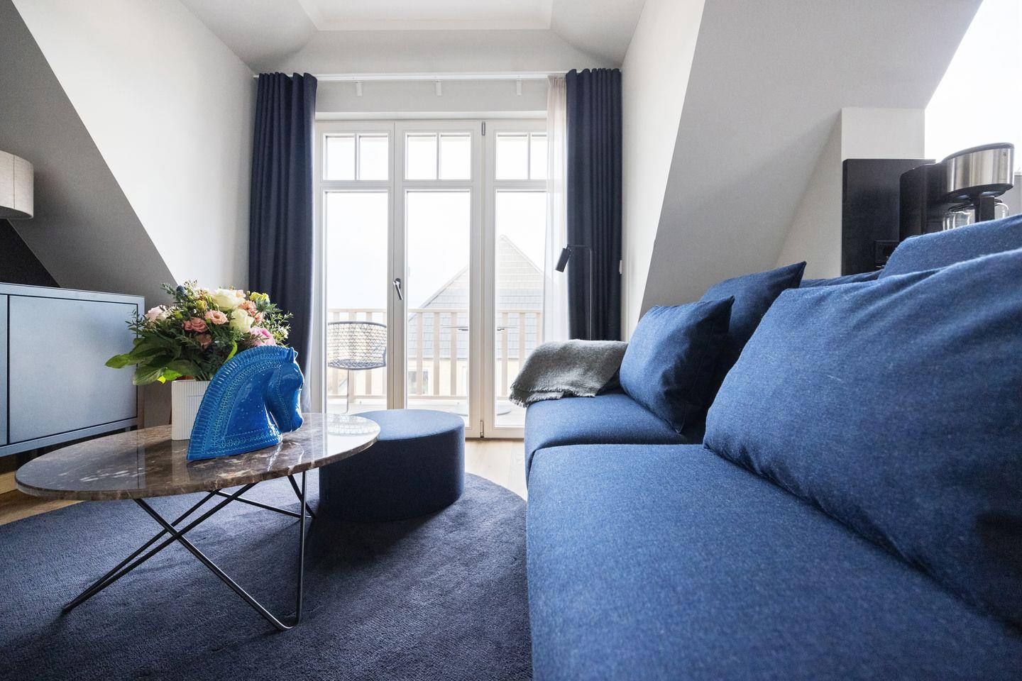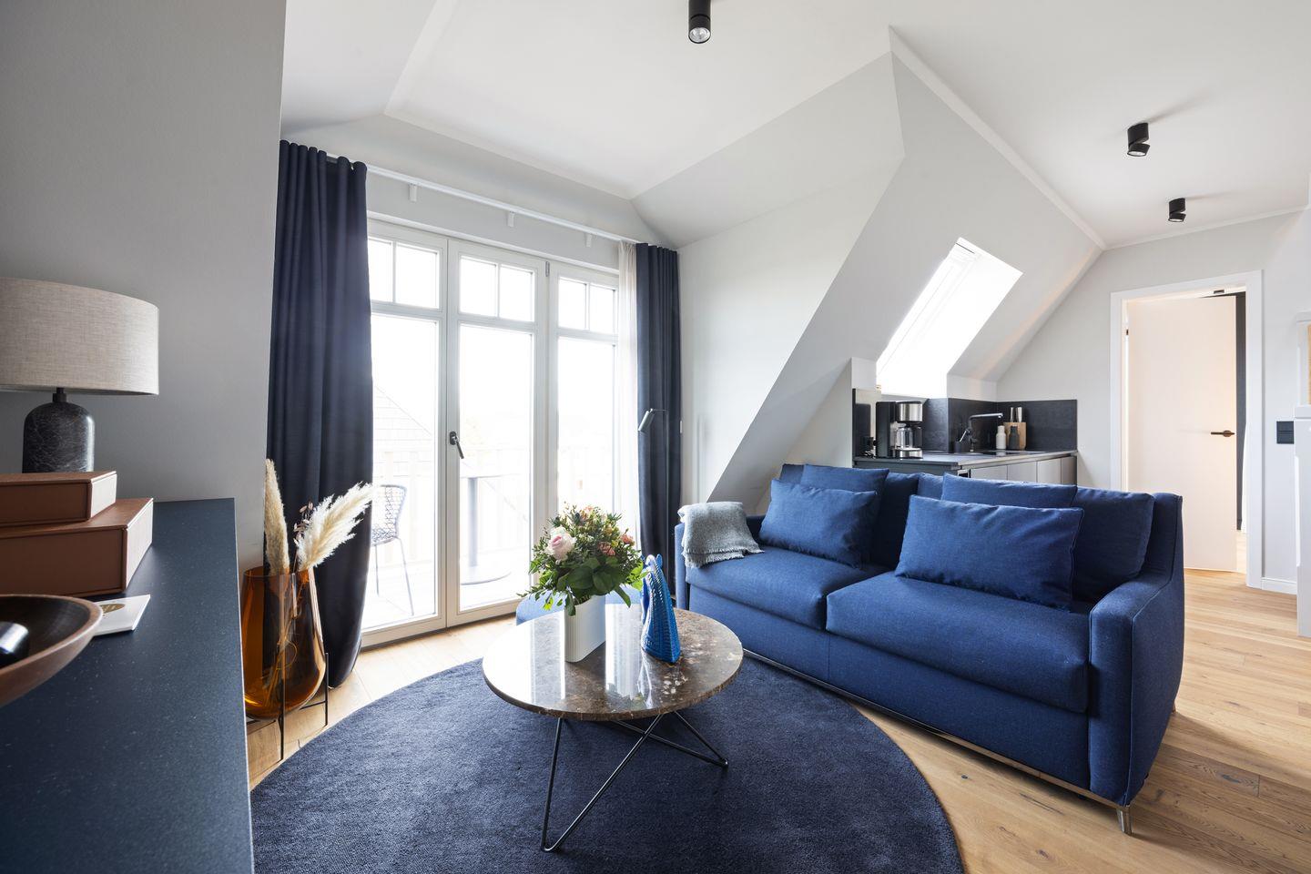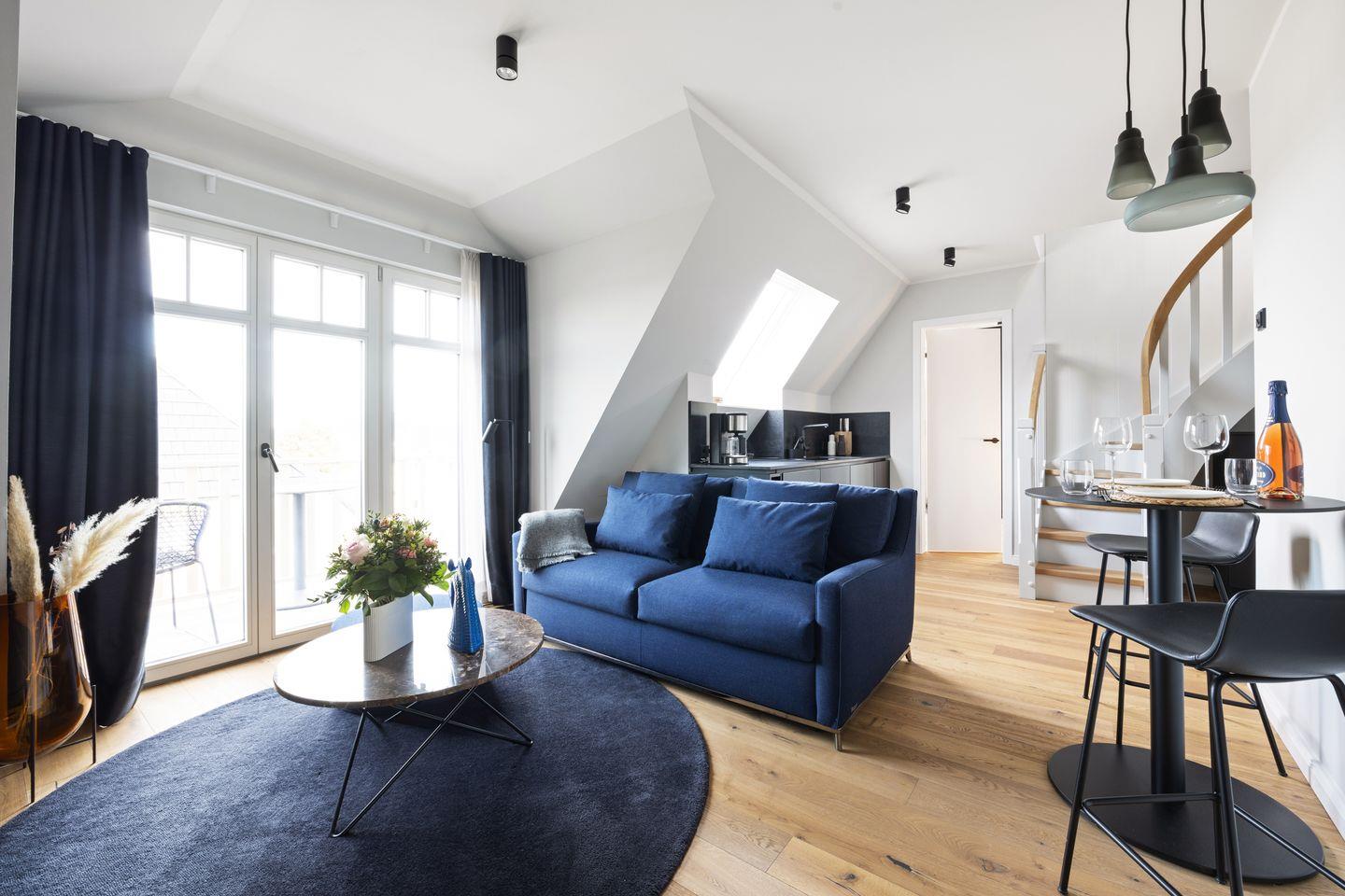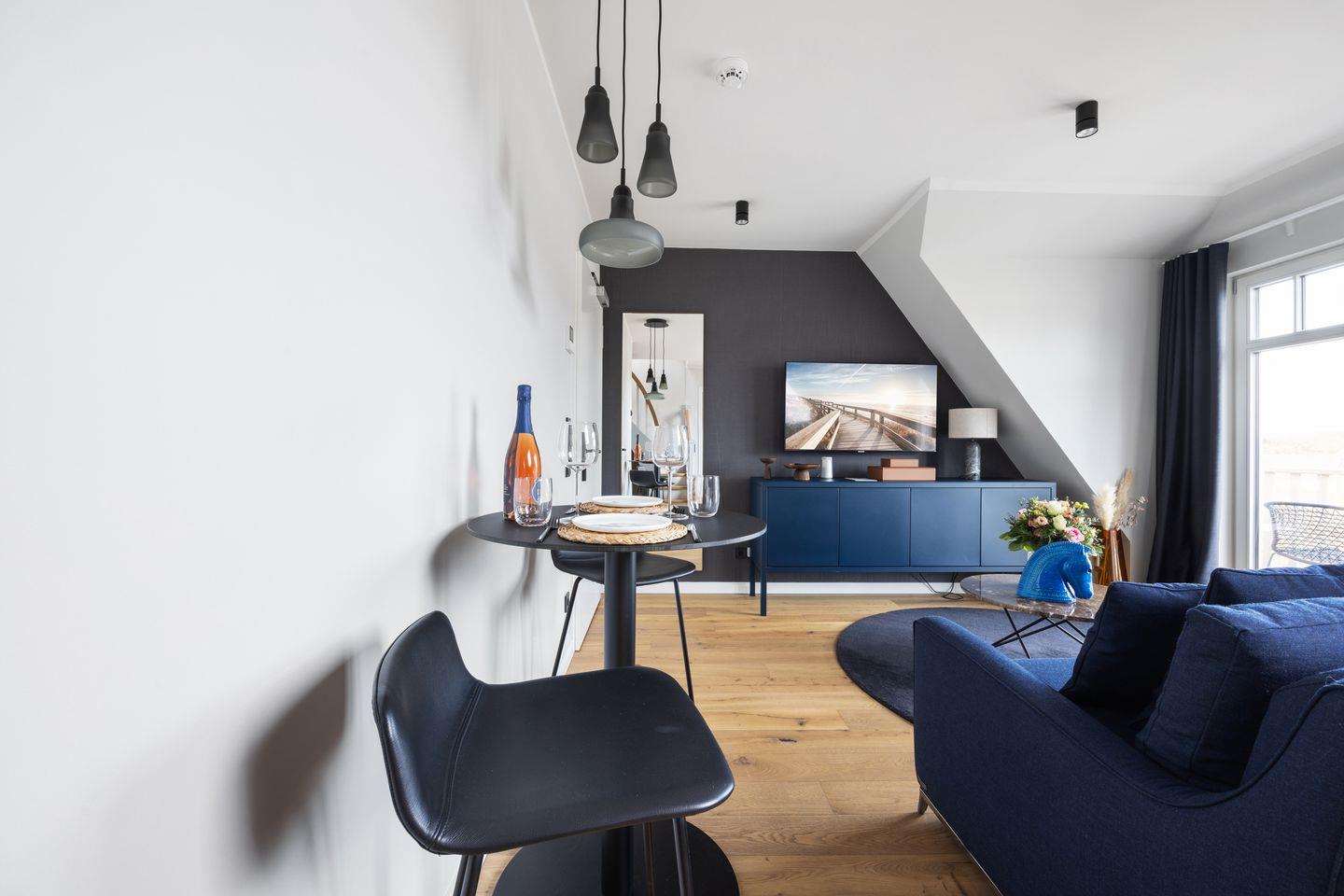 Diese exklusive 2-Zimmer-Maisonettewohnung im Haus „Kliff“ erstreckt sich über zwei Ebenen und bietet auf ca. 71 m² Raum für bis zu drei Personen. Inspiriert von schimmernden Wellen und dem Spiel des Lichts auf den Buhnen, empfängt Sie ein Interieur aus gedeckten Farben, warmen Holztönen und klarer, edler Formsprache – stilvoll, ruhig und zugleich einladend.