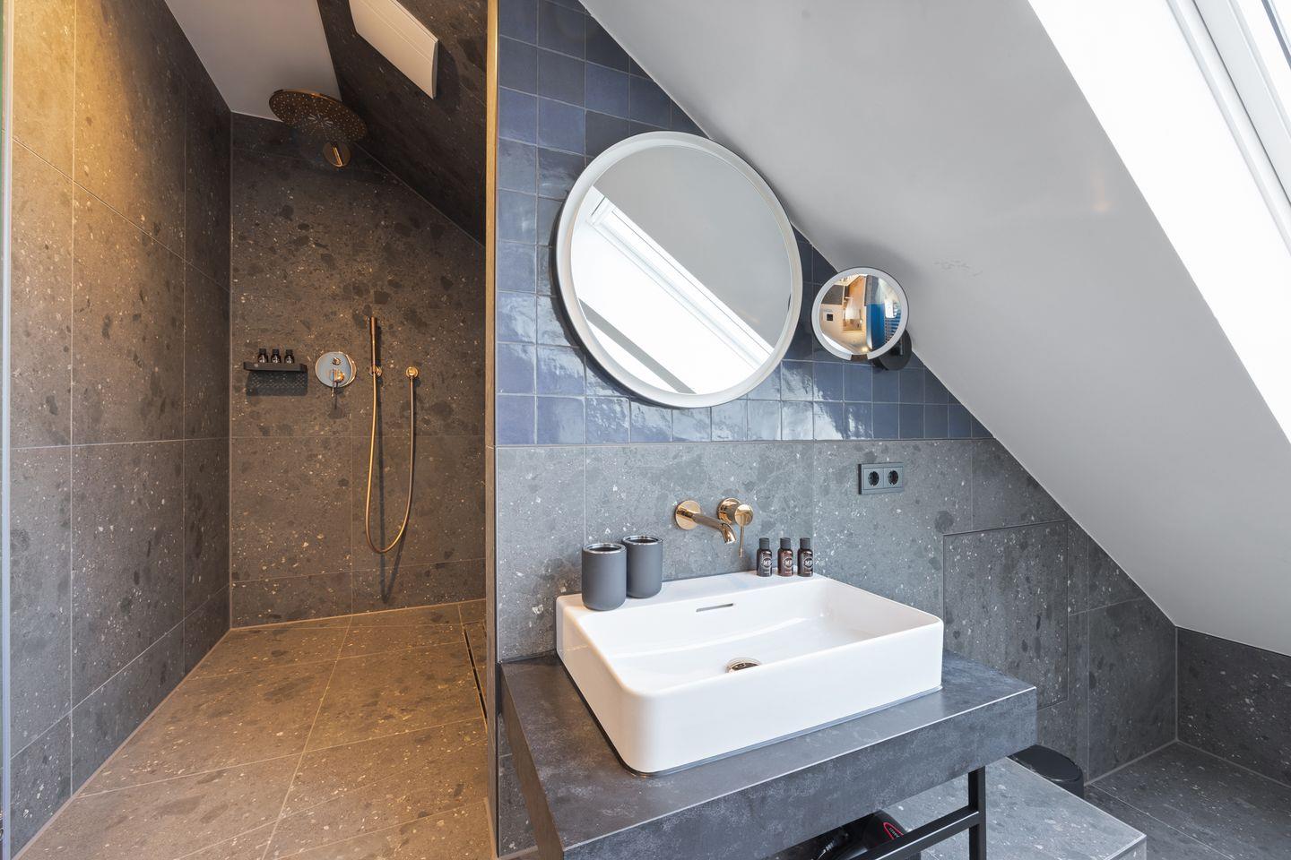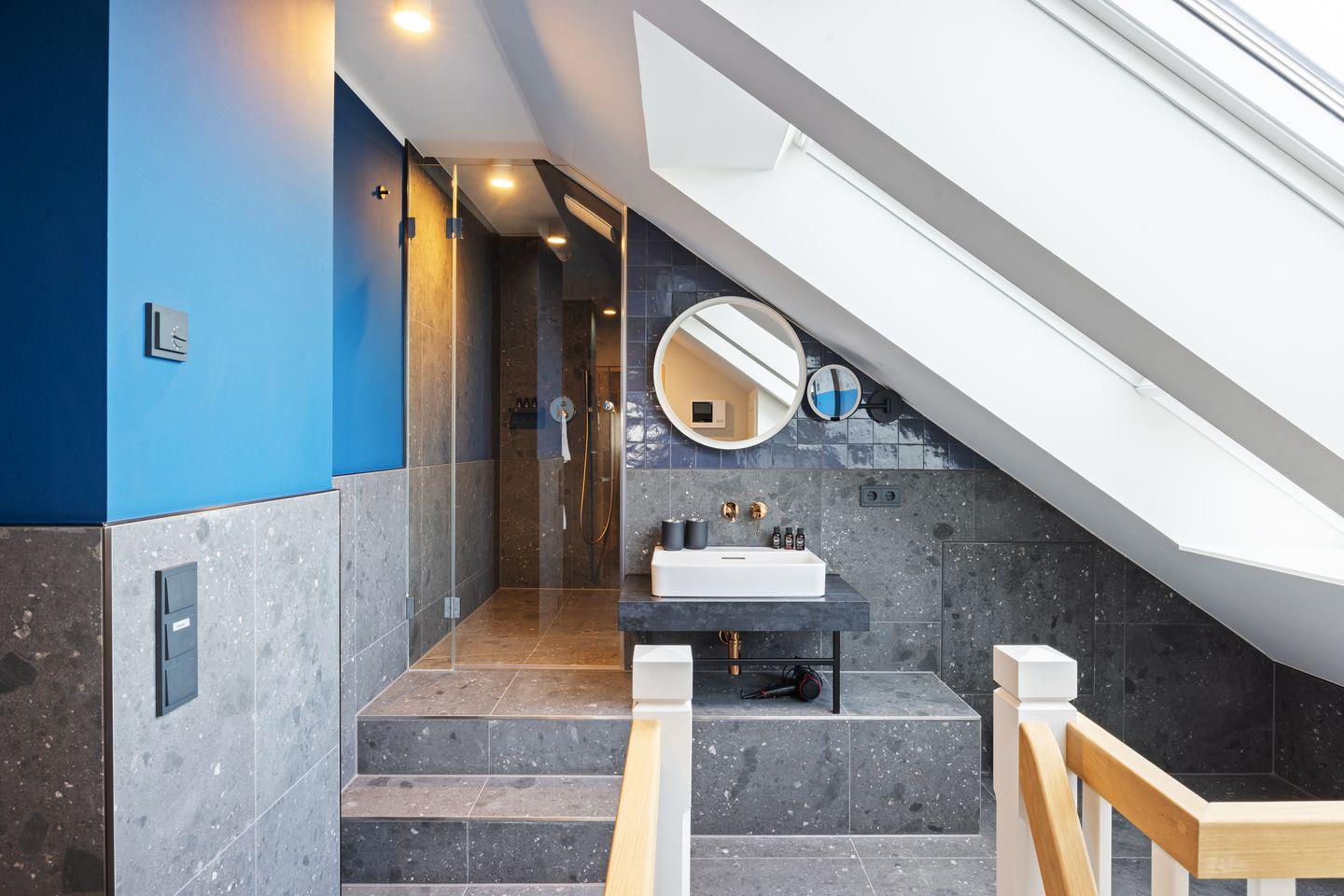 Das offene Badezimmer begeistert mit echtem Wellness-Charakter. Eine großzügige Regendusche, eine private KLAFS-Sauna, ein Handtuchwärmer sowie ein Föhn sorgen für höchsten Komfort. Elektrisch zu öffnende Oberlichter schenken wohltuendes Tageslicht und schaffen eine helle, entspannte Atmosphäre.