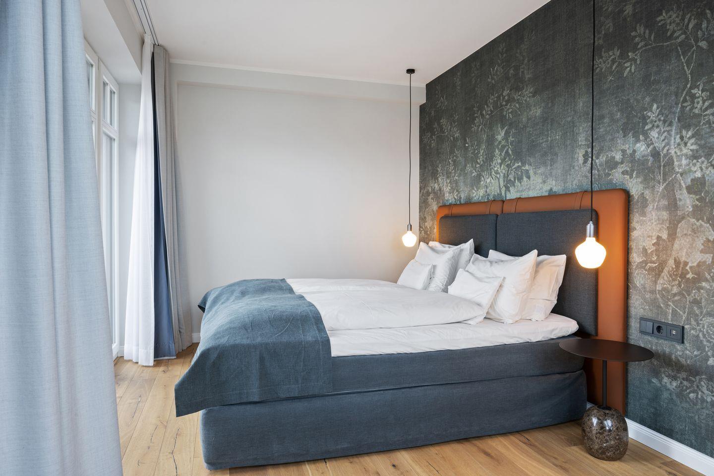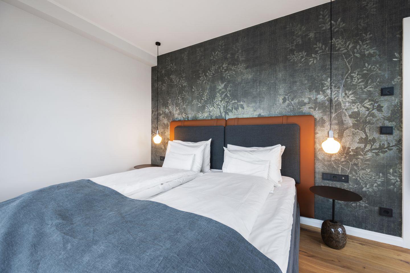Das Schlafzimmer verspricht außergewöhnlichen Komfort. Ein handgefertigtes COCO-MAT Bett (180 x 200 cm) lädt zu erholsamen Nächten ein und schenkt Ihnen tiefen, regenerierenden Schlaf. Ein Kleiderschrank bietet ausreichend Stauraum und rundet das stilvolle Raumkonzept funktional ab.